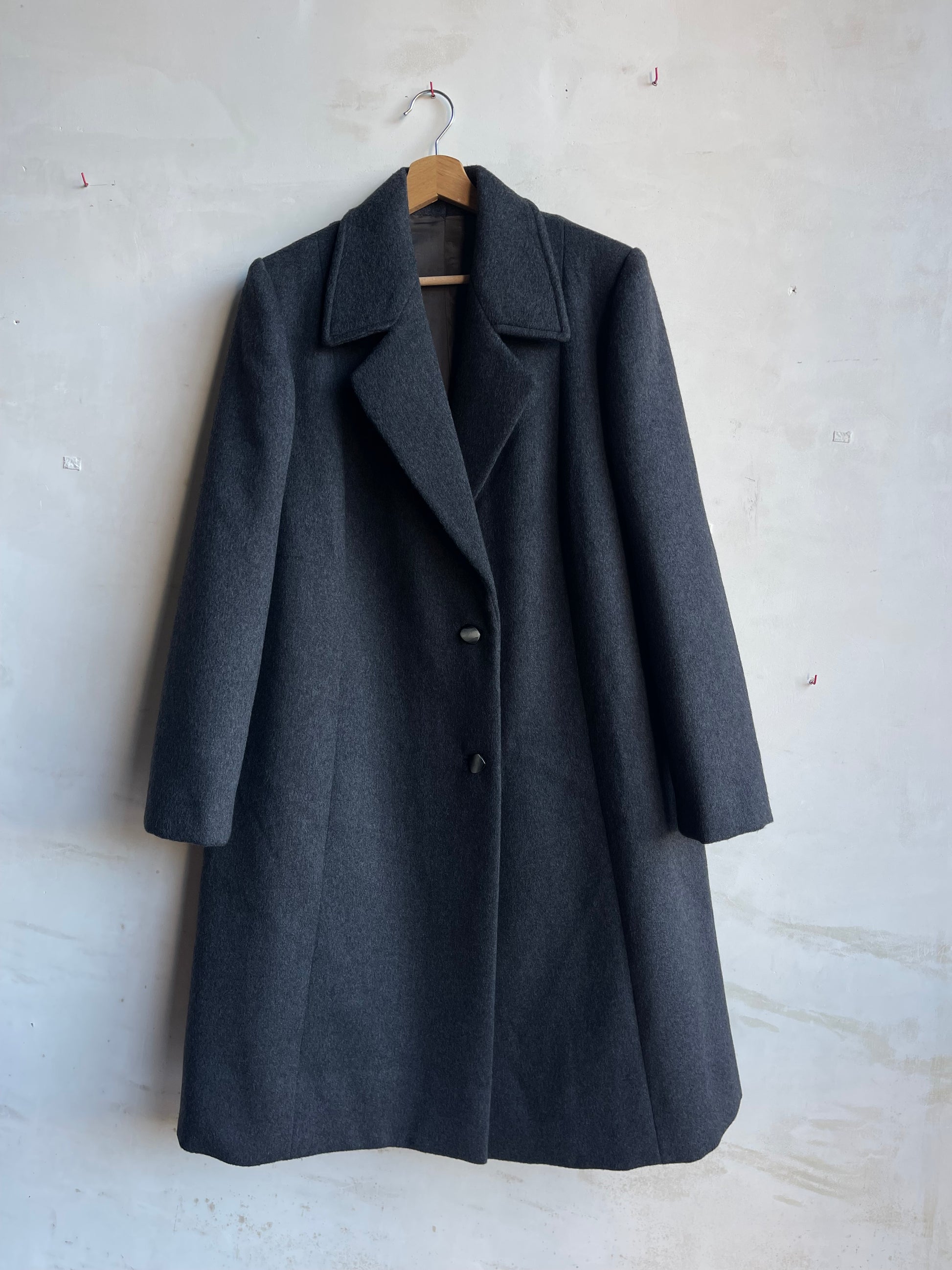 Modello dalla linea pulita, taglio svasato, monopetto con revers classici e lunghezza midi.