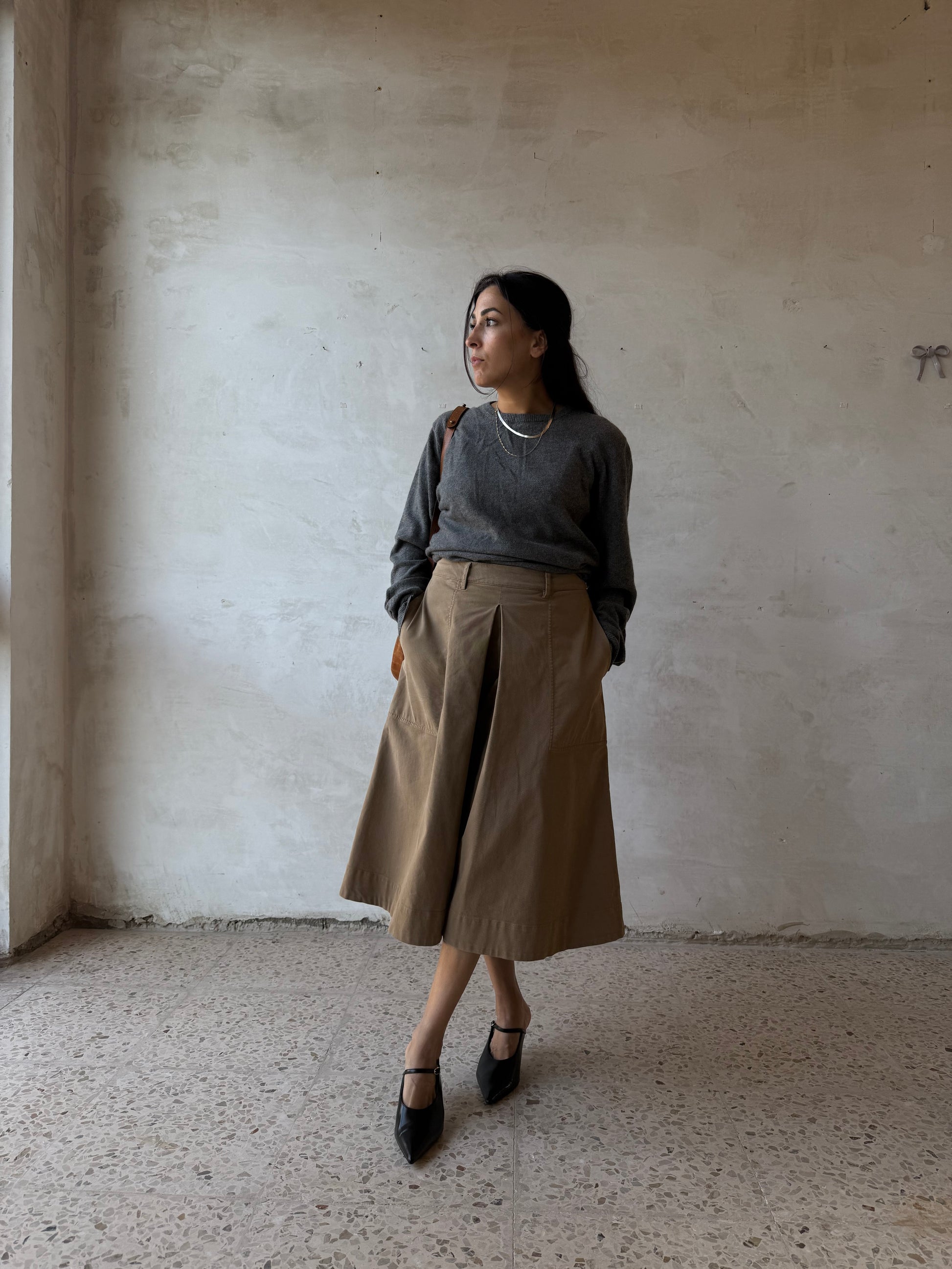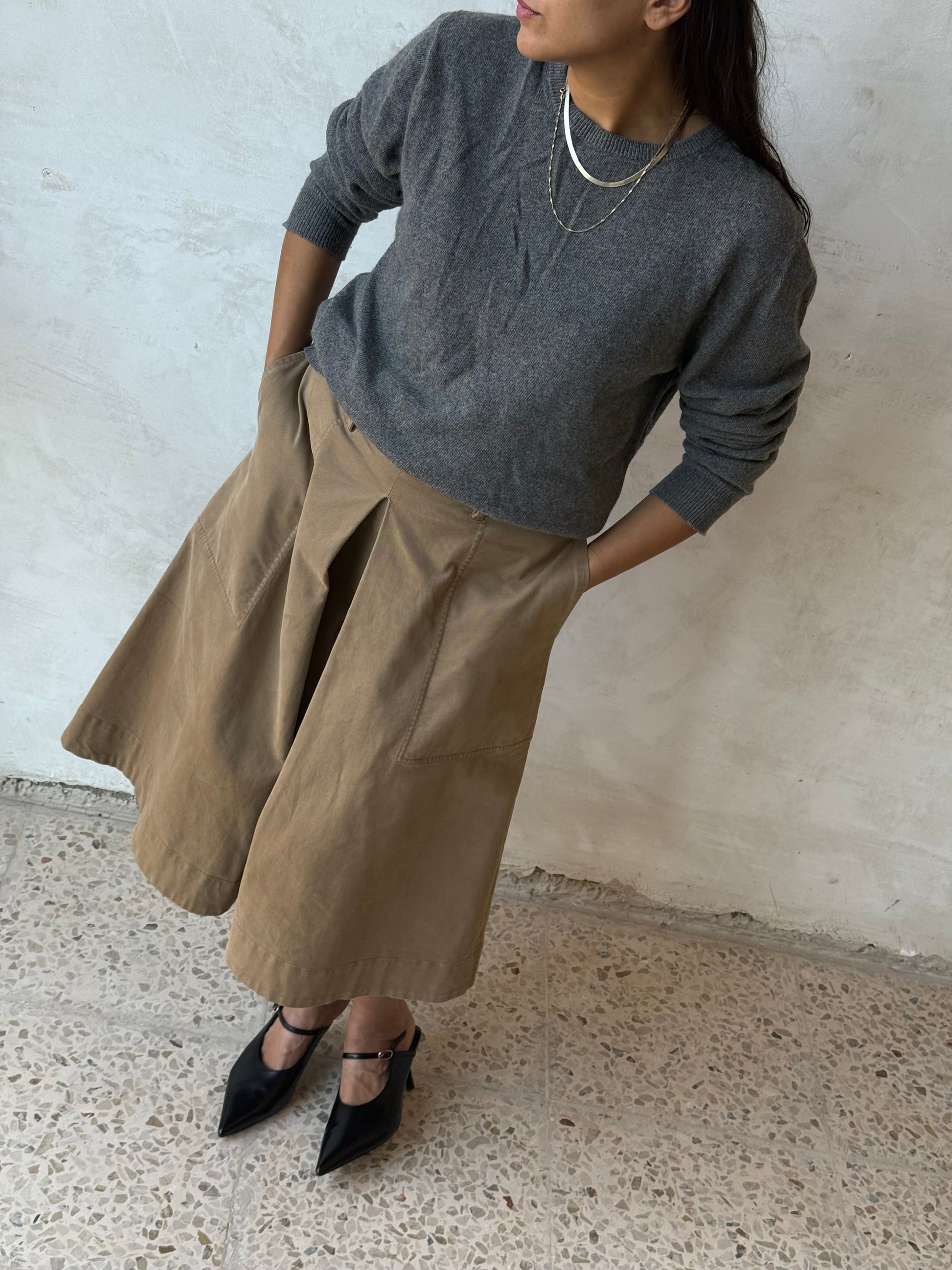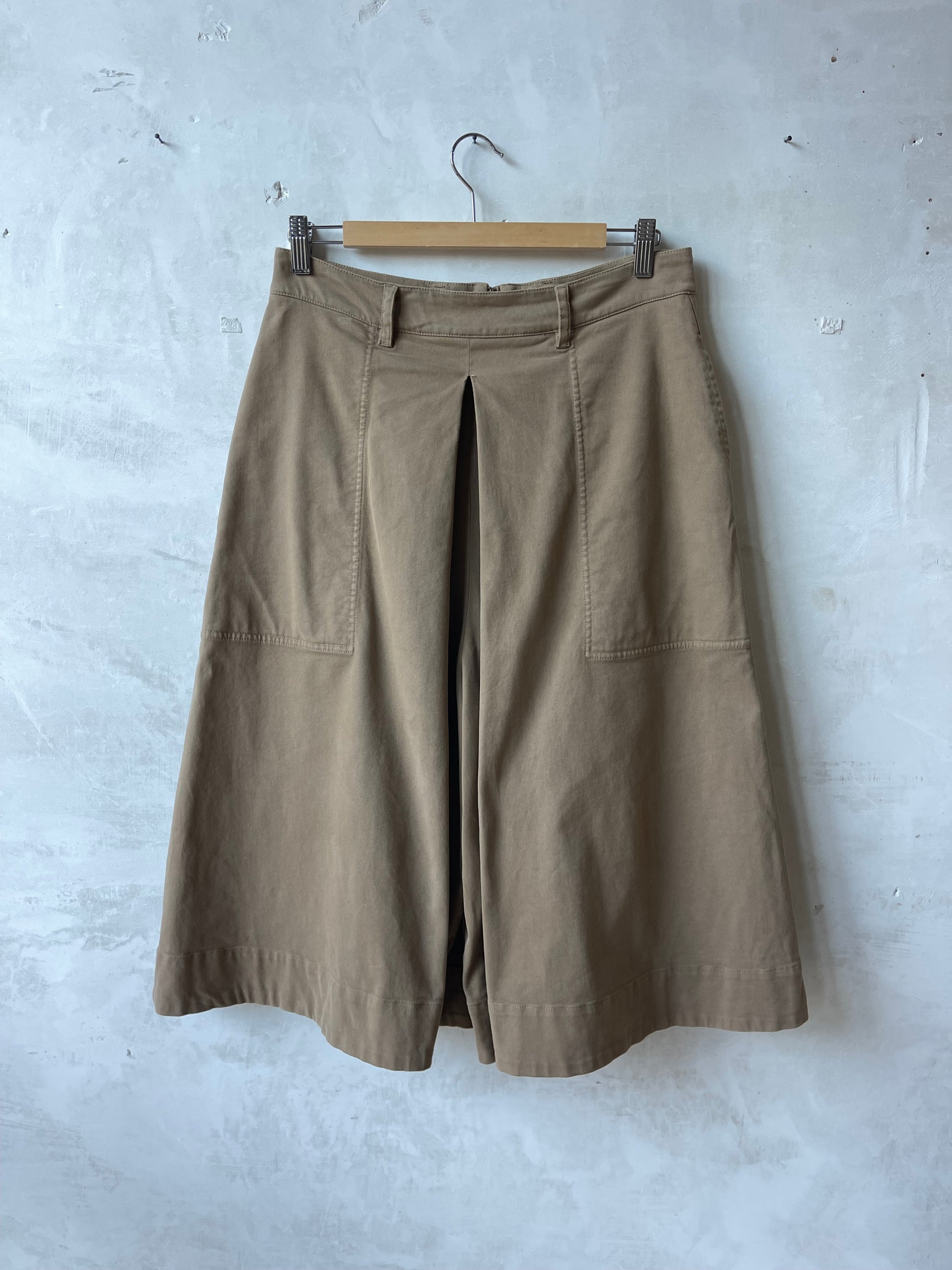 Gonna pantalone Aspesi in cotone, color sabbia. Modello culotte a vita media con cinturini per cintura, piega centrale anteriore che crea volume ampio e movimento, zip e gancio laterale a scomparsa per la chiusura. Tasche a filo laterali, cuciture in tono, lunghezza al polpaccio. Aspesi modello 2234 E729 beige . Linea essenziale, tessuto strutturato ma morbido al tatto.