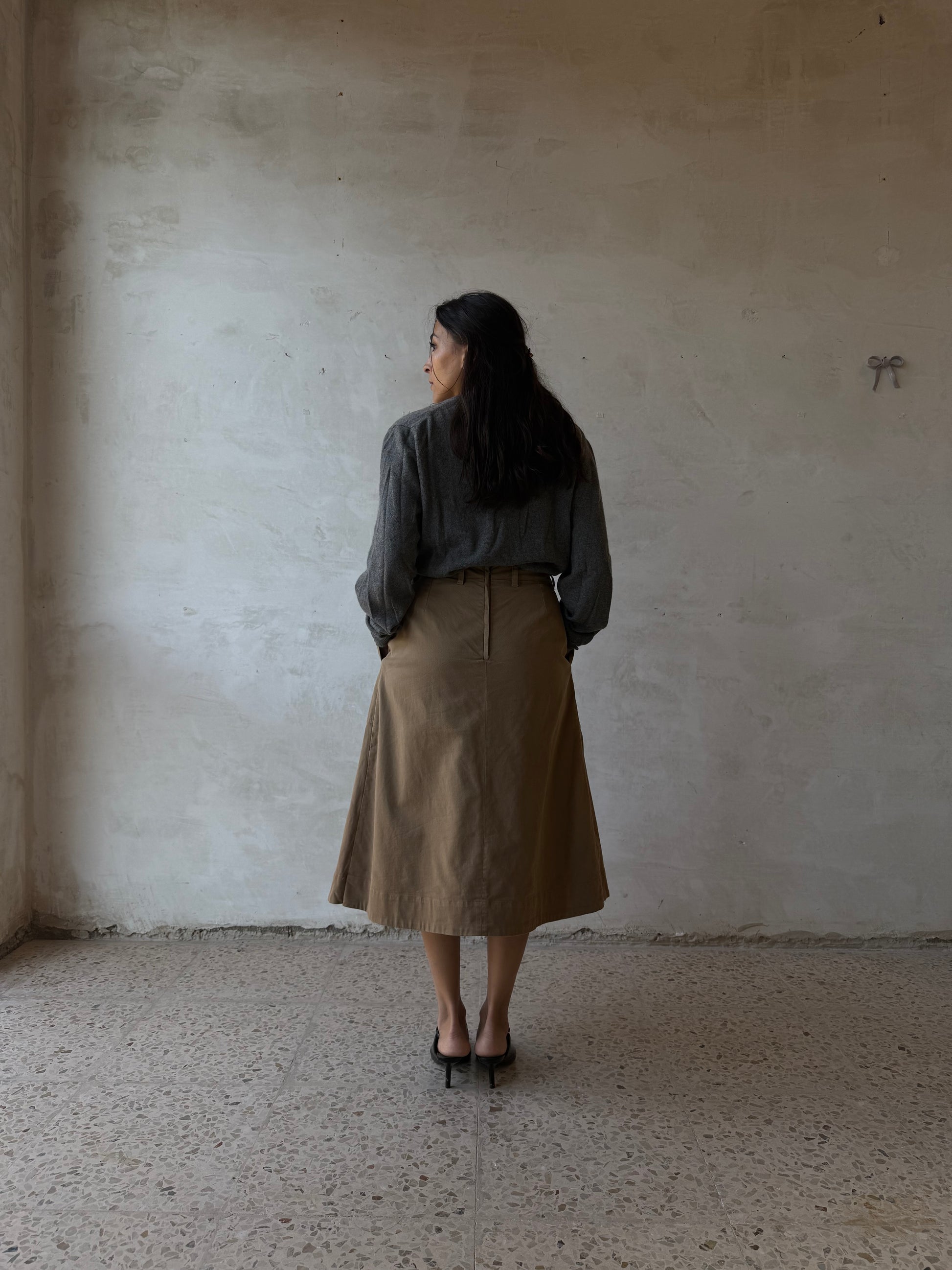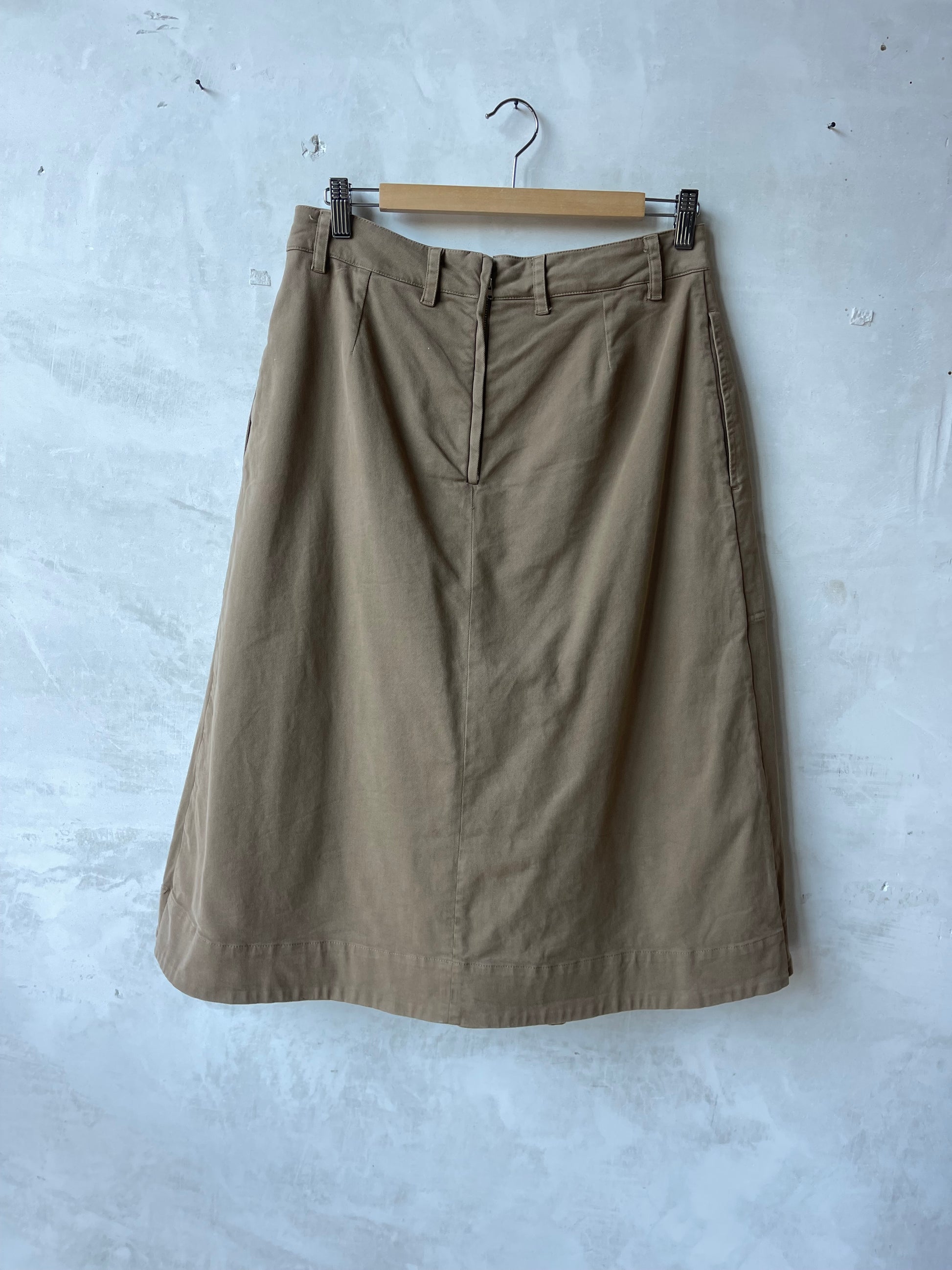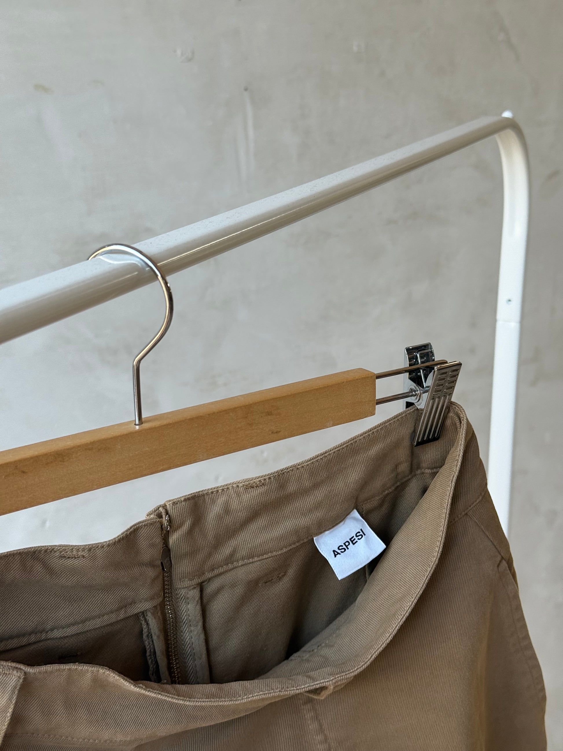Gonna pantalone Aspesi in cotone, color sabbia. Modello culotte a vita media con cinturini per cintura, piega centrale anteriore che crea volume ampio e movimento, zip e gancio laterale a scomparsa per la chiusura. Tasche a filo laterali, cuciture in tono, lunghezza al polpaccio. Aspesi modello 2234 E729 beige . Linea essenziale, tessuto strutturato ma morbido al tatto.