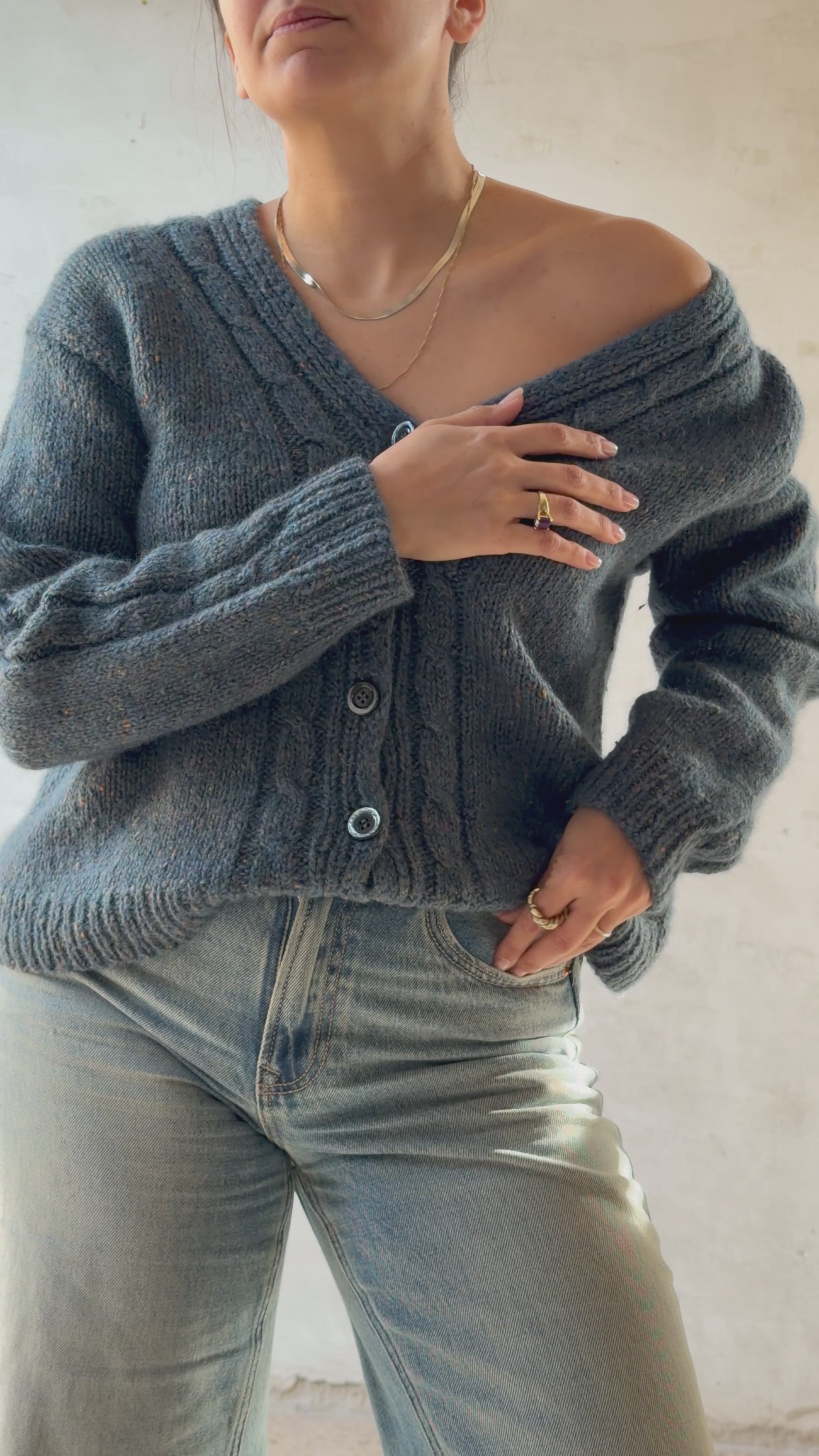 Cardigan vintage senza etichetta, realizzato a mano. Lavorazione a maglia con punto compatto e regolare, caratterizzata da una mano corposa ma morbida. Colore con leggere variazioni cromatiche tipiche del filato artigianale. Scollo a V, chiusura frontale con bottoni, finiture a coste su scollo, polsi e fondo. Spalle scese che accompagnano la linea delle spalle senza creare rigidità, rendendo la vestibilità più naturale e adattabile alla figura. Lunghezza leggermente cropped.