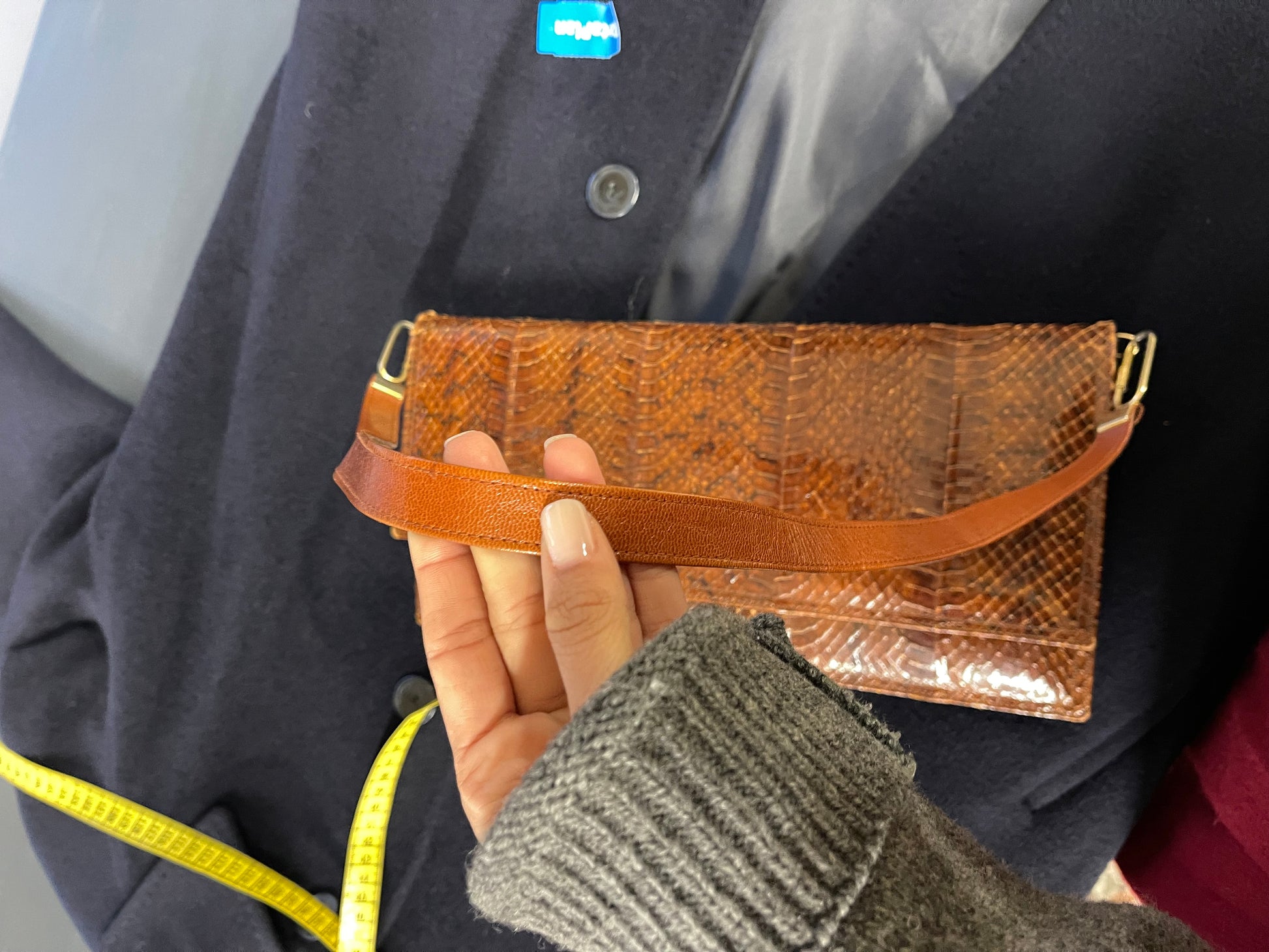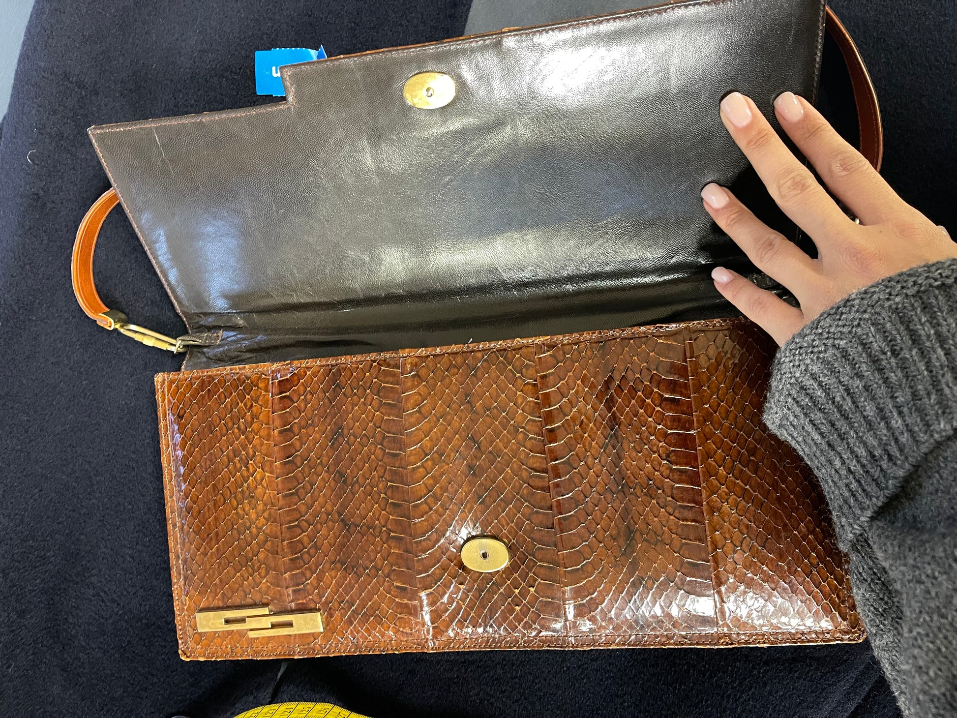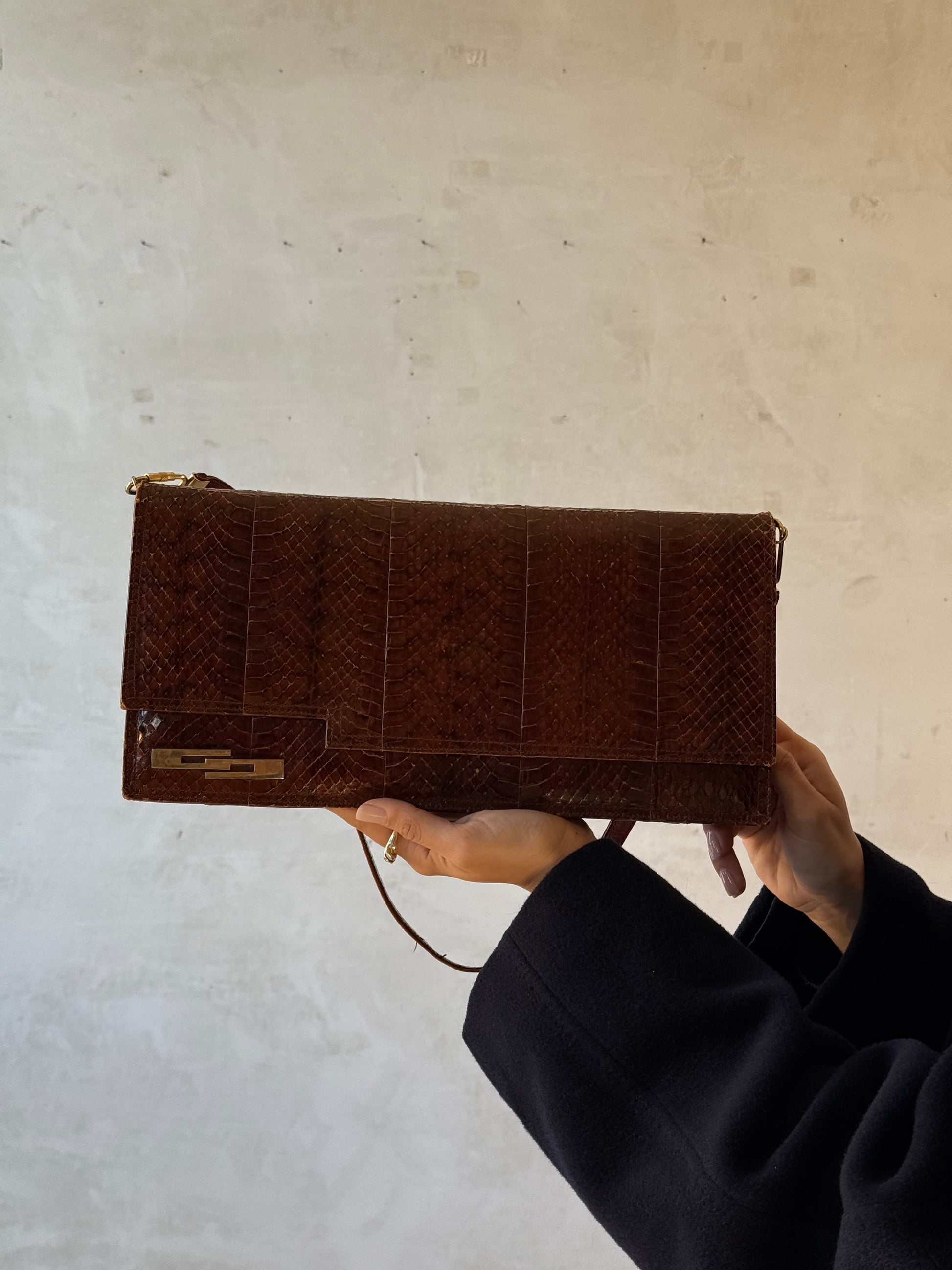 Borsa vintage in pelle di rettile, struttura rigida e forma allungata. Pelle marrone con lavorazione a squame regolari, superficie lucida con naturale patina del tempo. Chiusura con bottone a pressione, dettaglio metallico frontale dorato.