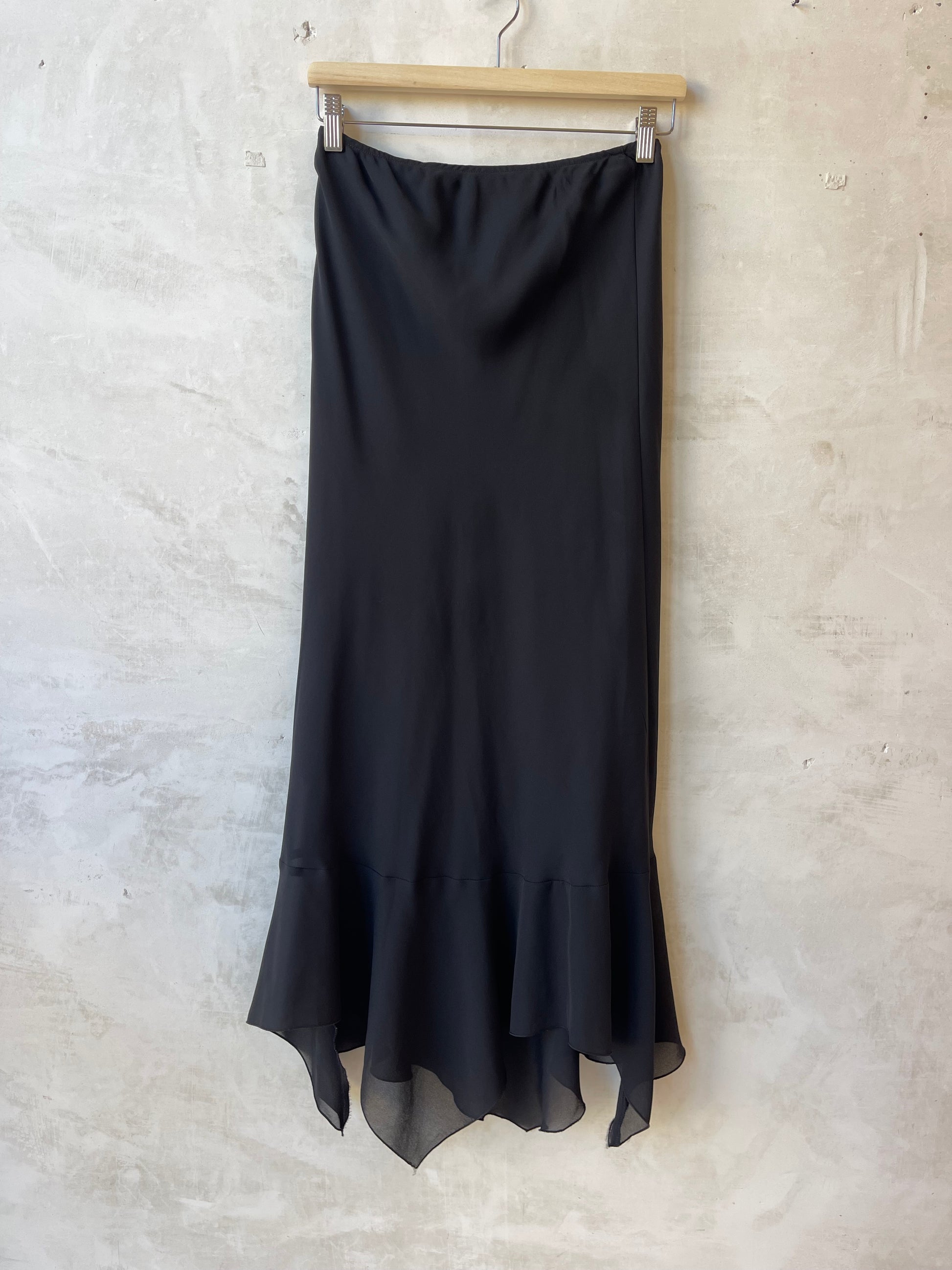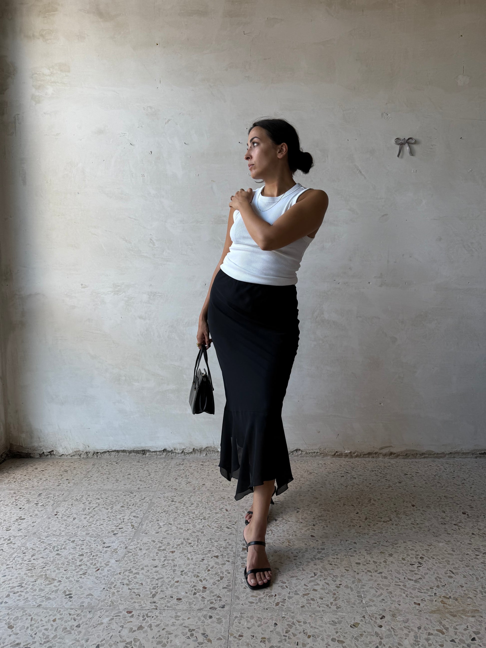 Gonna lunga in chiffon nero, con linea aderente ma non fasciante. Balza finale asimmetrica con orlo. Grazie all’elastico in vita si adatta a più taglie.