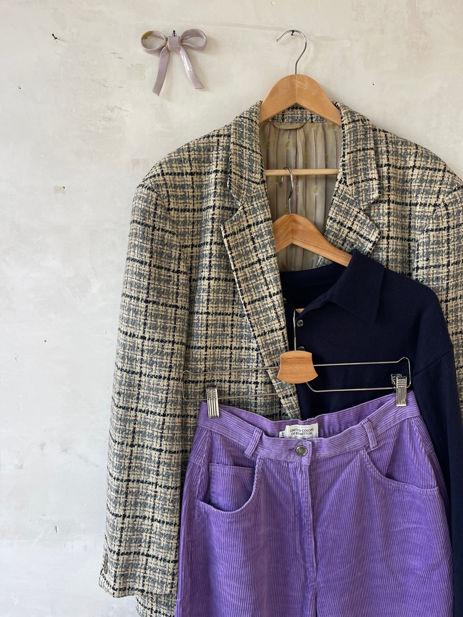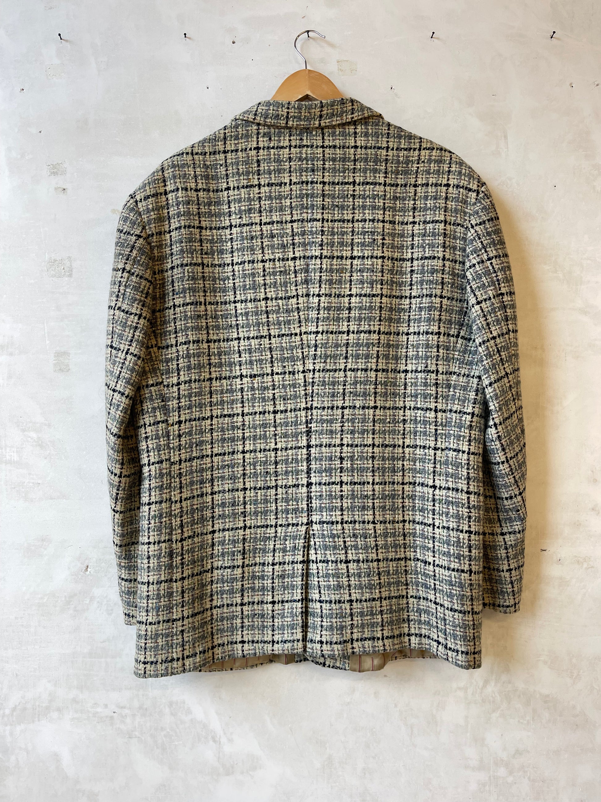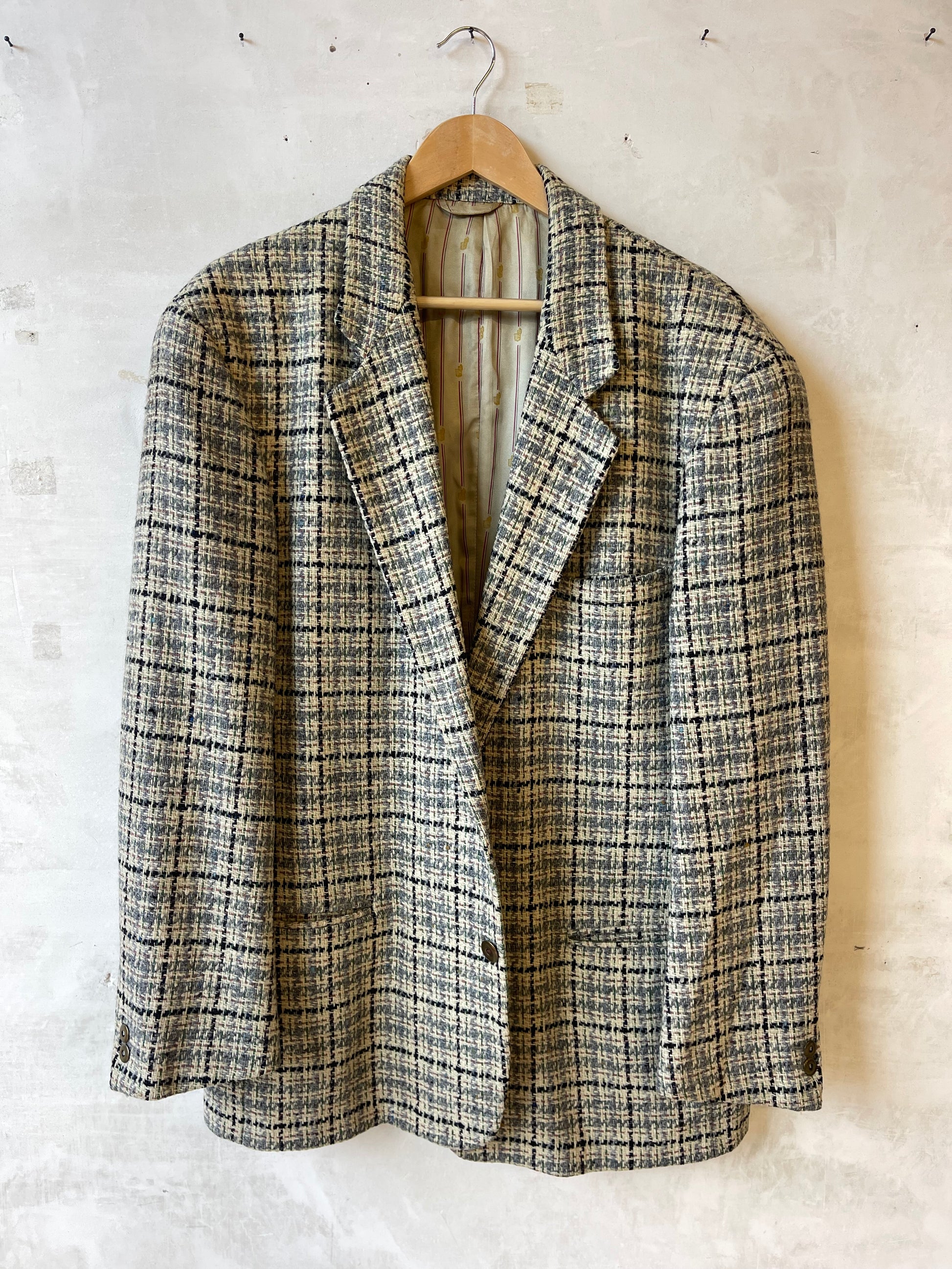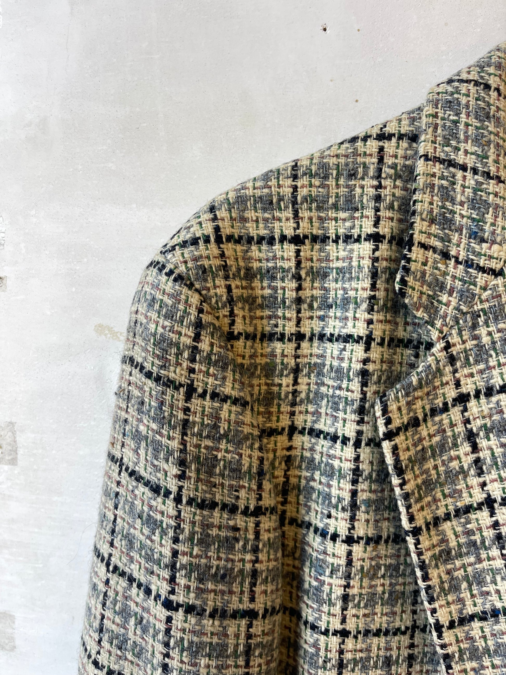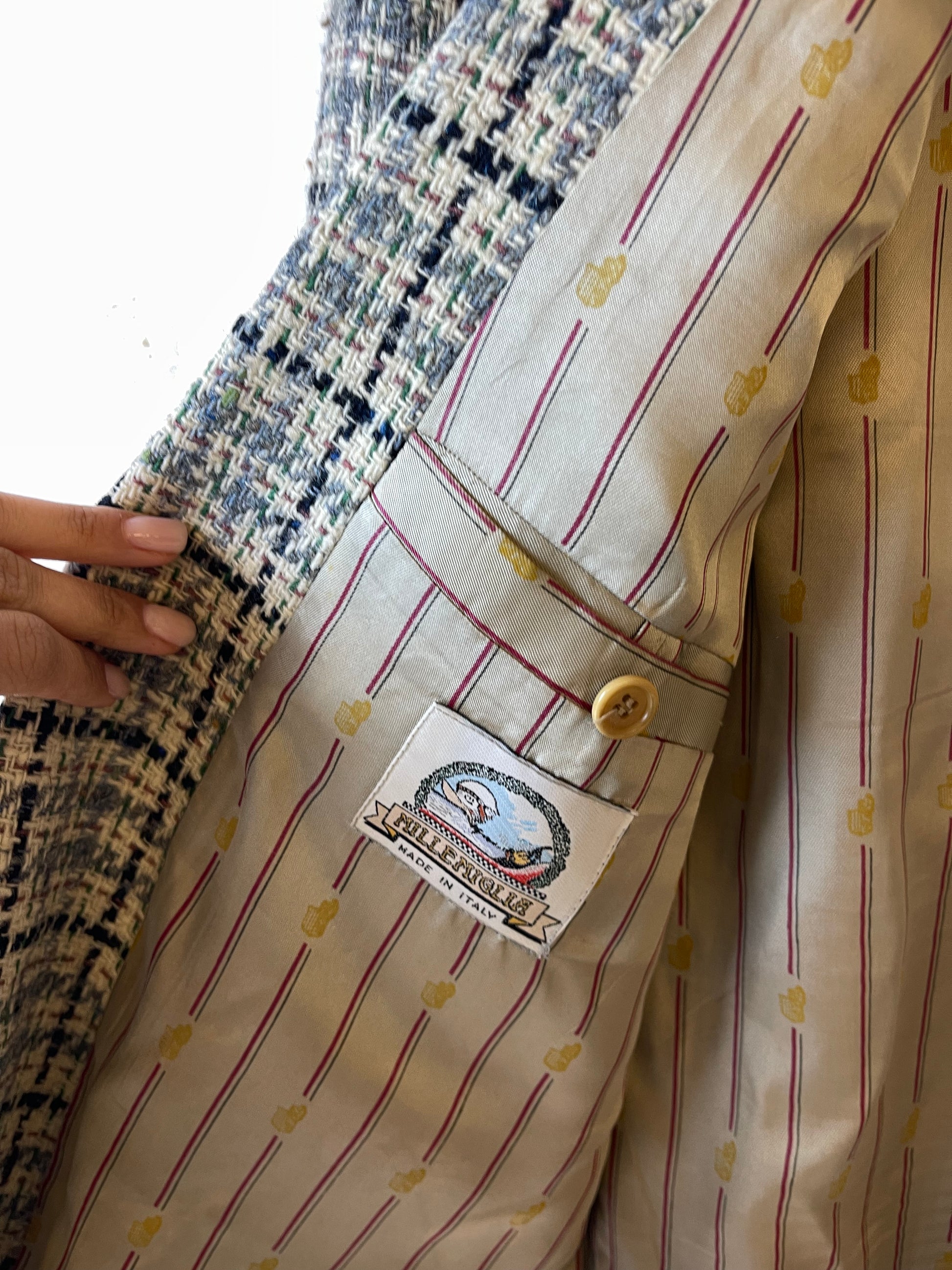 Blazer vintage realizzato in 100% lana vergine, tessuto strutturato ma morbido, con trama tweed, fondo beige e righe blu, rosa, verdi e azzurre.