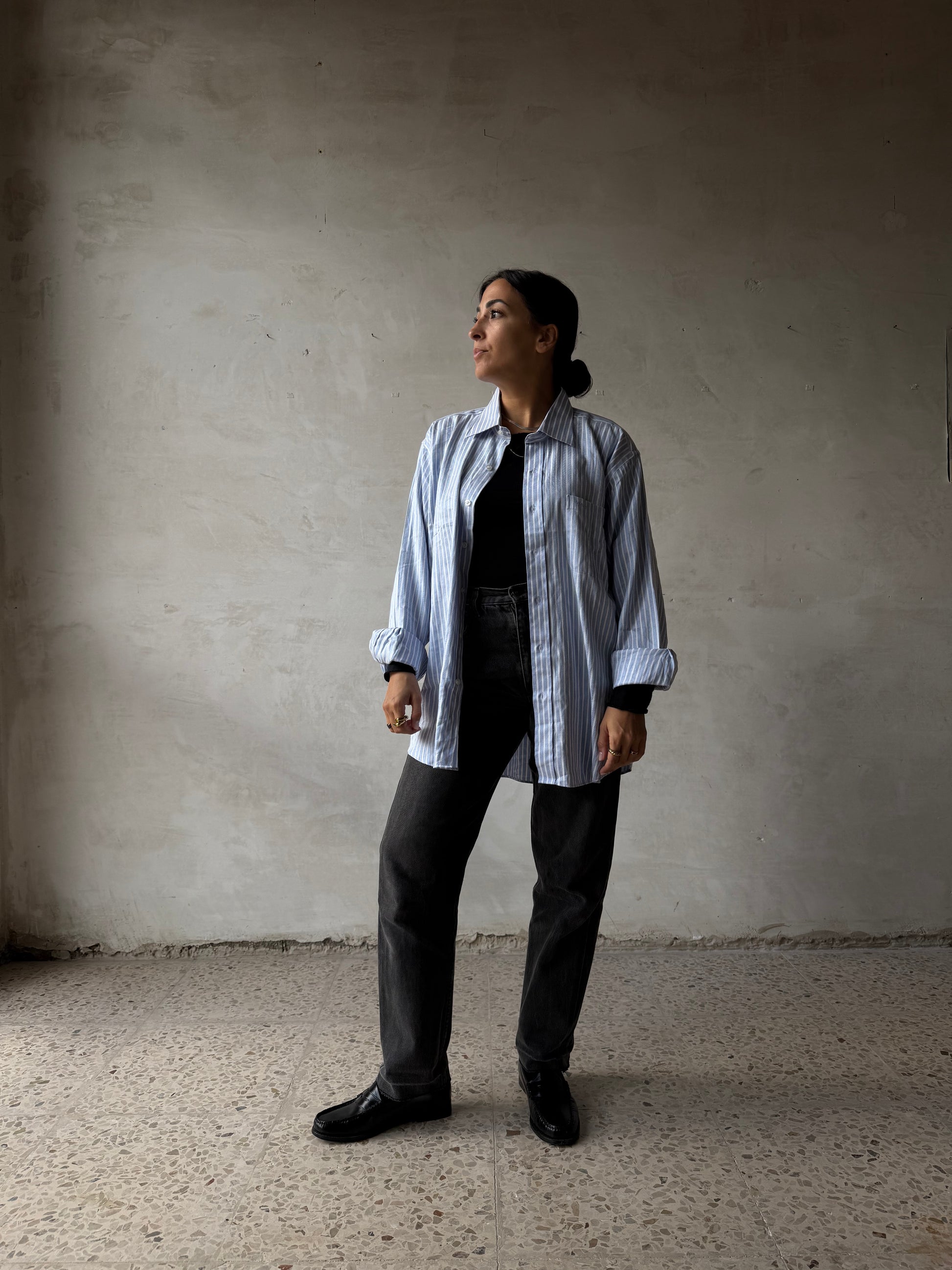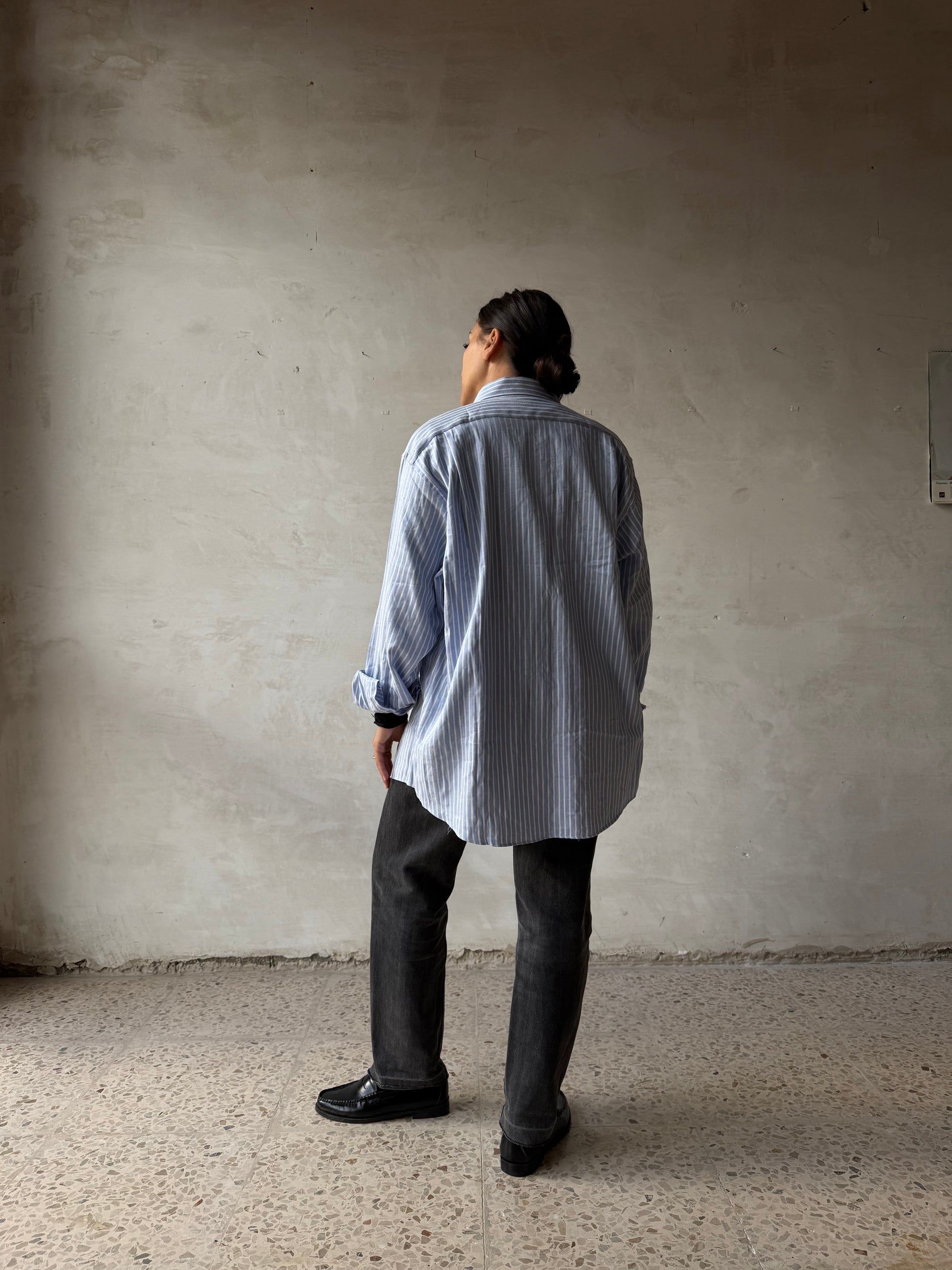Camicia in cotone azzurro a righe bianche, modello sartoriale Boss. Colletto classico, manica lunga con polsino abbottonato, taschino sul petto. Carré posteriore con righe orizzontali a contrasto rispetto al corpo e alle maniche. Linea morbida e vestibilità ampia.