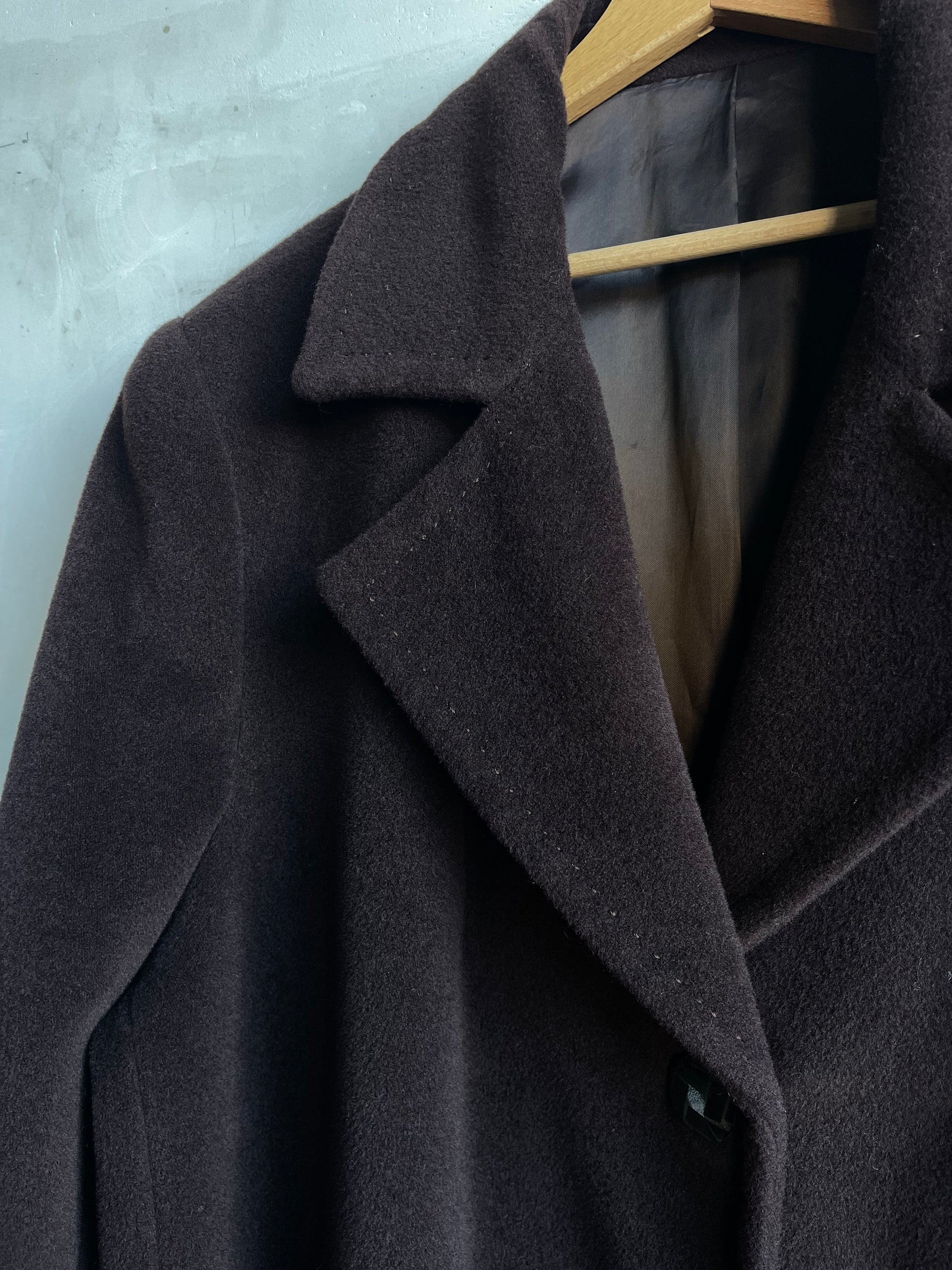 Il tessuto ha una mano piena e calda, tipica dei cappotti sartoriali anni passati. I punti visibili sul rever sono parte delle cuciture di struttura, dettaglio comune nei capi d’epoca e che non incide sulla resa indossata.