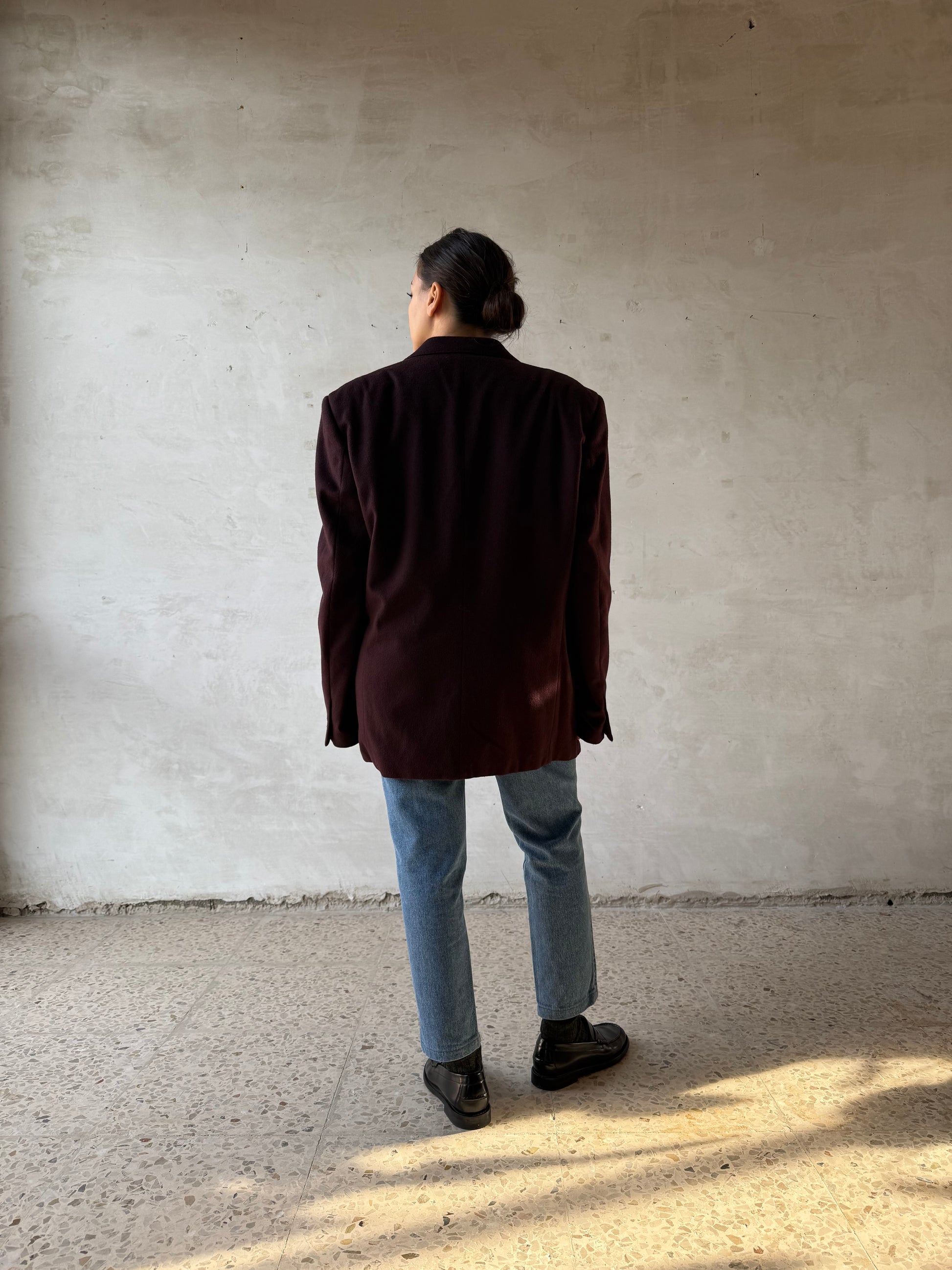 Blazer sartoriale in lana 90% e cashmere 10%, colore borgogna profondo. Linea dritta, monopetto con rever classico e taschino sul petto. Tasche frontali a filetto, interno completamente foderato tono su tono.