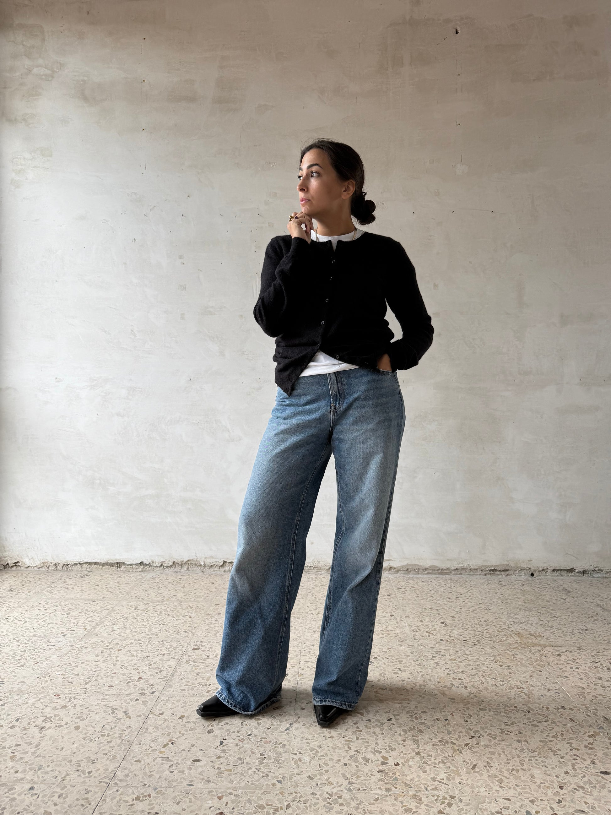 Cardigan a maniche lunghe in filato angora blend, colore nero pieno. Linea dritta, scollo tondo e chiusura frontale con bottoni neri tono su tono. Maglia morbida, leggermente pelosa al tatto, tipica delle mischie con angora. Bordini lavorati a costina su polsi e fondo.
