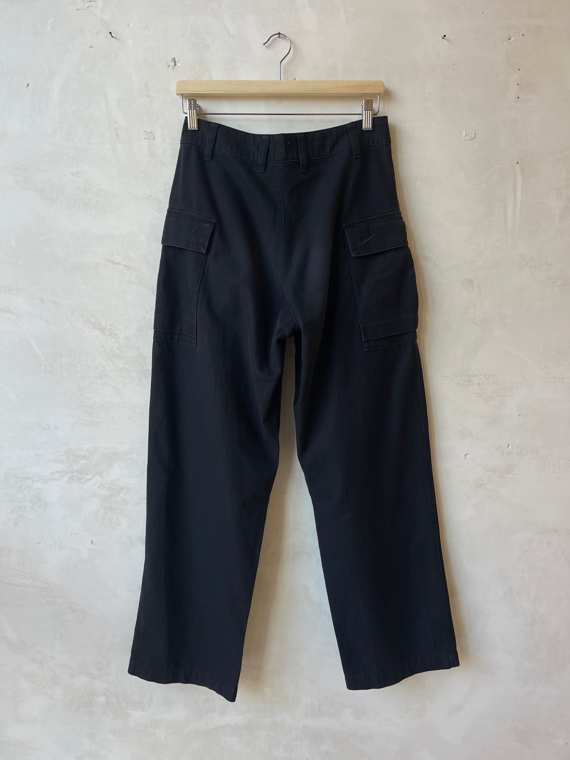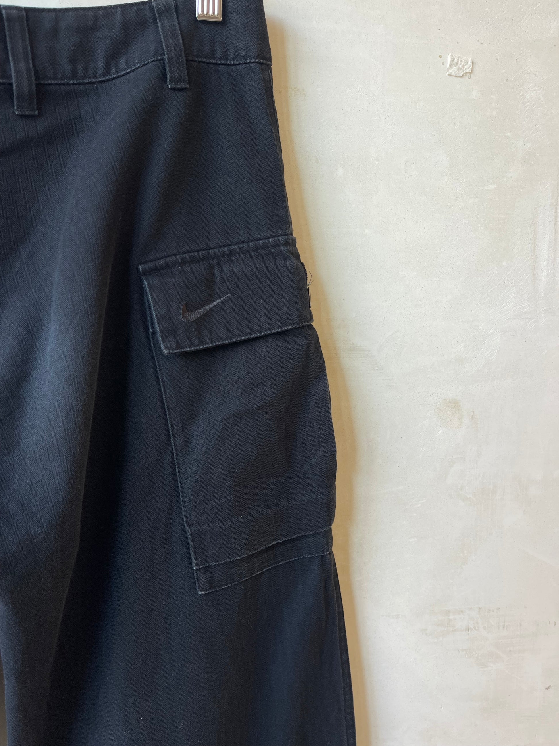 Pantalone cargo Nike in cotone nero. Modello regular fit con vita media, passanti per cintura, chiusura a bottone e zip. Presenta due grandi tasche applicate con pattina e bottone laterale su ciascuna gamba, arricchite da piccolo logo swoosh tono su tono.
