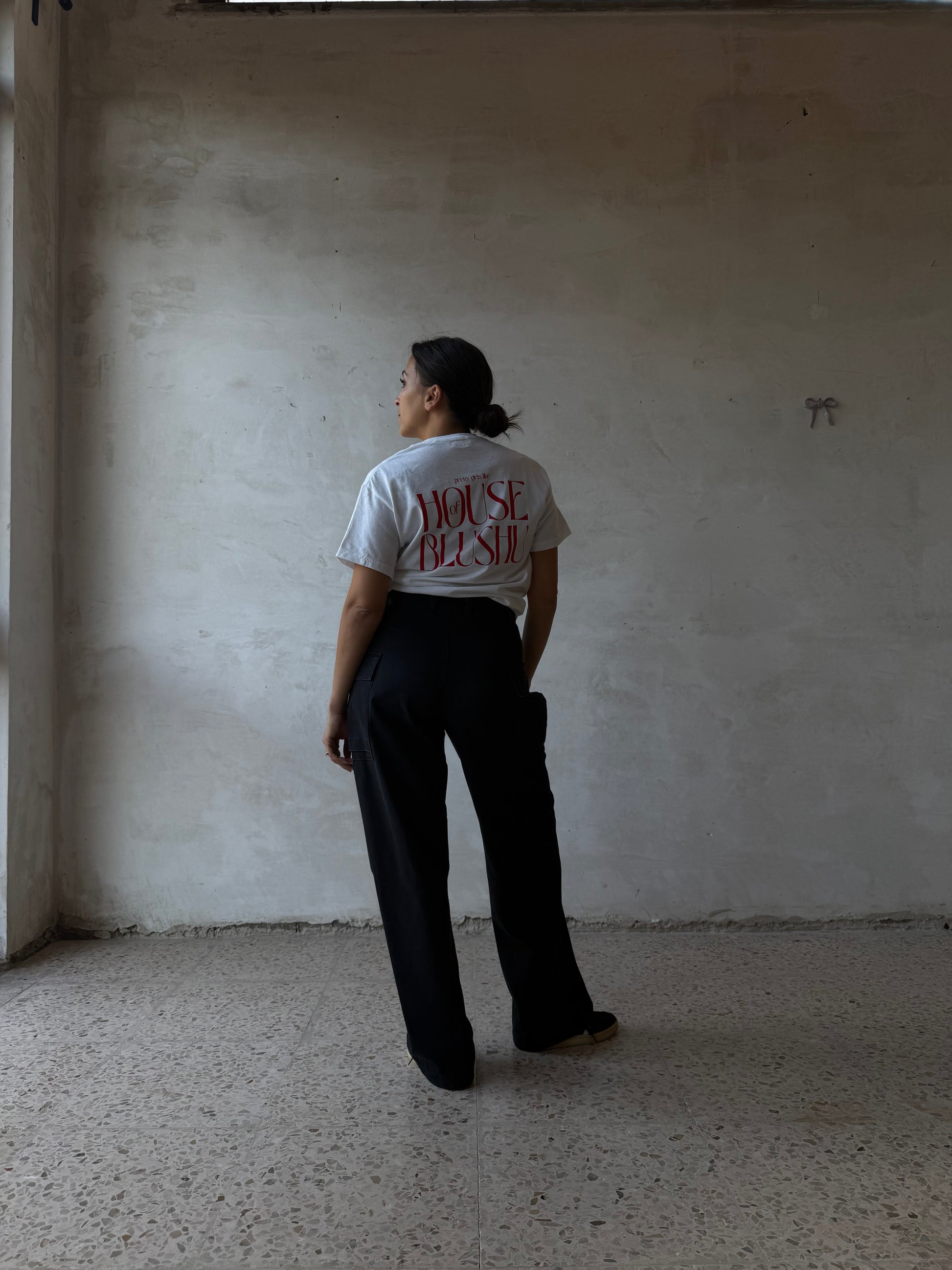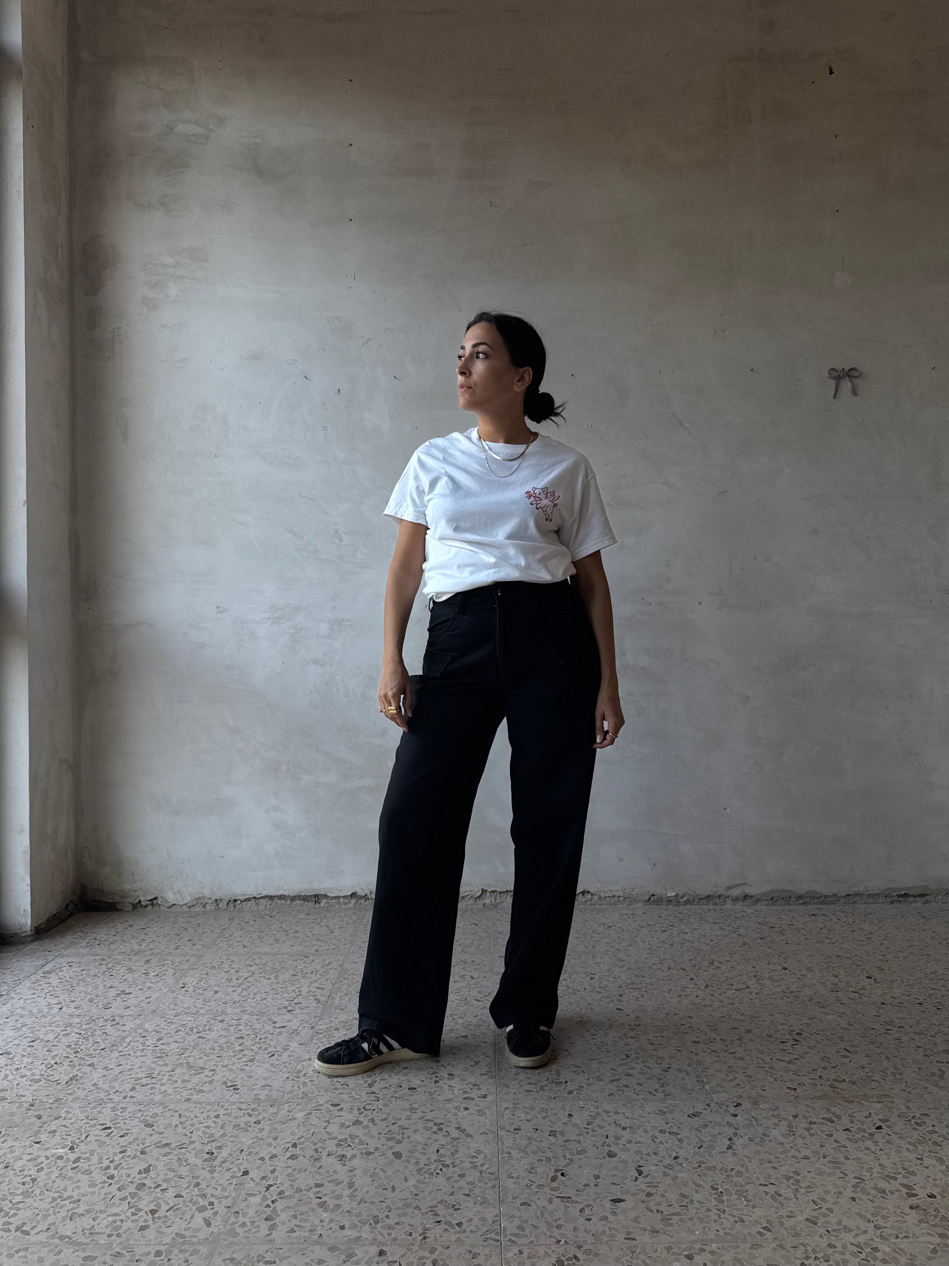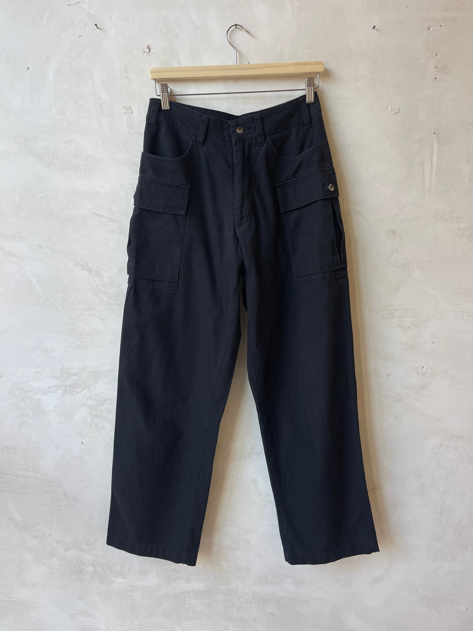 Linea dritta e leggermente ampia, fondo regolare non elasticizzato. Tasca posteriore a filetto, cuciture a vista robuste lungo tutta la struttura. È leggermente slavato non ho usato la coloreria per rinvigorire il nero perché a me piace così!