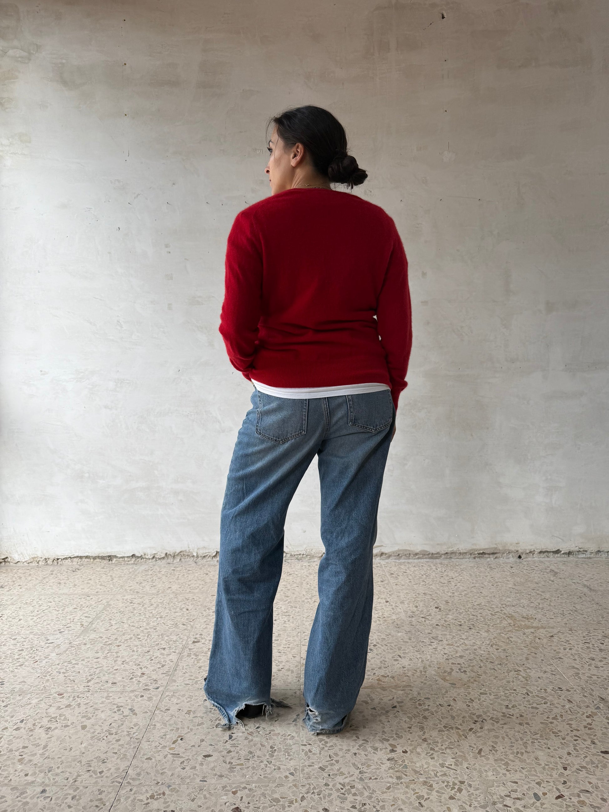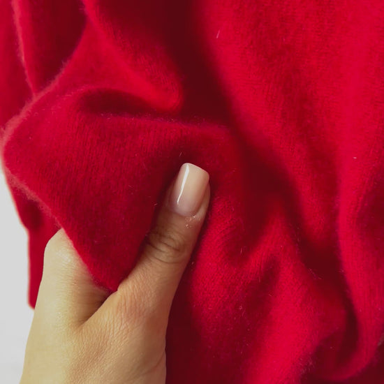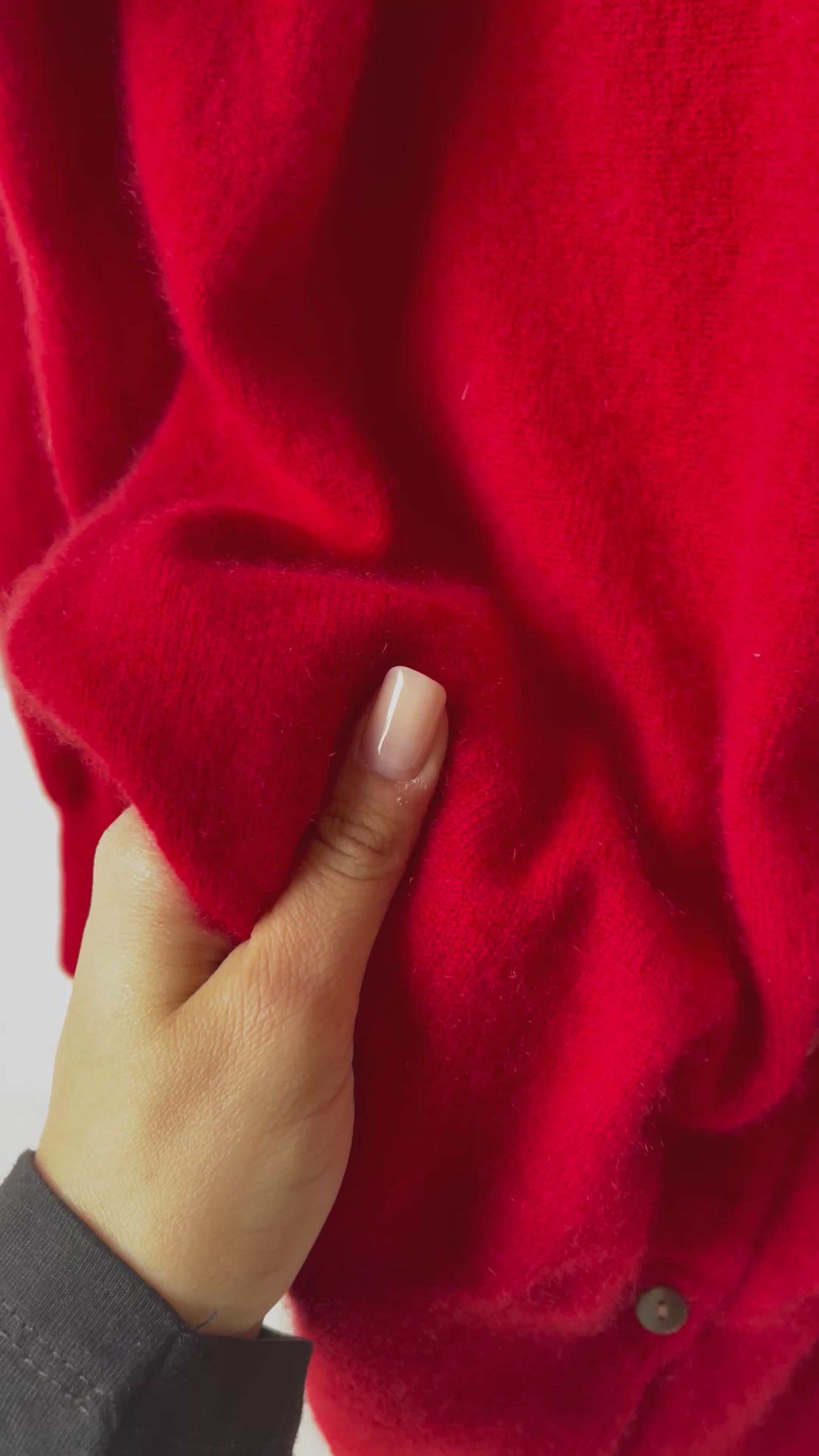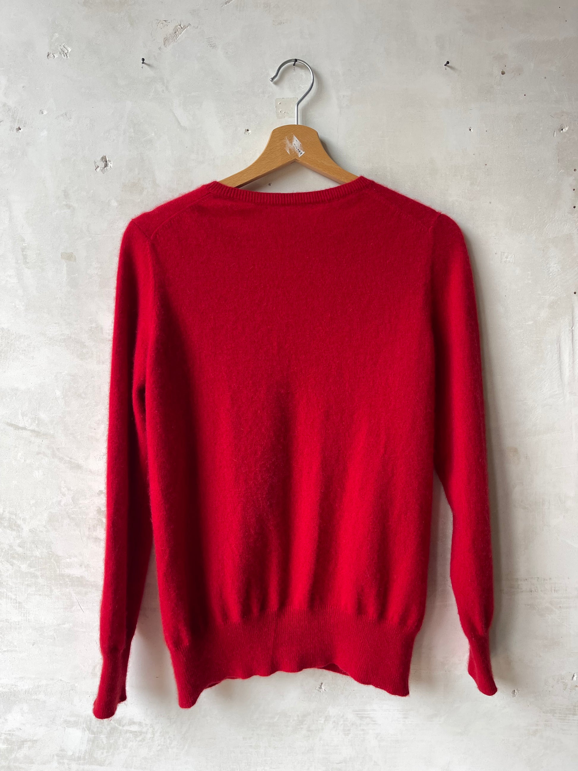 Cardigan rosso in cashmere puro, leggero ma caldo, con linea essenziale e collo tondo. Chiusura frontale con piccoli bottoni, manica lunga e finitura a costine su polsini e fondo.