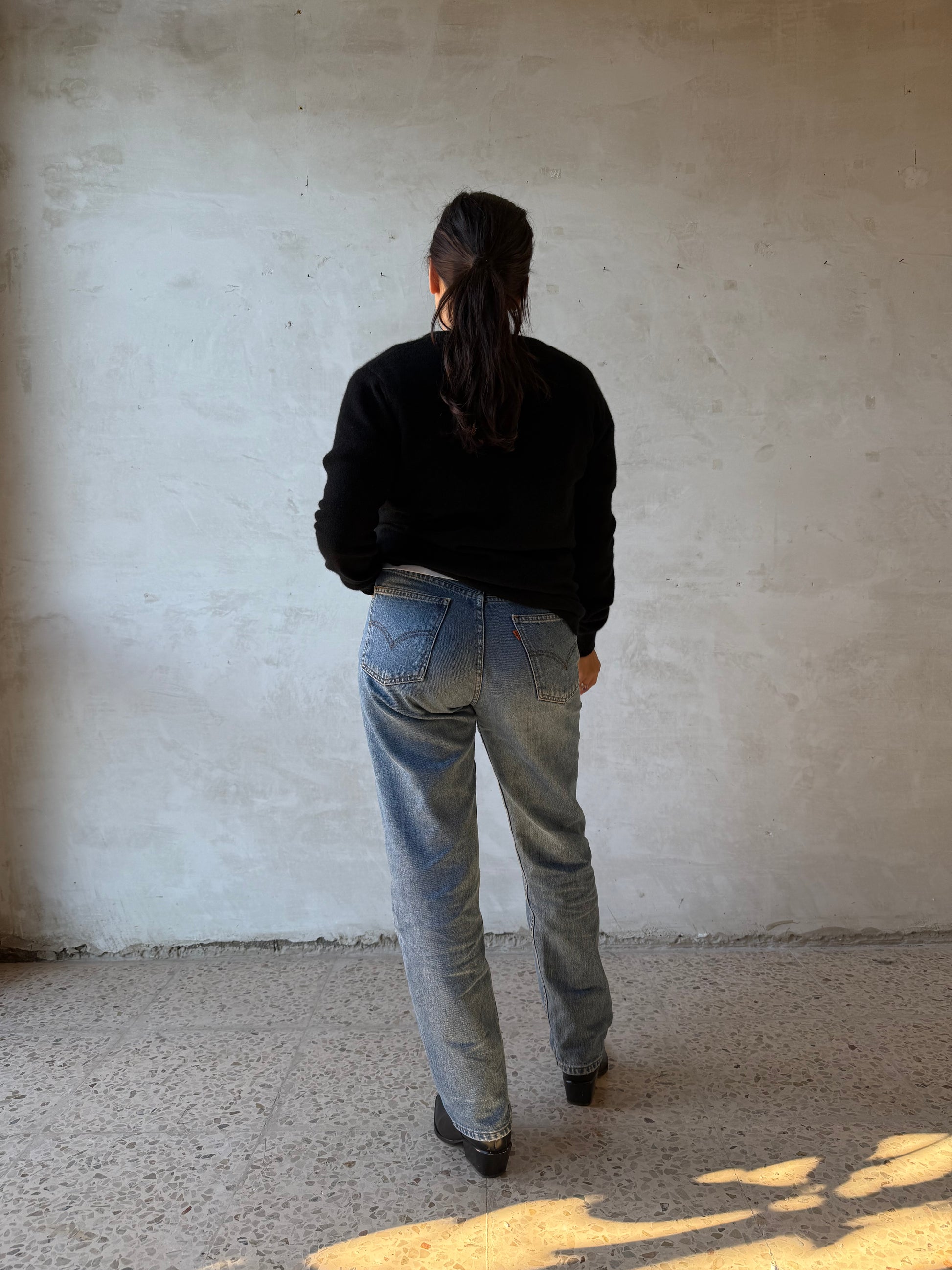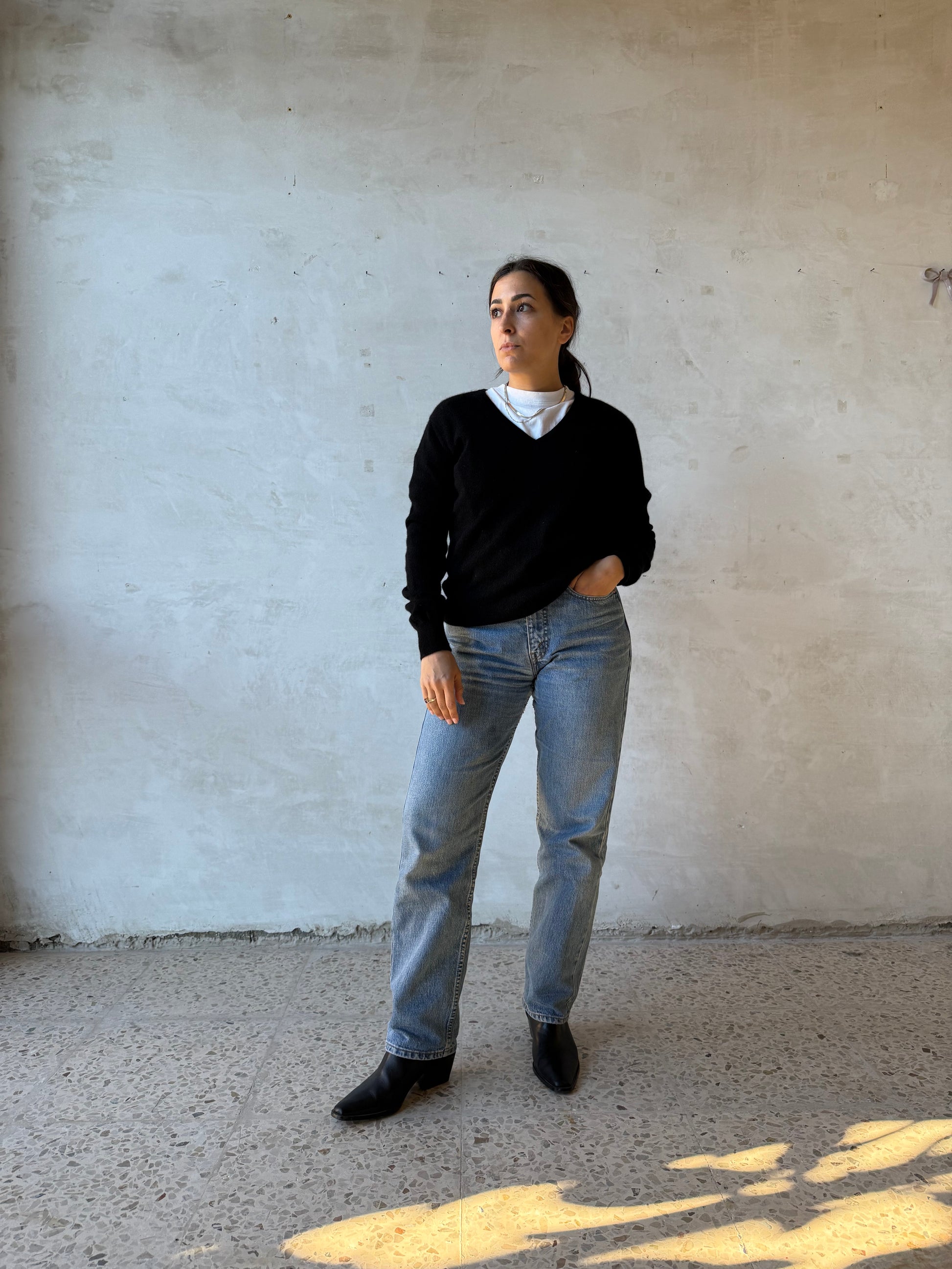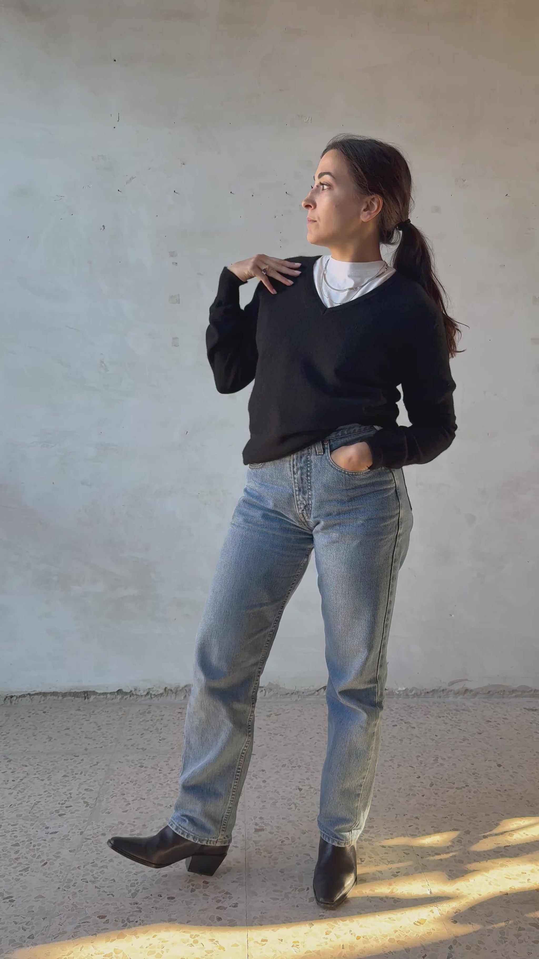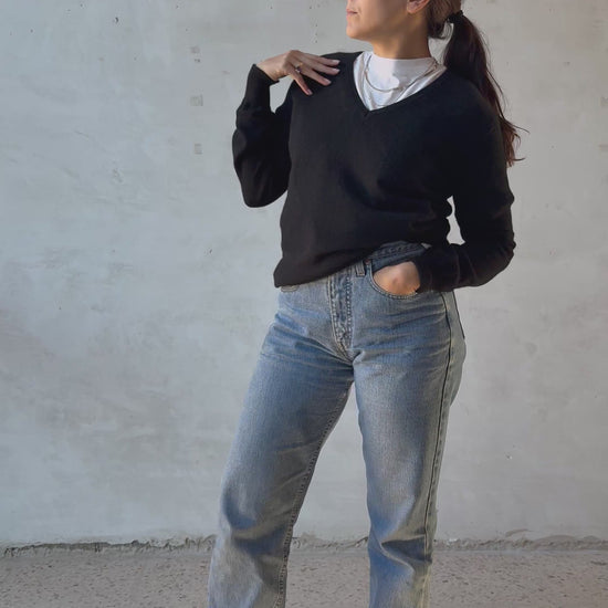 Maglione nero con scollo a V, dal design essenziale e pulito. Realizzato in cashmere, presenta una maglia fine e uniforme, morbida al tatto. Collo, polsi e fondo rifiniti a costina. Un capo semplice e versatile, adatto sia a essere indossato da solo che sotto una giacca o un cappotto.