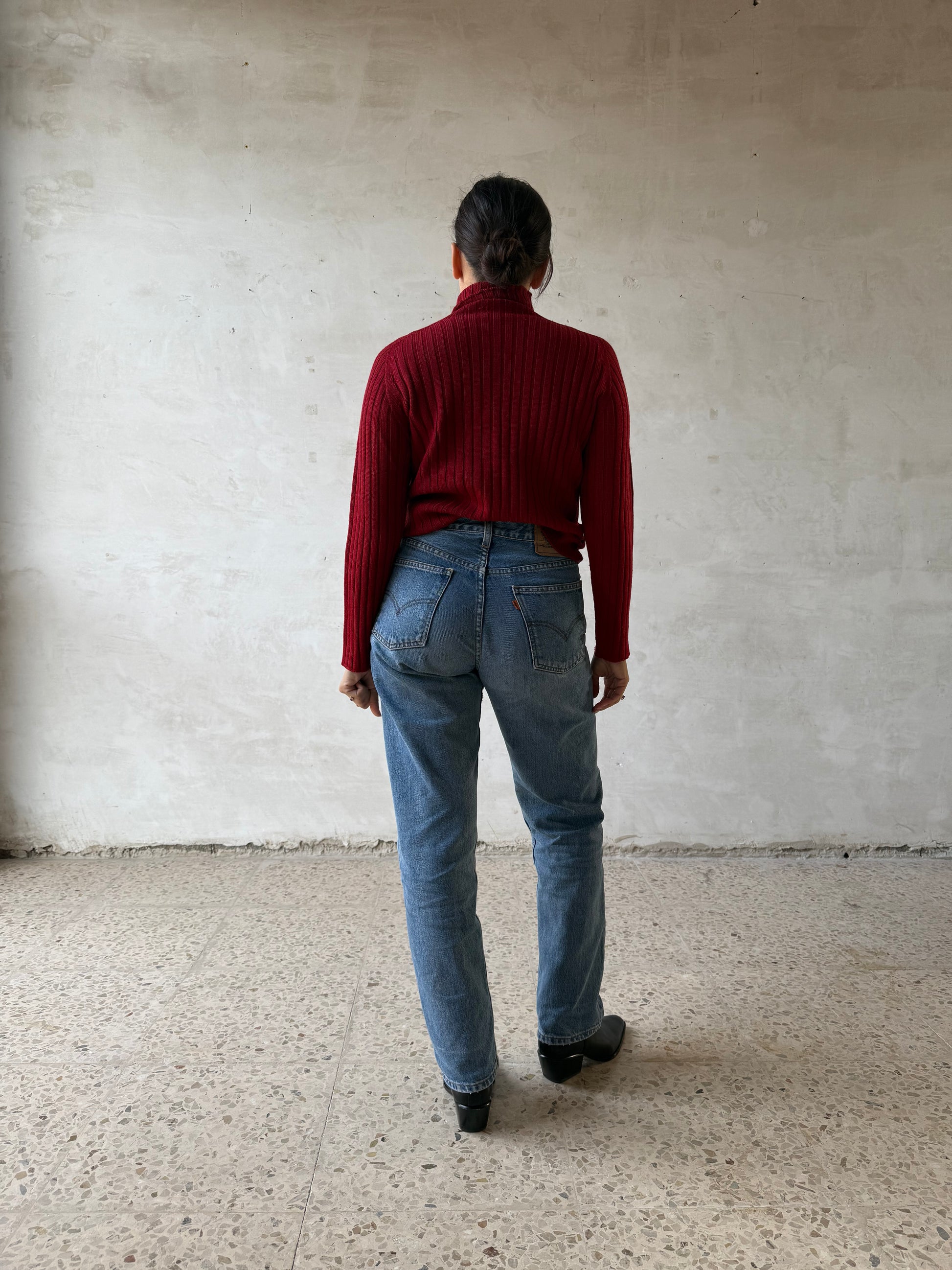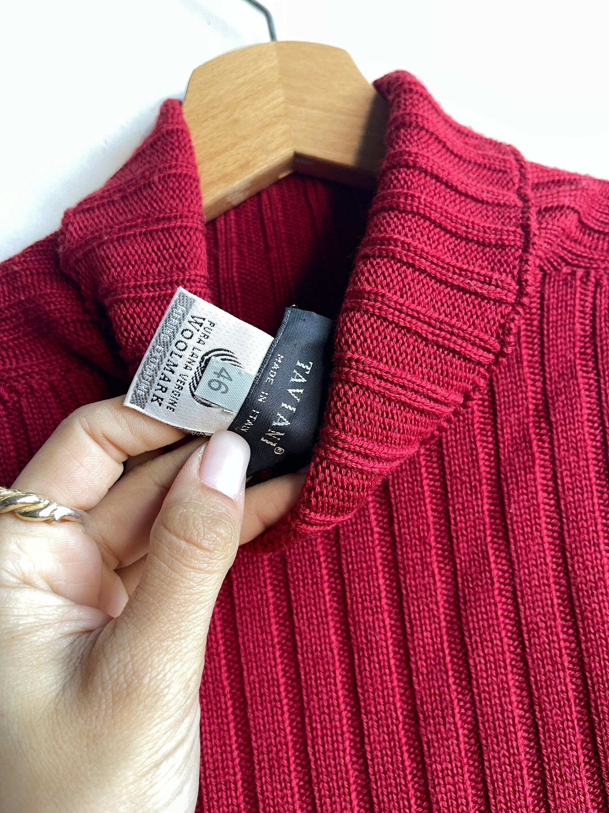 Maglione rosso in pura lana Woolmark, lavorazione a costine verticali che snellisce la linea e mantiene la struttura elastica.