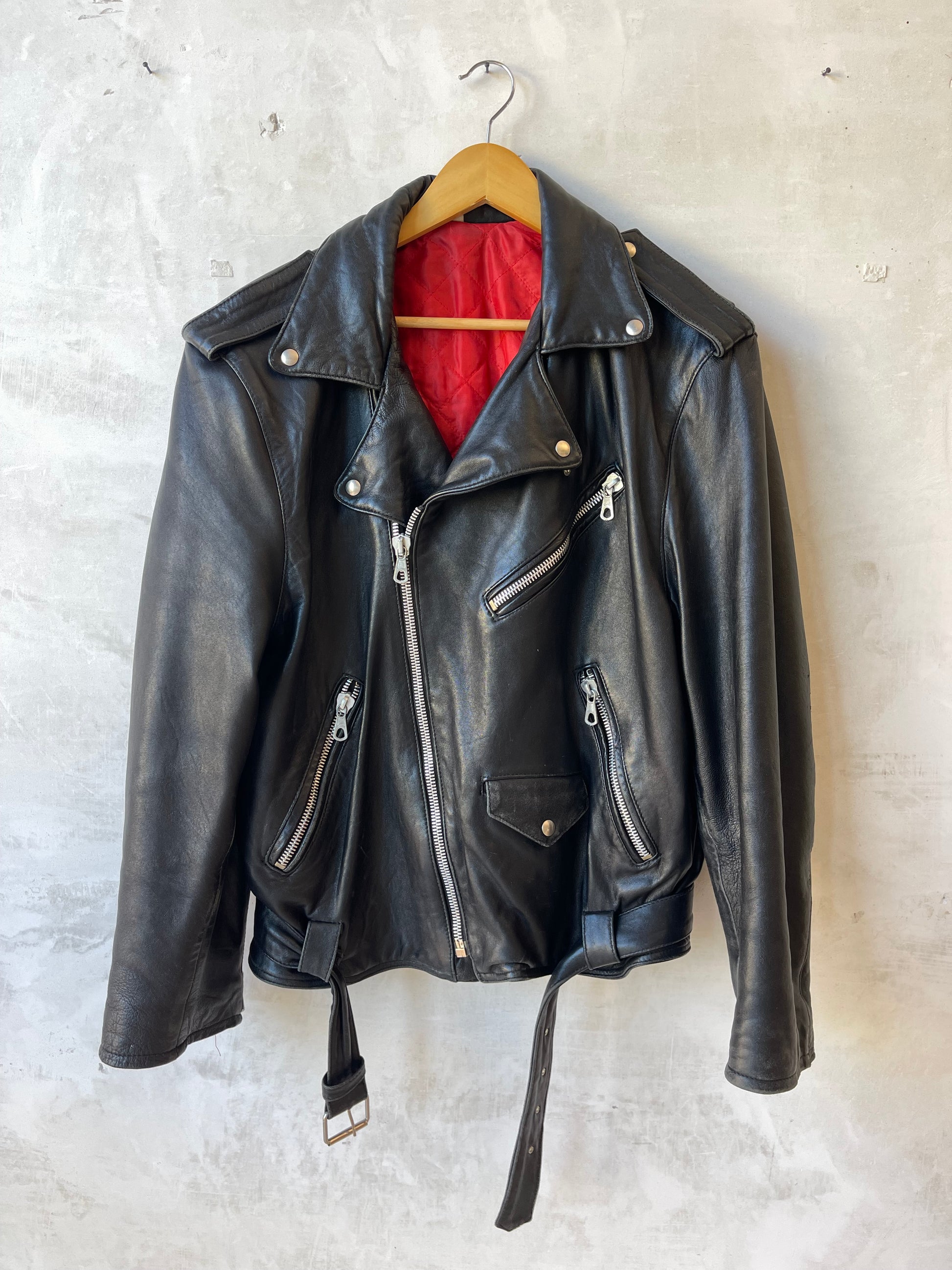 Giacca biker in pelle nera con fodera interna trapuntata rossa. Colletto con revers e bottoni a pressione, chiusura frontale con zip asimmetrica, tre tasche con zip metalliche e una tasca con pattina e bottone a pressione. Cintura in vita regolabile con fibbia.
