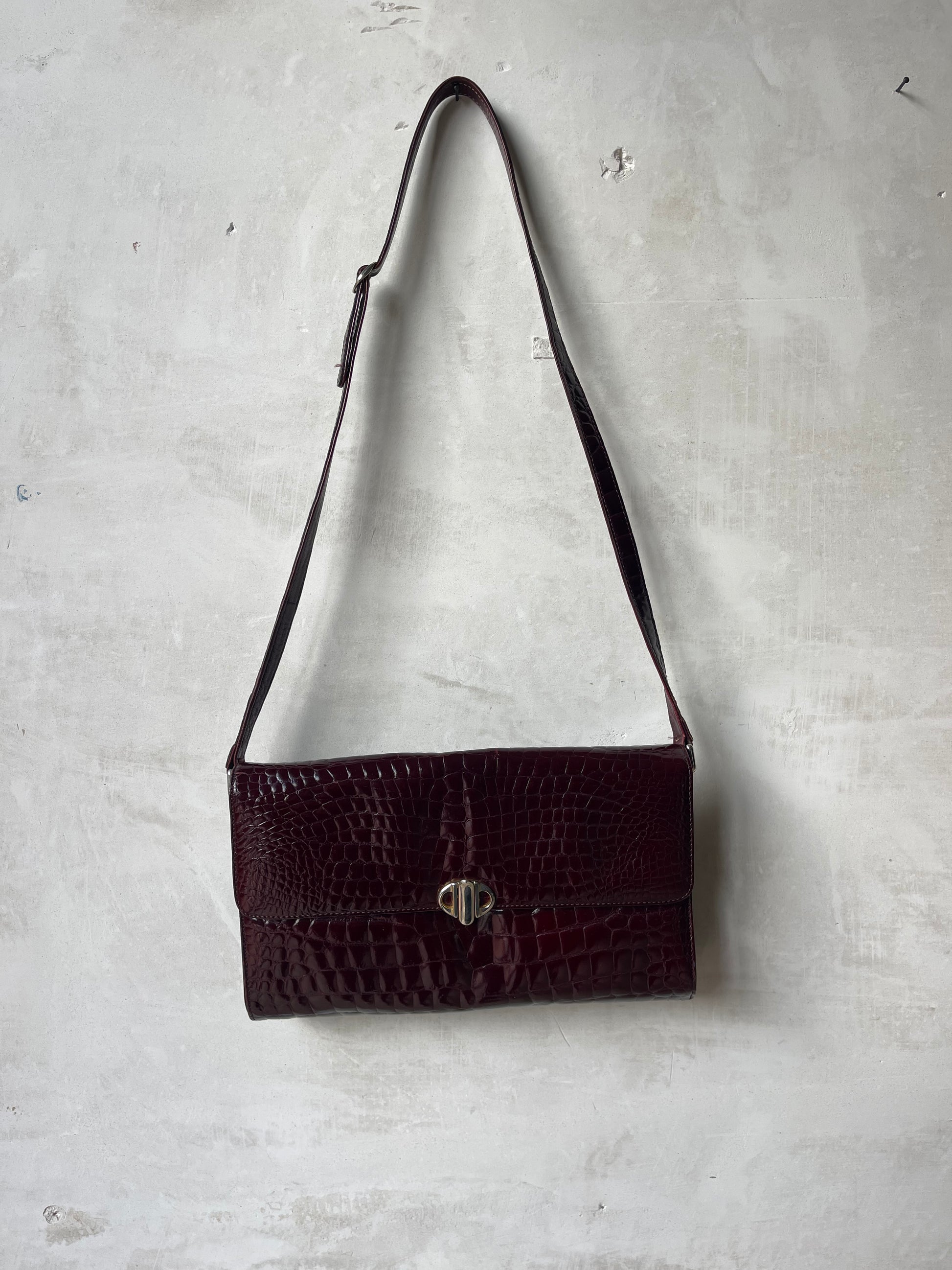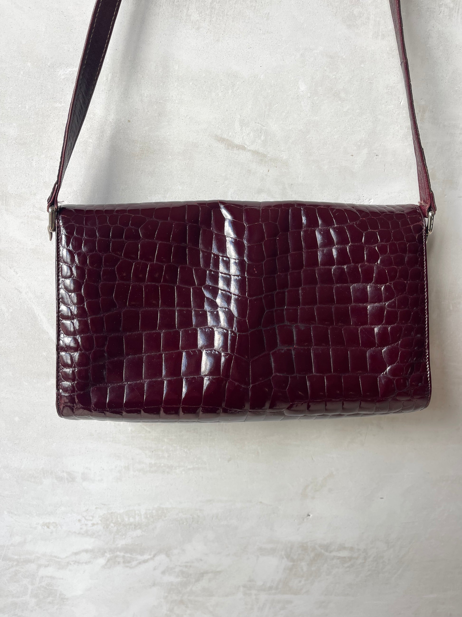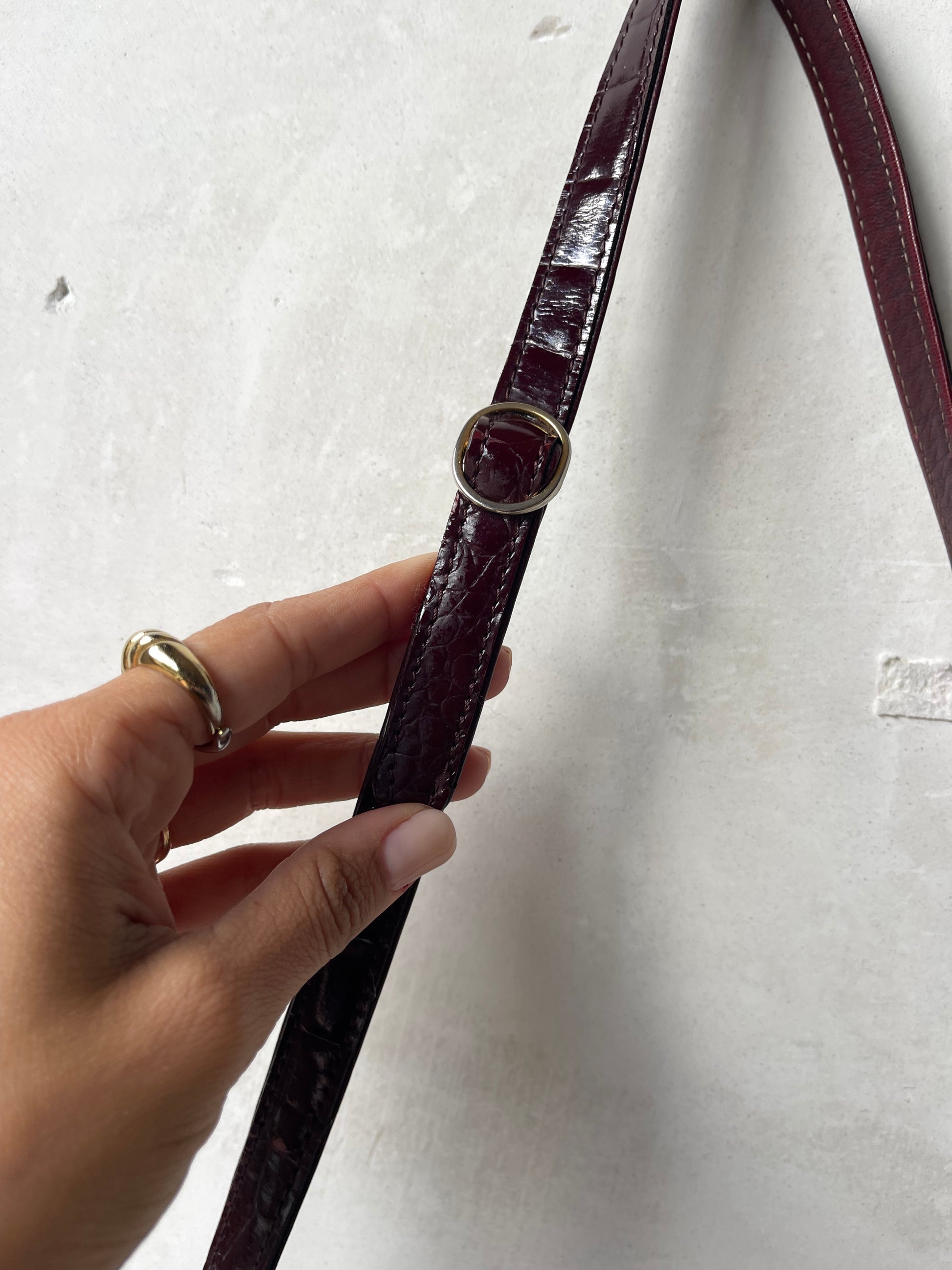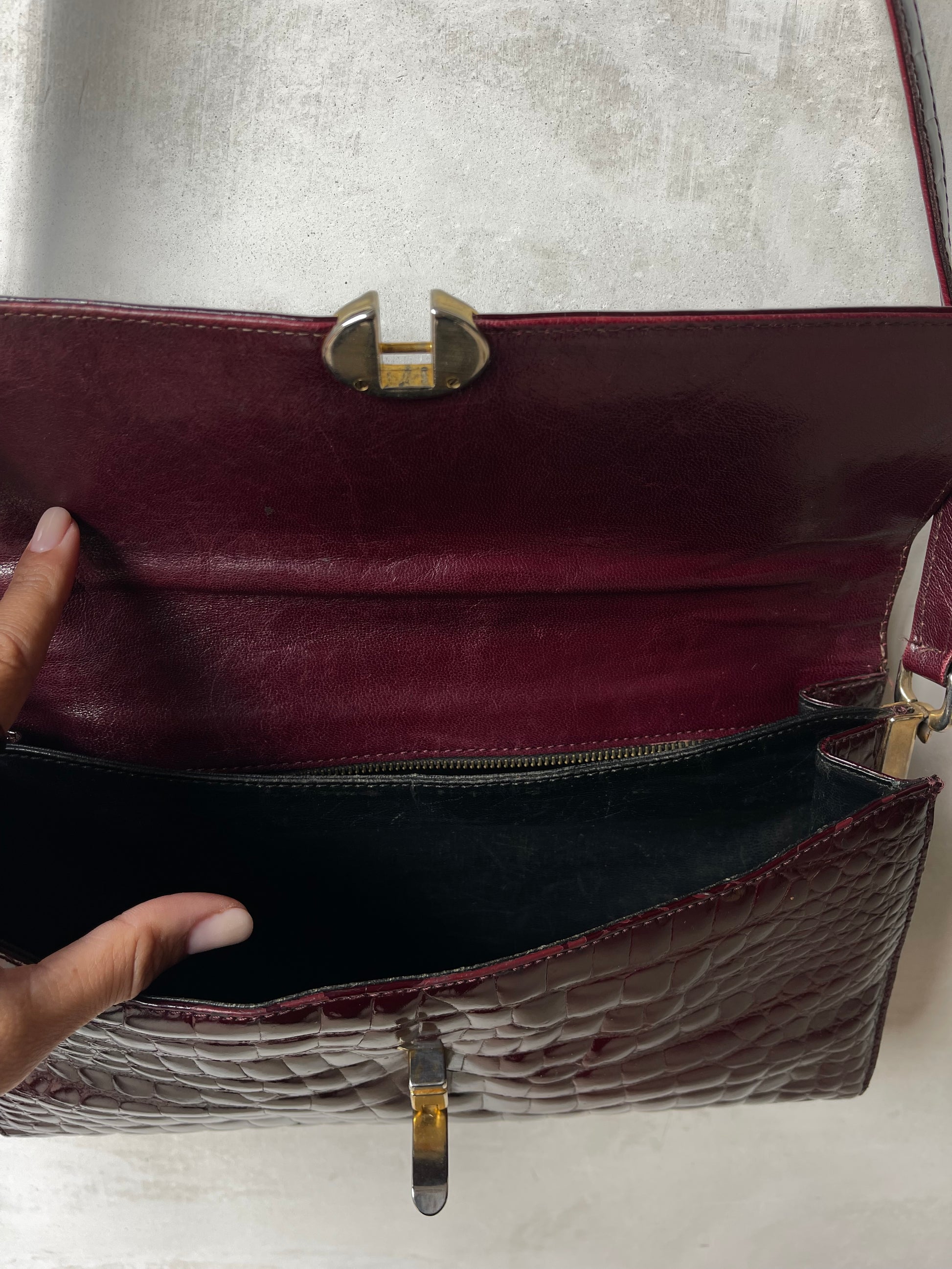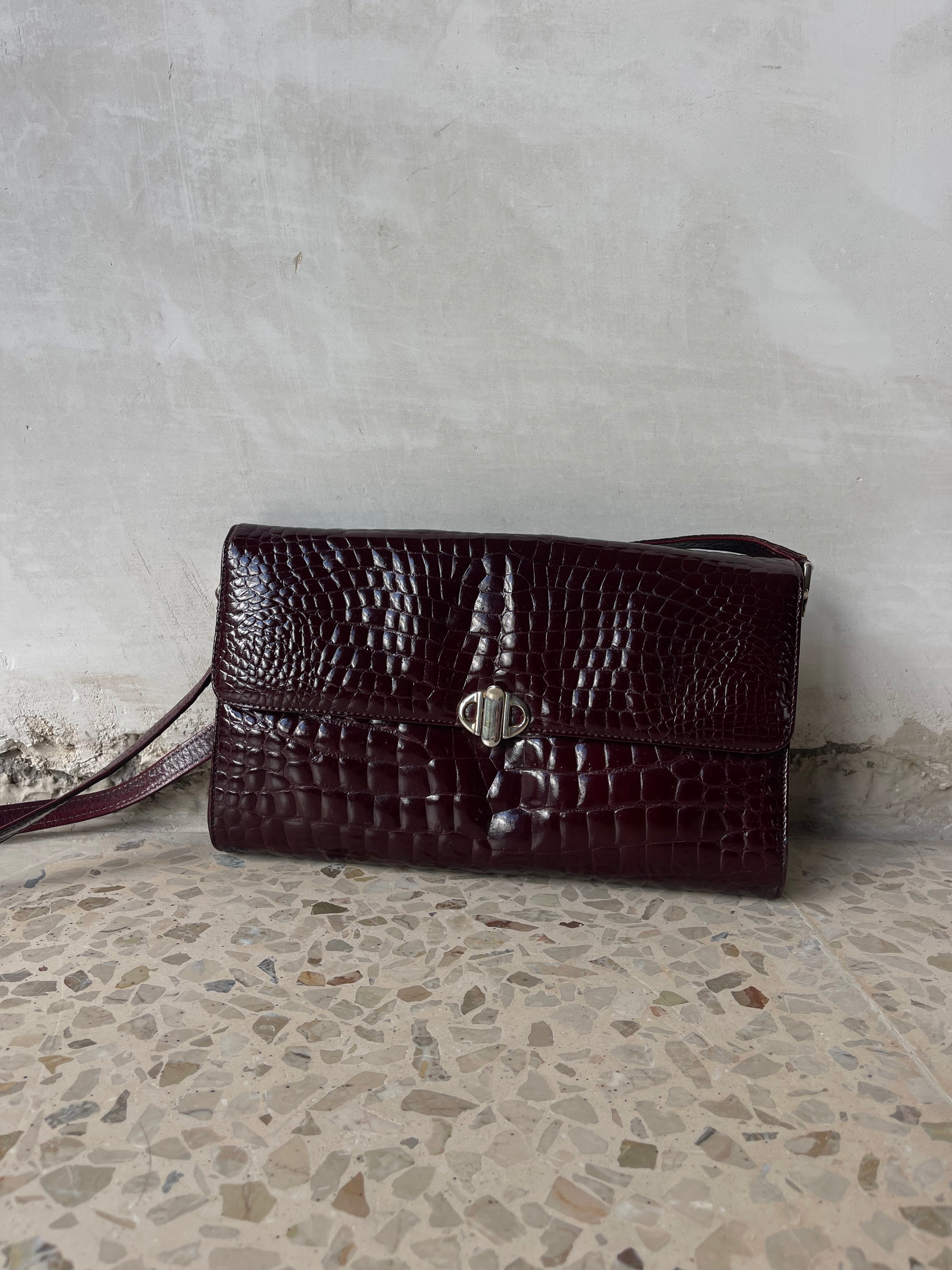 Borsa a spalla in pelle effetto cocco color bordeaux. Chiusura con clip metallica dorata, tracolla regolabile. L’interno è suddiviso in due scomparti, di cui uno centrale con zip e due laterali aperti, più una piccola tasca aggiuntiva.