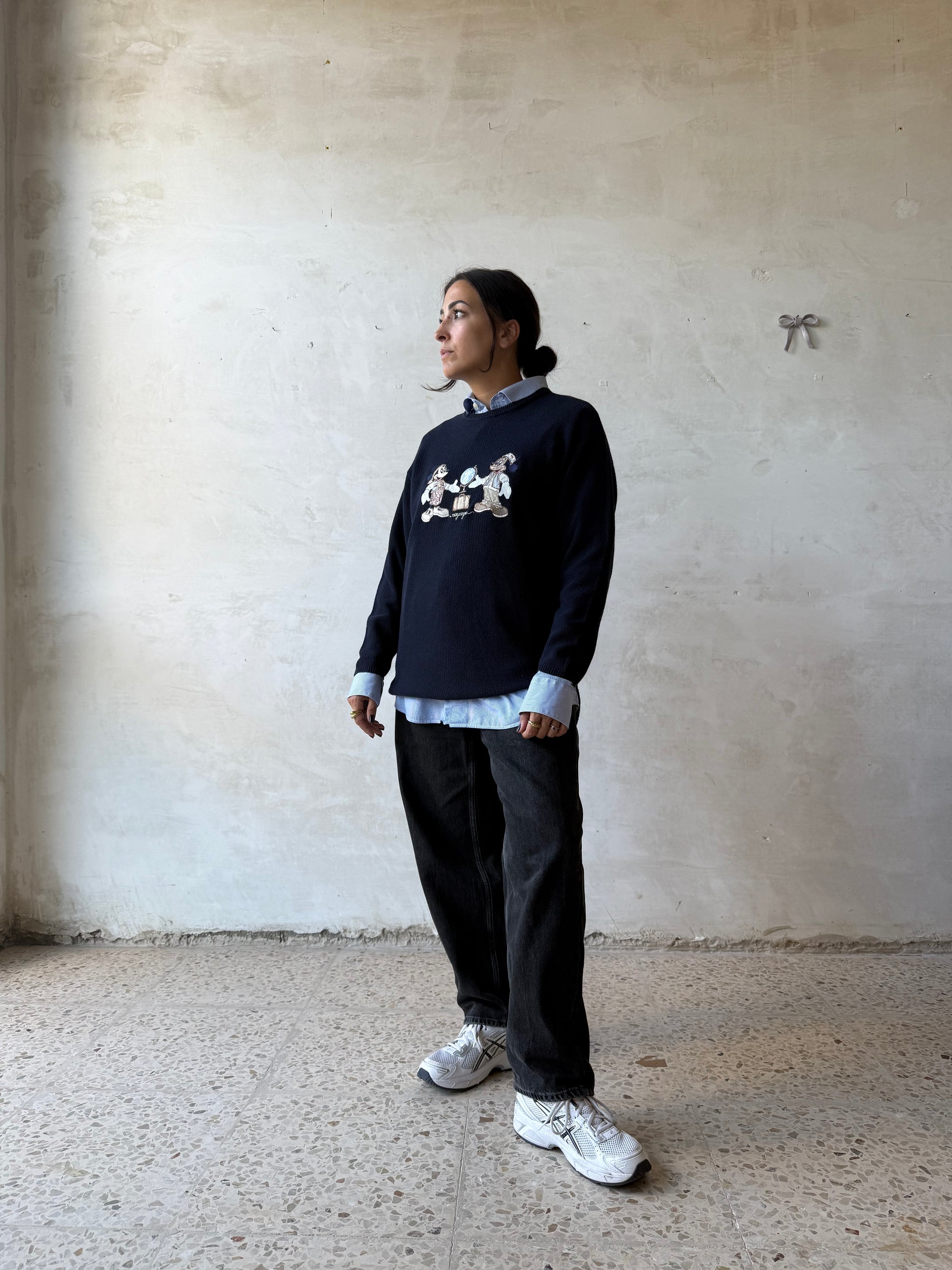 Maglia in cotone blu navy con lavorazione a nido d’ape. Girocollo, maniche lunghe e ricamo frontale con personaggi Disney in tessuto applicato. Fondo e polsini rifiniti con bordatura semplice.