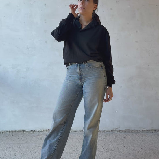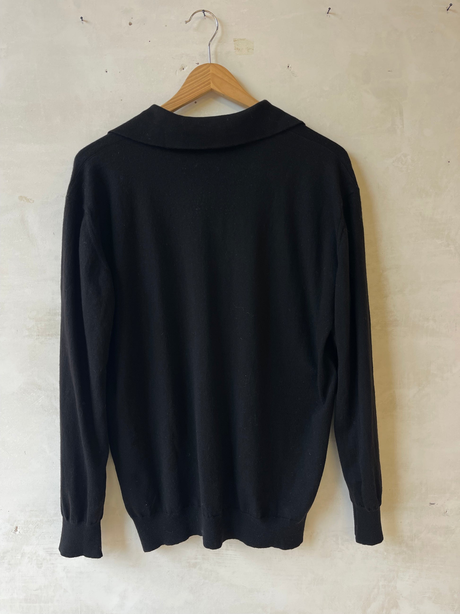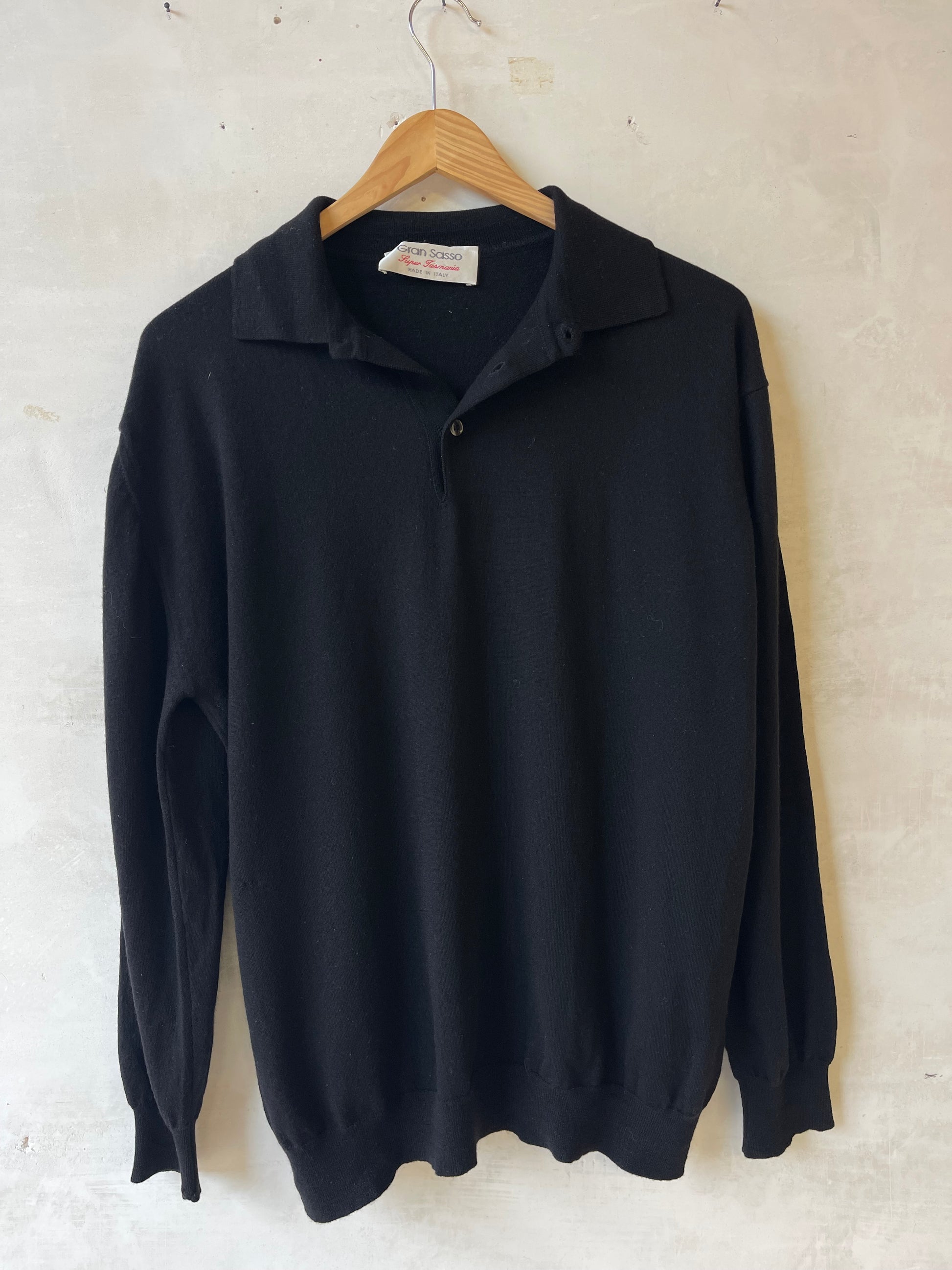 Maglia polo in lana vergine firmata Maglificio Gran Sasso, realizzata in Italia. Filato nero a maglia fine, mano morbida e compatta, con struttura regolare e uniforme. Collo a polo senza bottoni visibili, apertura corta sul davanti. Polsini e fondo rifiniti a costina. Vestibilità morbida sul corpo, con linea dritta e spalla scesa.