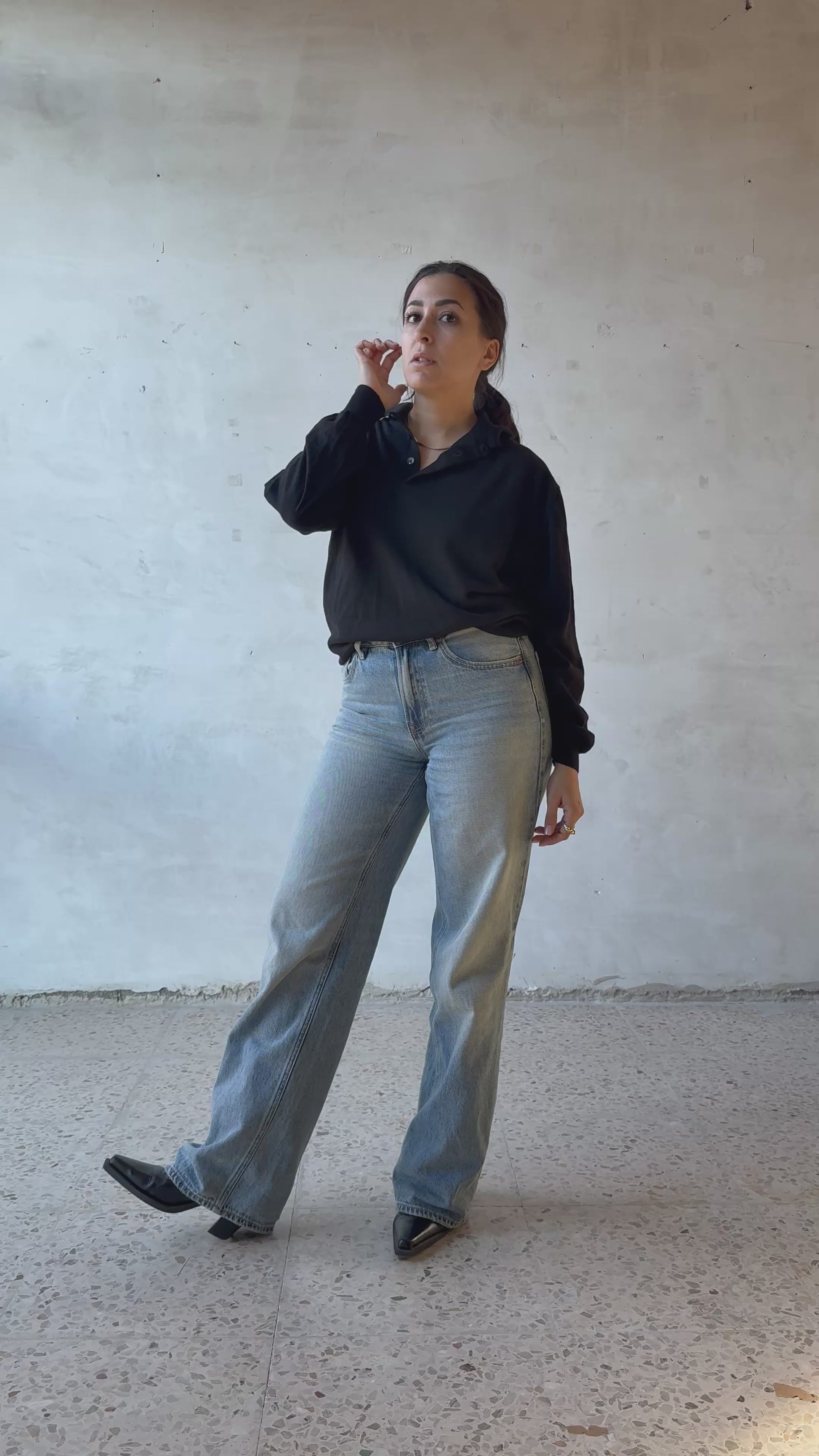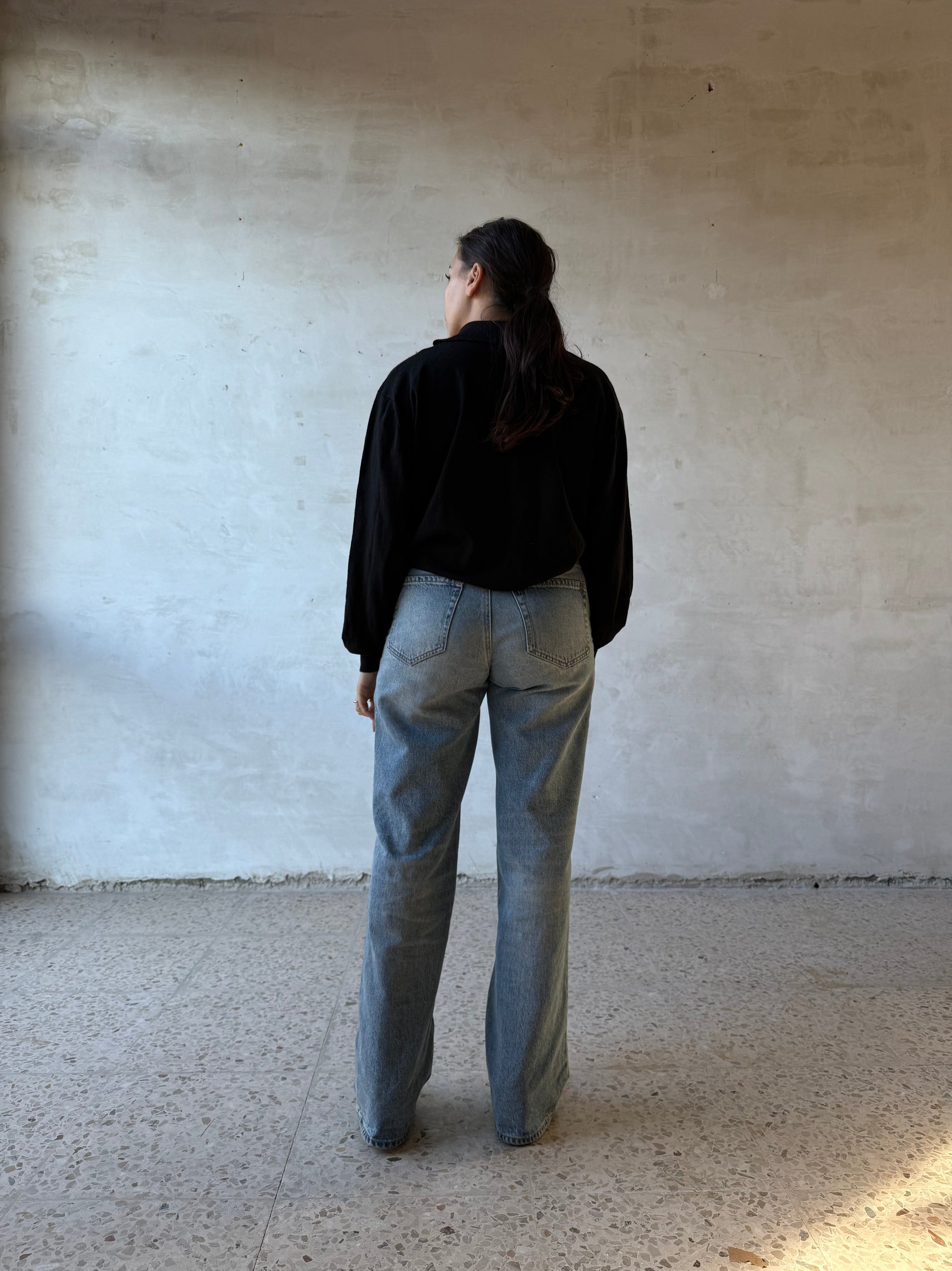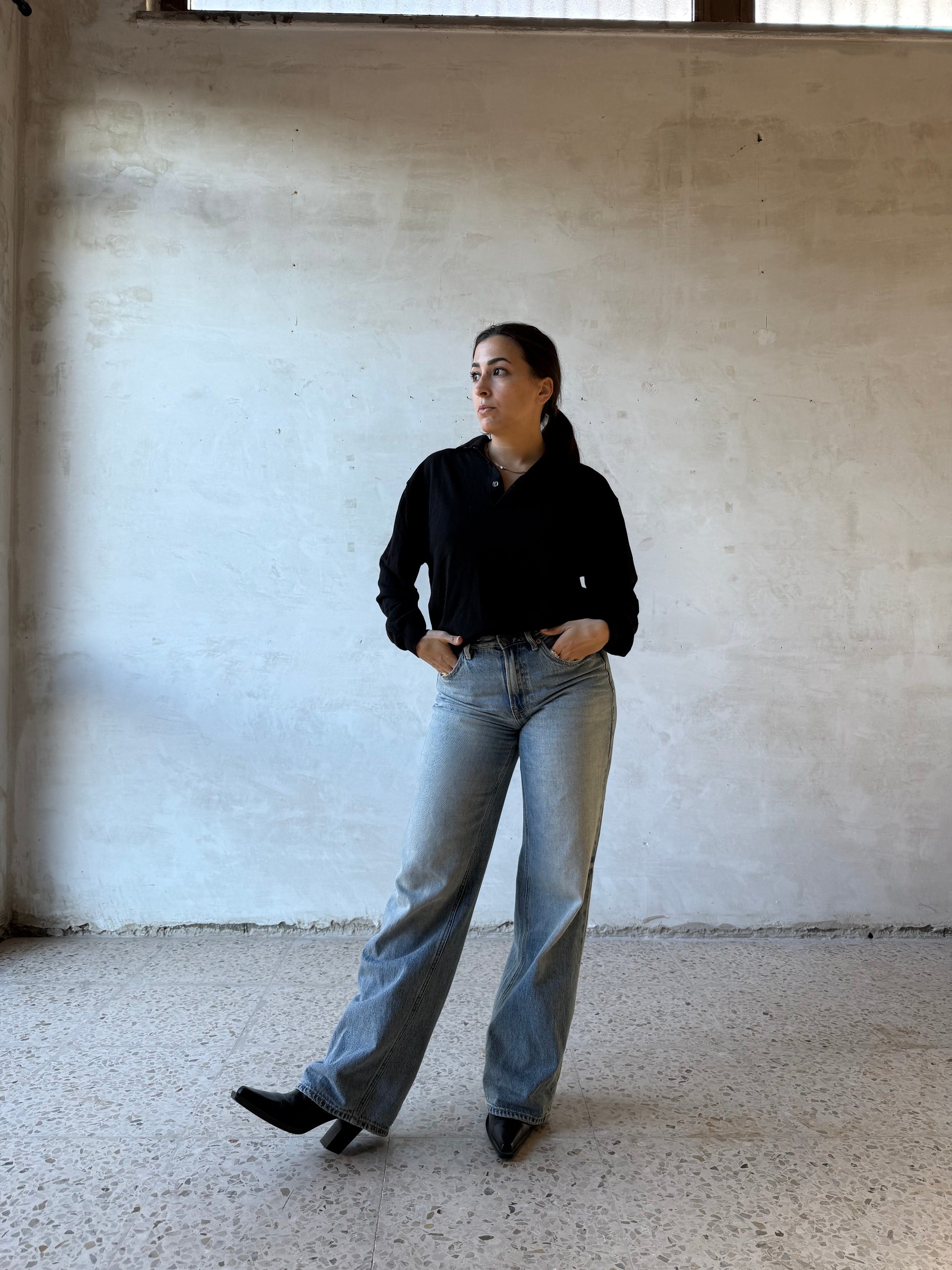 Maglia polo in lana vergine firmata Maglificio Gran Sasso, realizzata in Italia. Filato nero a maglia fine, mano morbida e compatta, con struttura regolare e uniforme. Collo a polo senza bottoni visibili, apertura corta sul davanti. Polsini e fondo rifiniti a costina. Vestibilità morbida sul corpo, con linea dritta e spalla scesa.
