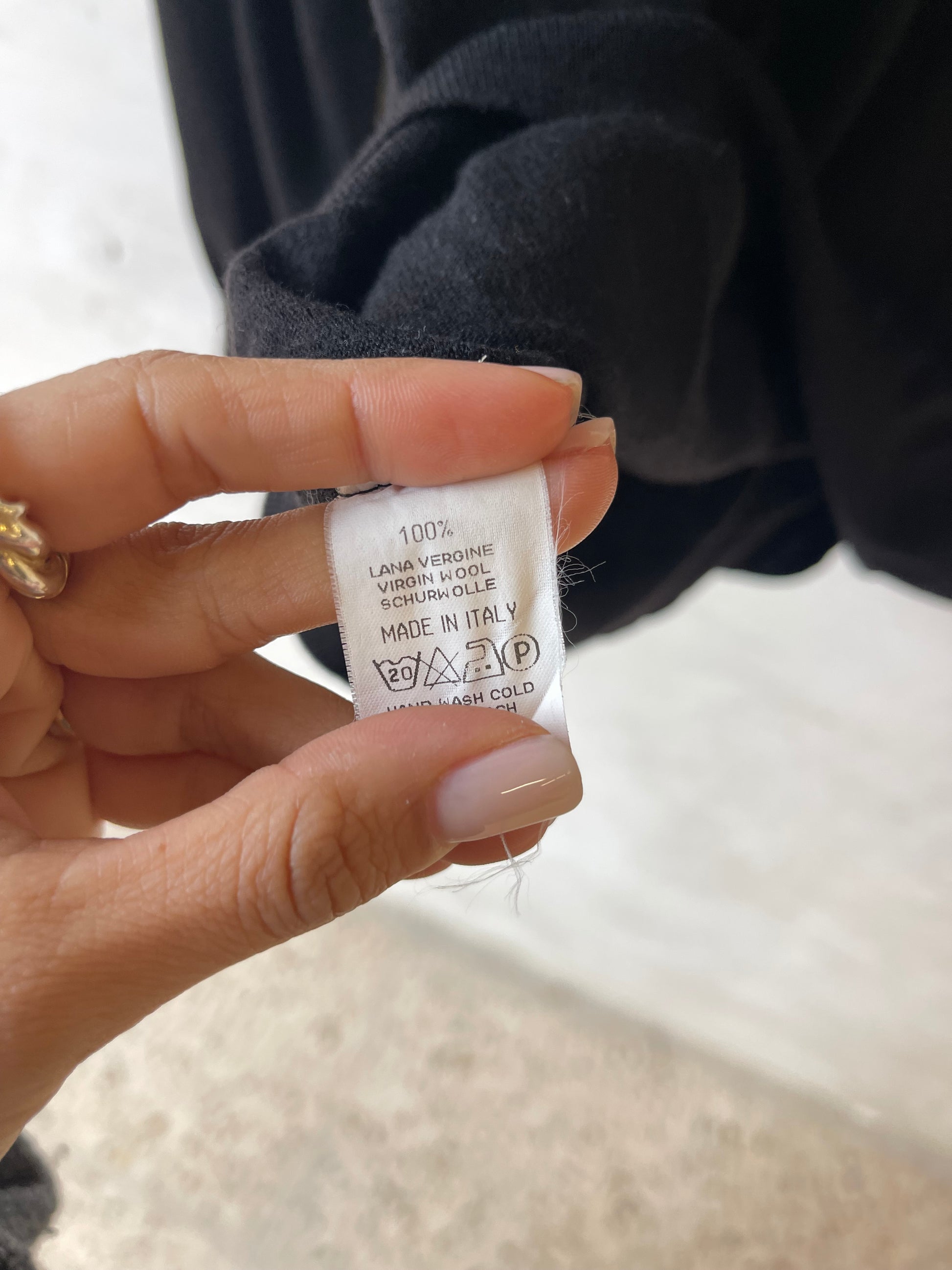 Presenti due piccoli rammendi sul tessuto, percepibili da vicino ma ben integrati nella trama e poco evidenti una volta indossata. Etichetta interna composizione: 100% lana vergine.