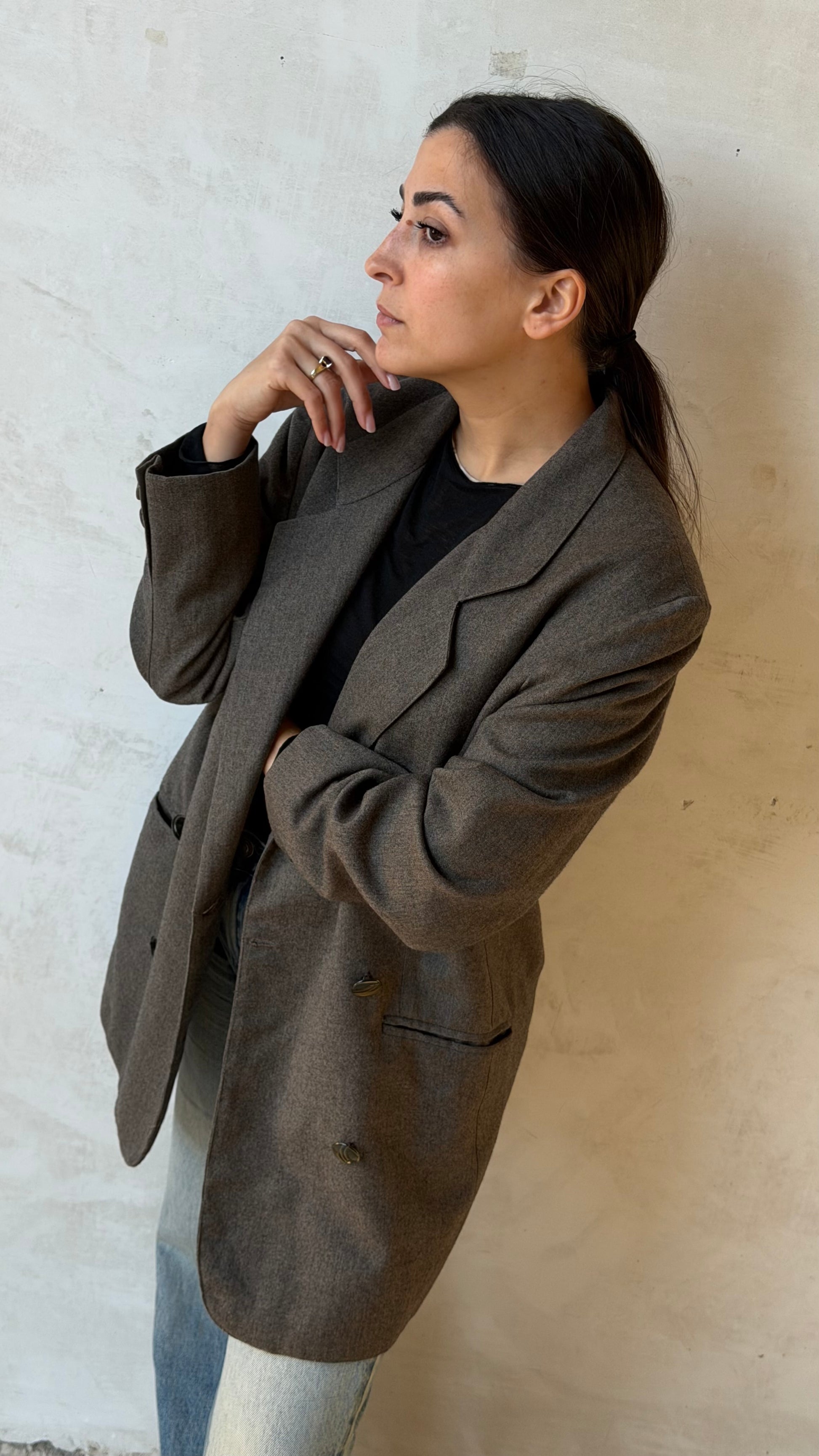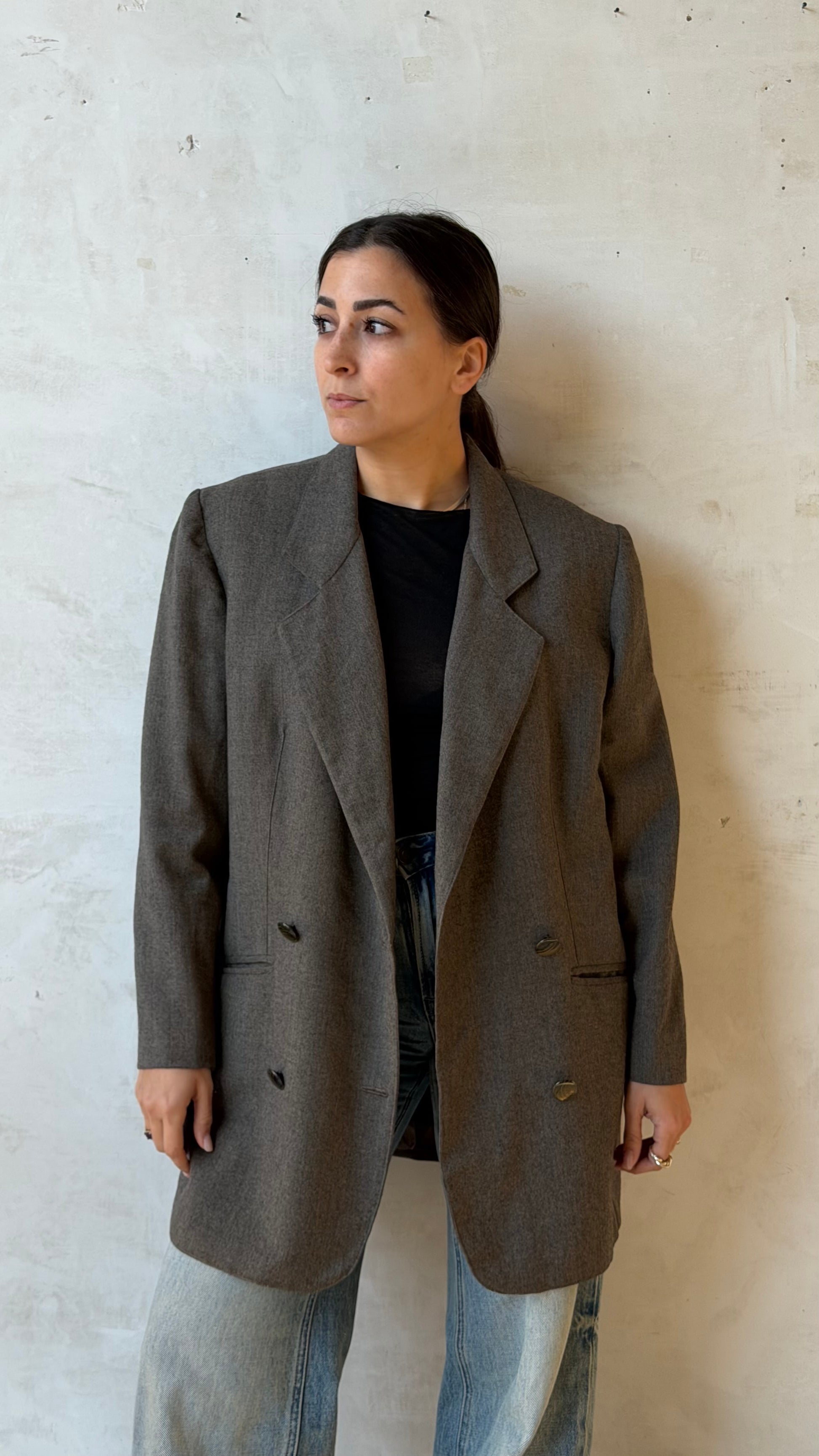 Blazer vintage doppiopetto color verde, dalla linea sartoriale maschile e costruzione strutturata. Rever classico ampio, quattro bottoni frontali, tasche a filetto e chiusura interna a bottone. Vestibilità leggermente oversize. Capo realizzato in lana.