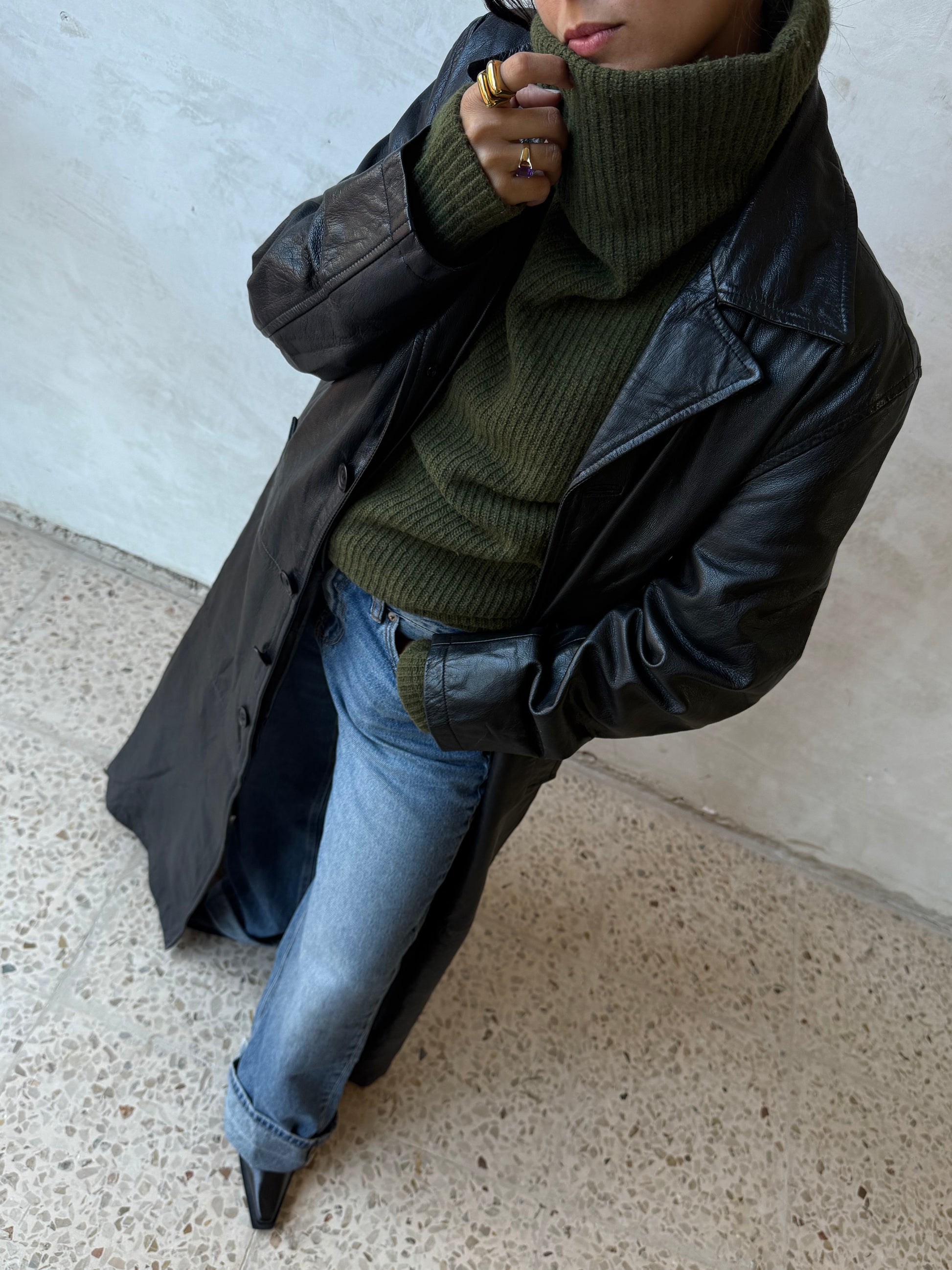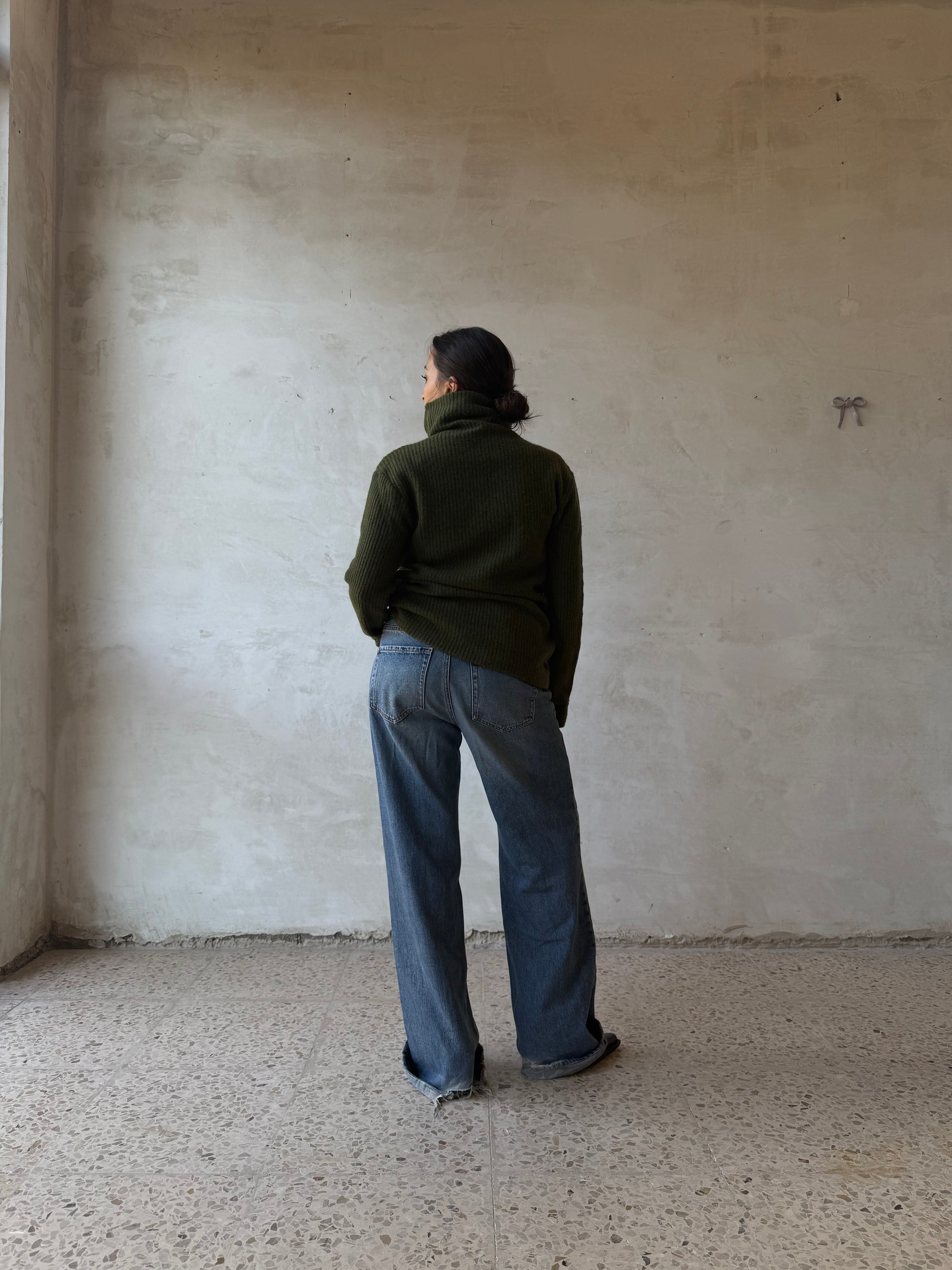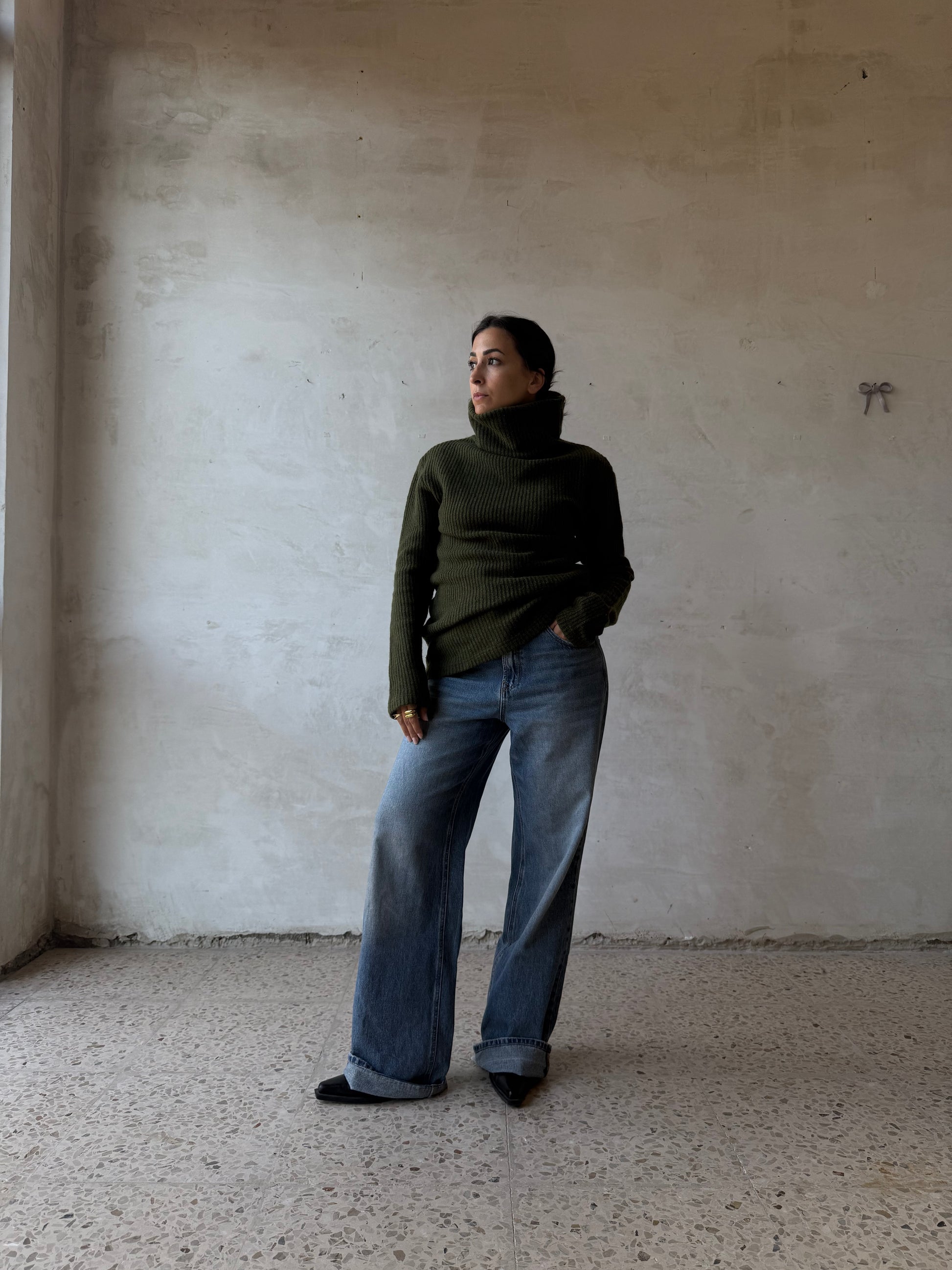 Maglione dolcevita in lana misto alpaca, color verde bosco. Lavorazione a coste larghe, linea dritta e ampia, maniche lunghe e girocollo alto arrotolabile. Fondo leggermente arrotondato, finitura semplice senza bordature a vista.