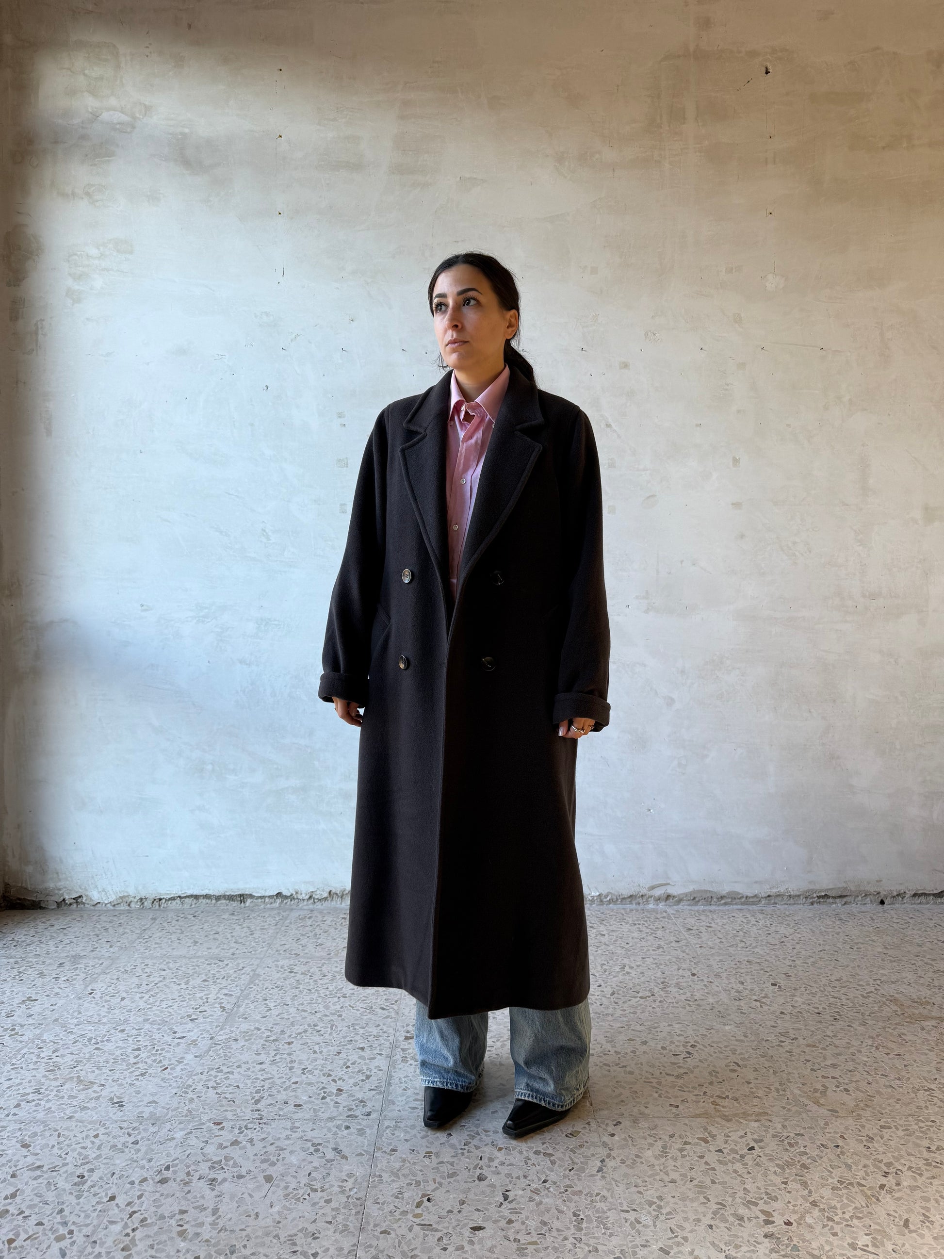 Capo interessante anche per la sua rarità: spalle contenute abbinate a una lunghezza molto importante, combinazione non comune nei cappotti vintage.