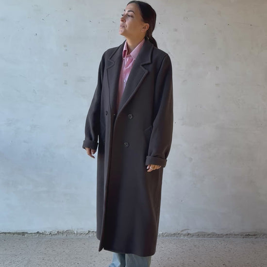 Modello lungo doppiopetto, linea pulita ed essenziale, rever classici, tasche oblique applicate. La lunghezza importante slancia la figura e bilancia la struttura del capo.
