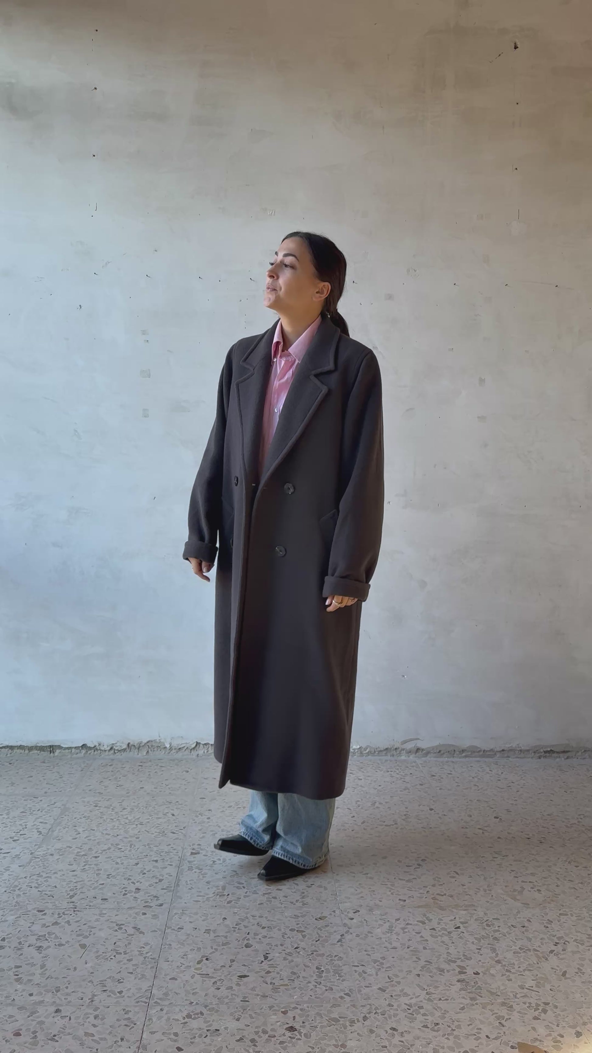 Cappotto grigio topo in lana d’agnello, tessuto naturalmente morbido, avvolgente e caldo, con mano piena e corposa. La lana, pur non essendo in condizioni perfette, mantiene struttura, calore e una bella resa visiva indossata.