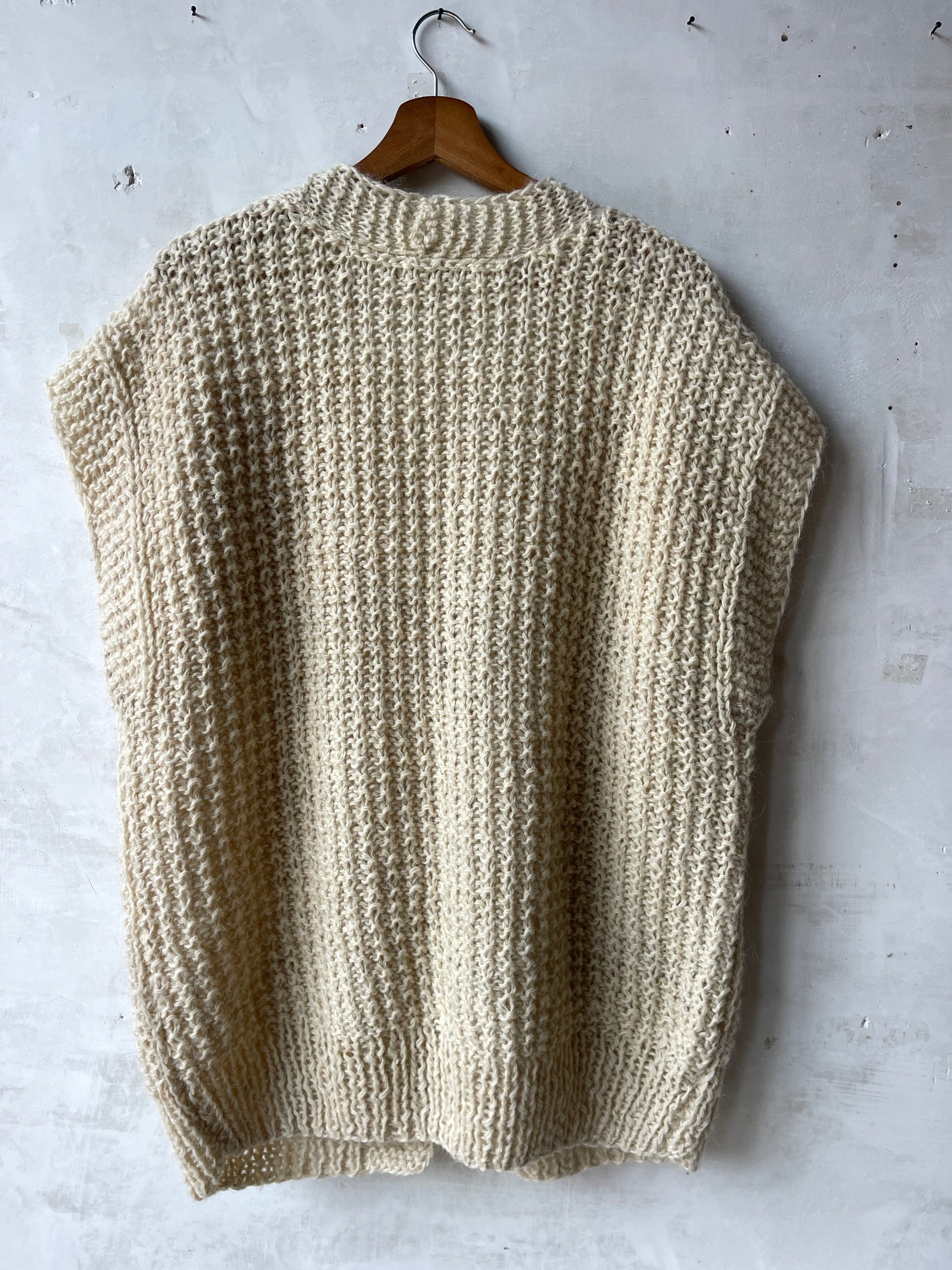 Gilet in lana color panna interamente fatto a mano, caratterizzato da una lavorazione spessa con motivo a trecce e noccioline sul davanti. Apertura a bottoni anch’essi artigianali, realizzati in lato, perfettamente in tono con il filato.