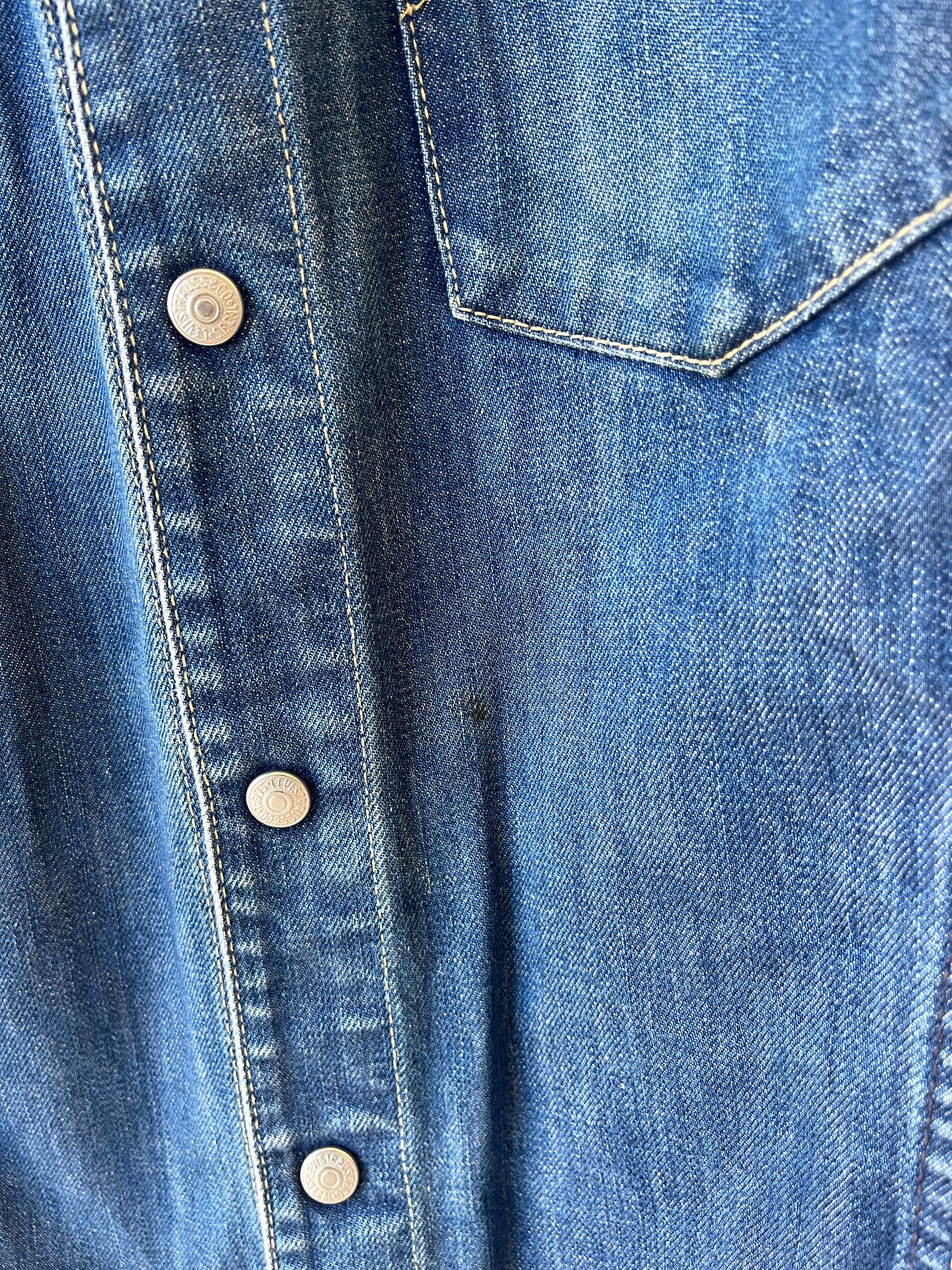 Giacca in denim blu Levi’s lavaggio medio. Modello con colletto classico, chiusura frontale con bottoni a pressione e tasche applicate sul petto. Presenta cuciture a contrasto che ne sottolineano la struttura. Polsini regolabili con bottone a pressione e orlo dritto.