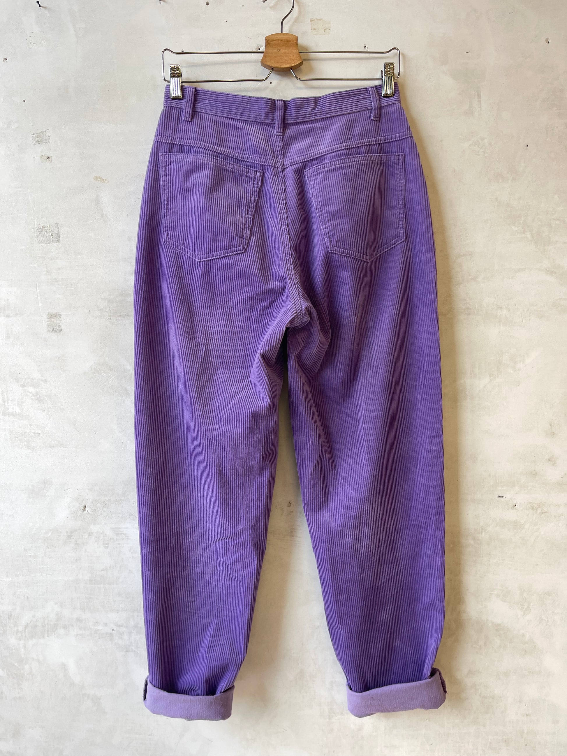 Pantalone in velluto a coste viola firmato United Colors of Benetton, produzione Made in Italy. Tessuto in velluto a coste medie, mano morbida e compatta, struttura regolare e uniforme.