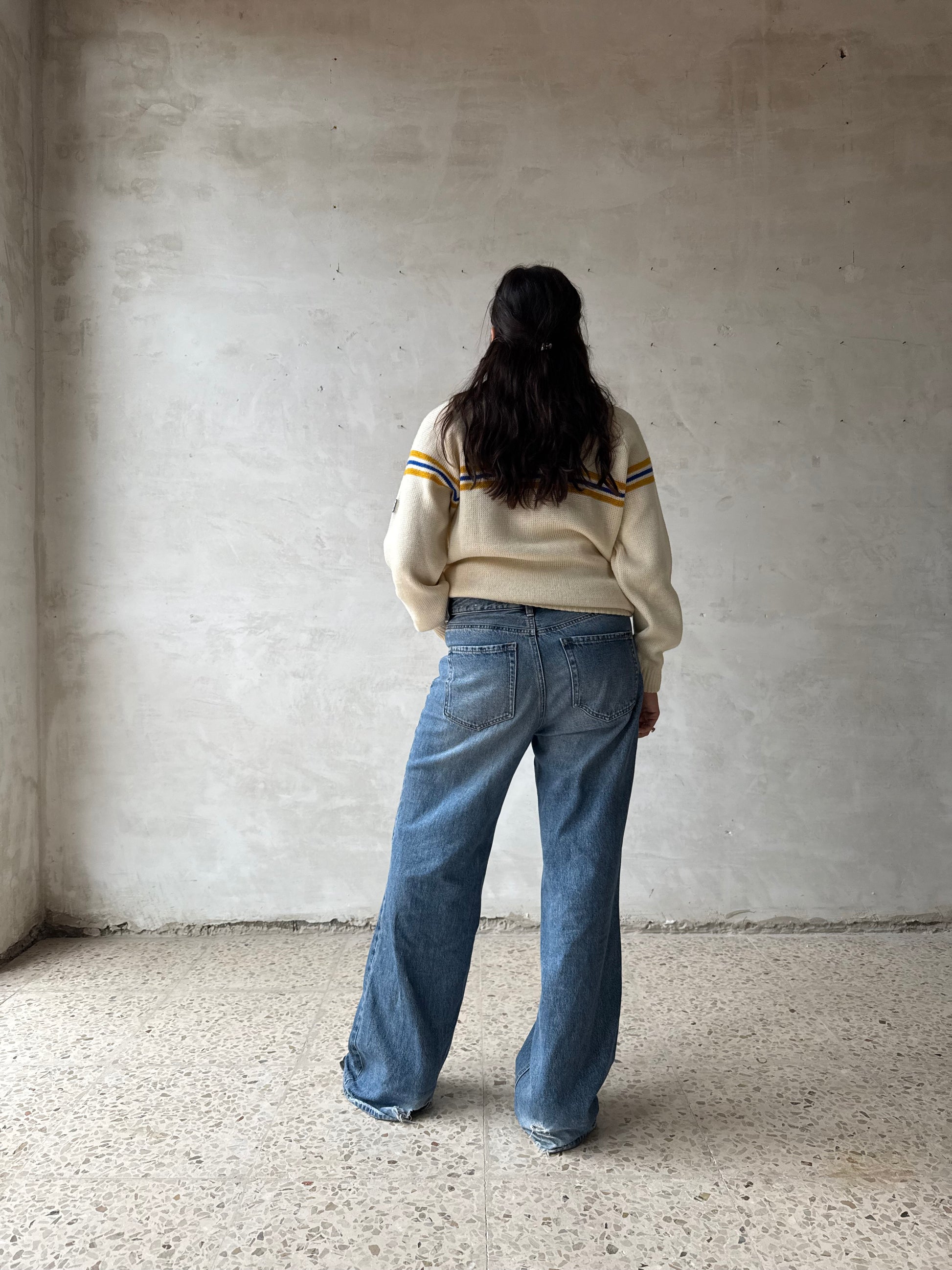Maglione vintage Champion in morbida lana color panna, caratterizzato da una linea rilassata e fit comodo. Presenta una spalla scesa e un motivo a righe orizzontali blu, giallo e senape che attraversa il busto e le maniche, donando un look sportivo anni ’70.