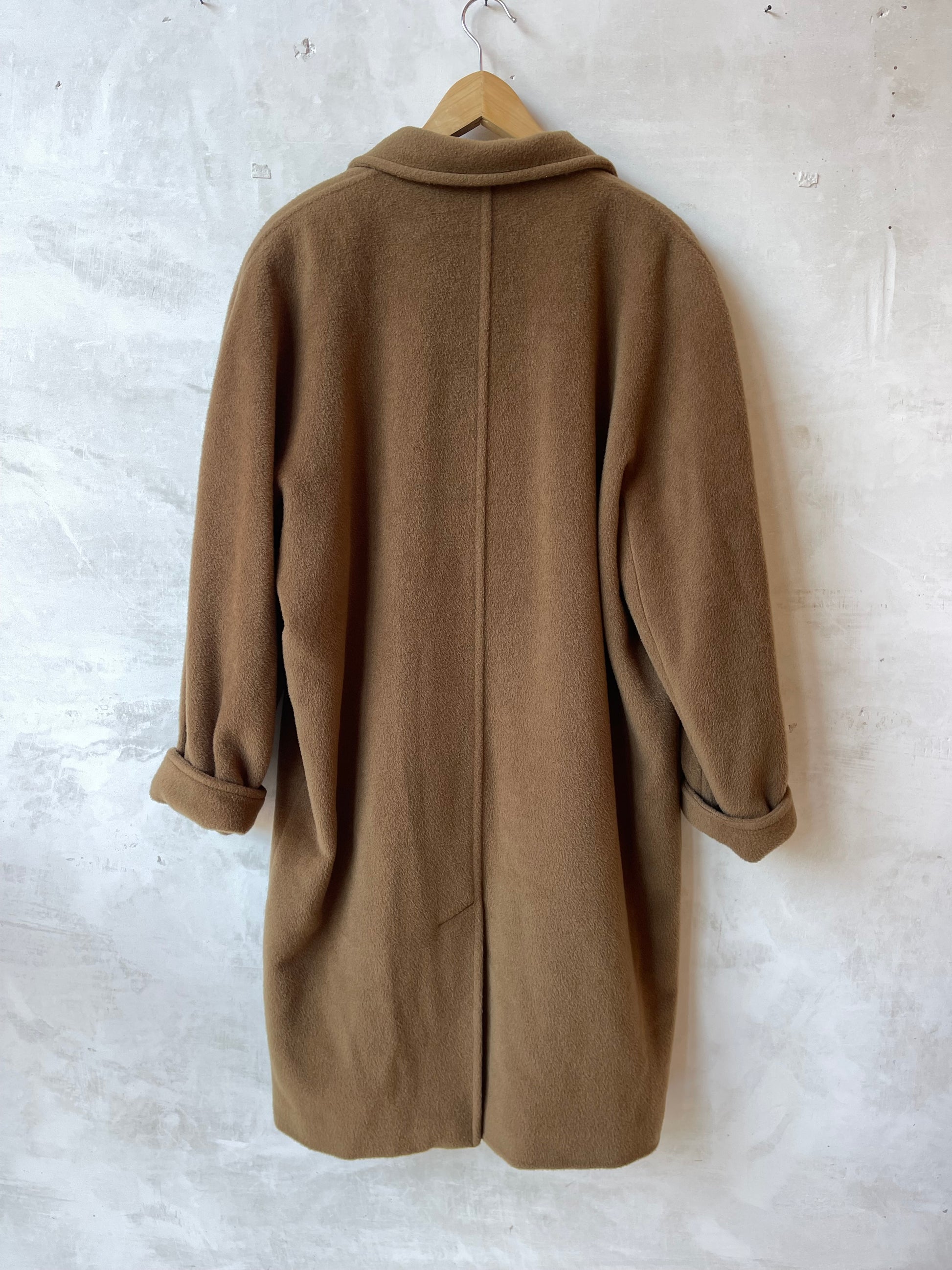 Cappotto doppiopetto Marella, made in Italy, in tessuto misto 95% lana vergine e 5% cashmere color cammello. Linea dritta e morbida, spalle leggermente scese, rever classico. Chiusura frontale con bottoni tono su tono, tasche a pattina laterali, maniche lunghe con possibilità di risvolto. Interno foderato in raso lucido abbinato, spacco posteriore per maggiore comfort.