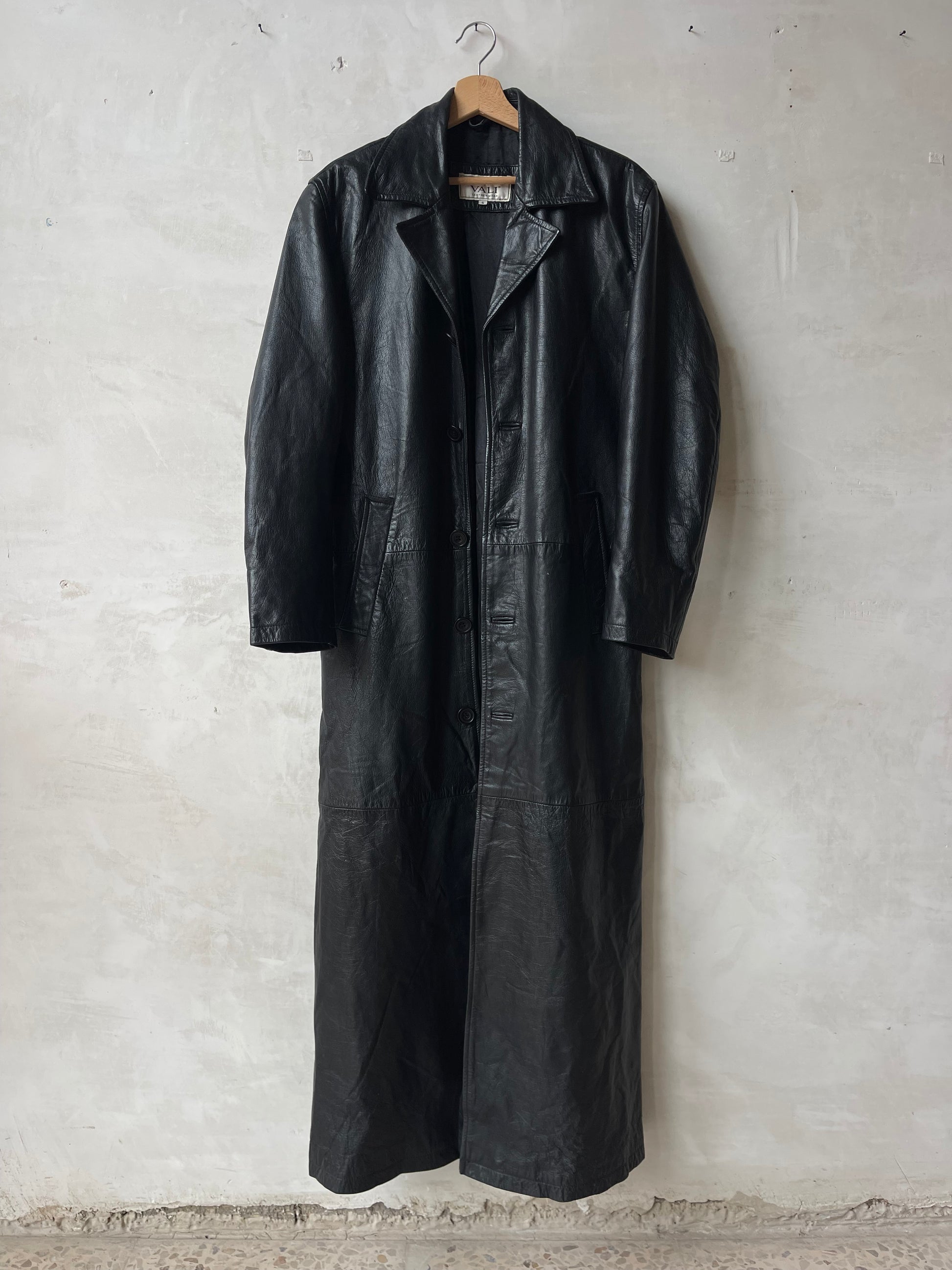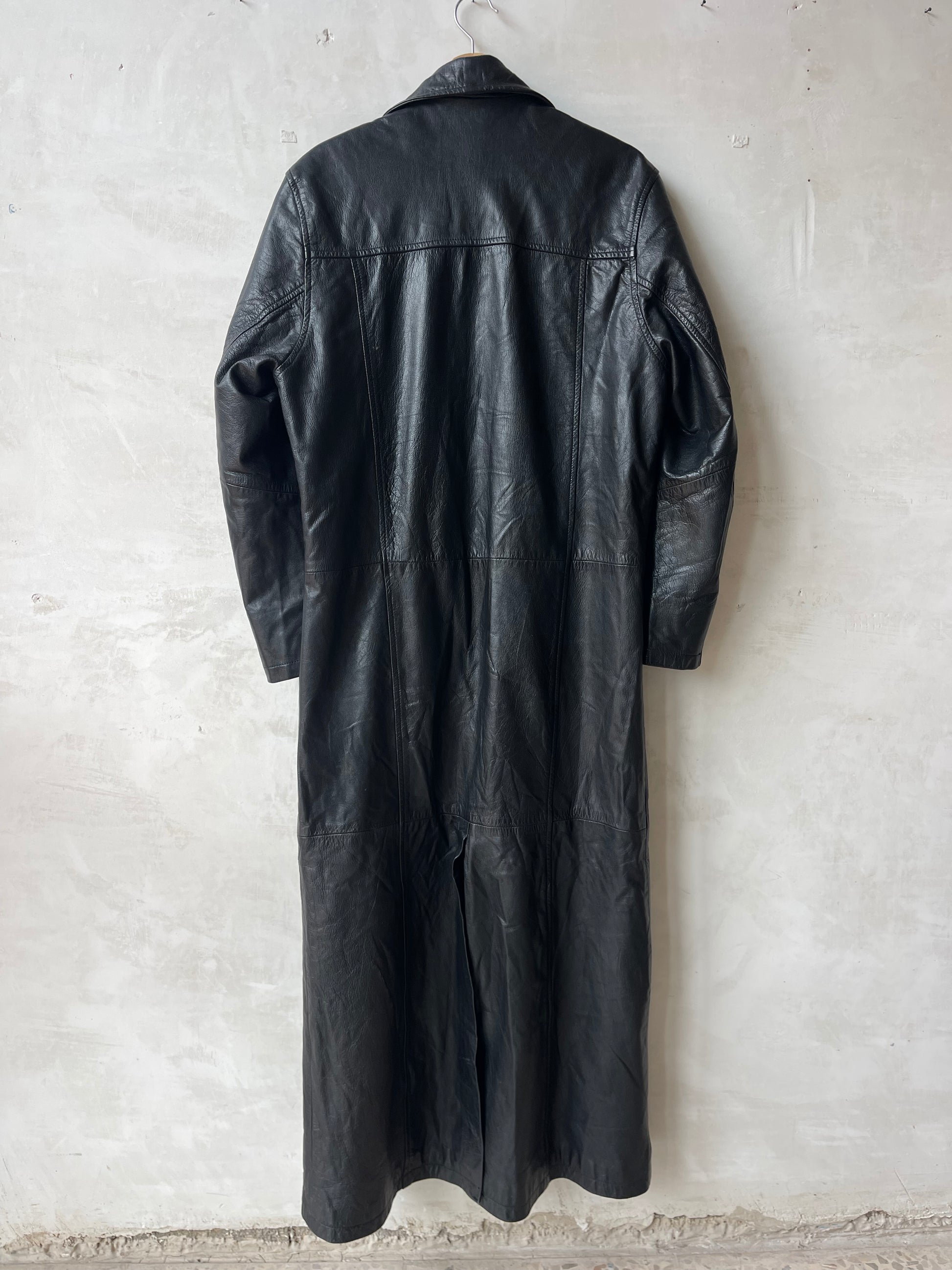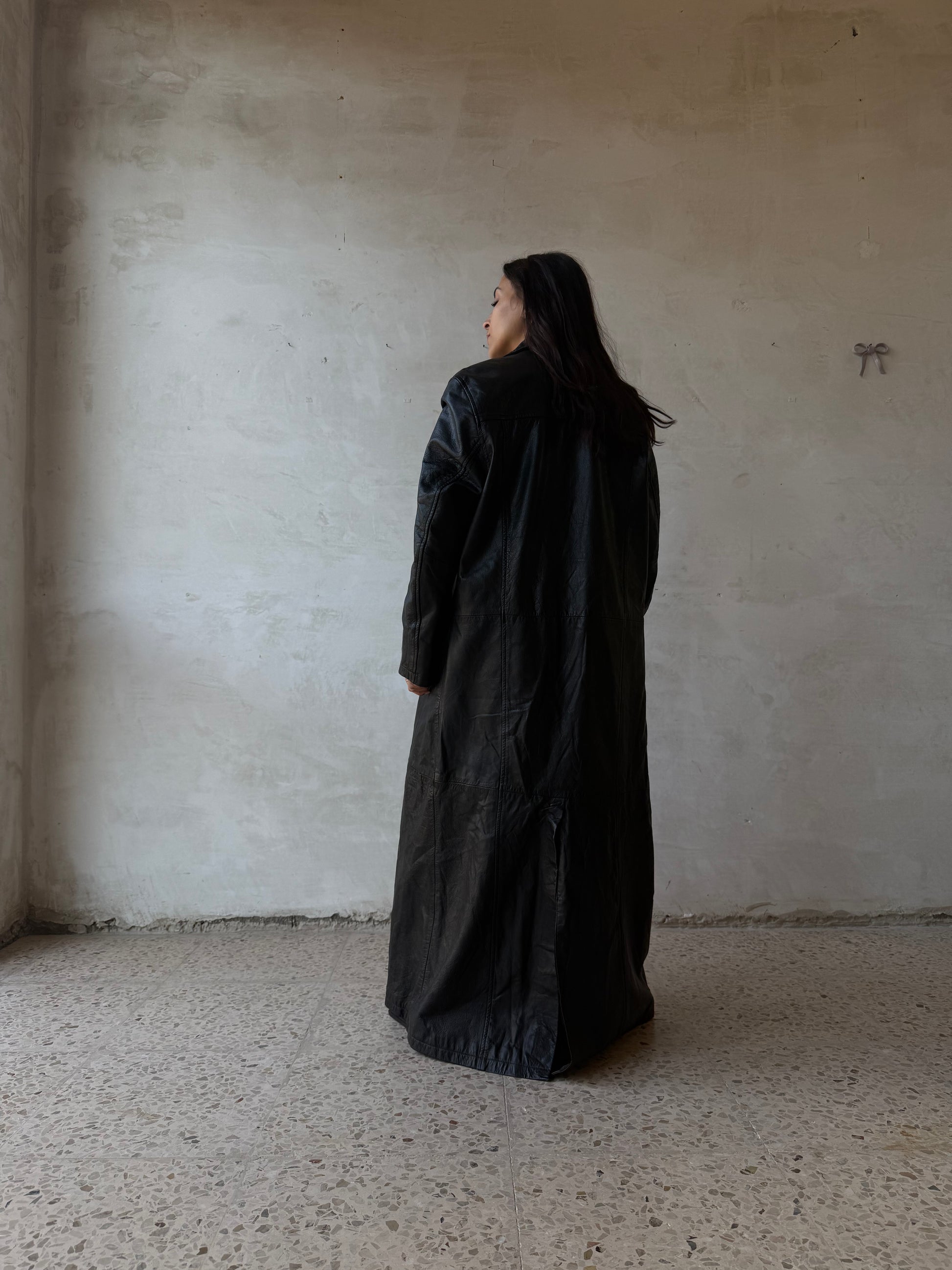 Cappotto lungo in vera pelle nera, taglia S. Modello dritto e lungo fino alla caviglia. Colletto rever classico, chiusura monopetto con cinque bottoni frontali, due tasche a filetto laterali. Maniche lunghe regolari, costruzione semplice senza cuciture o decorazioni evidenti.