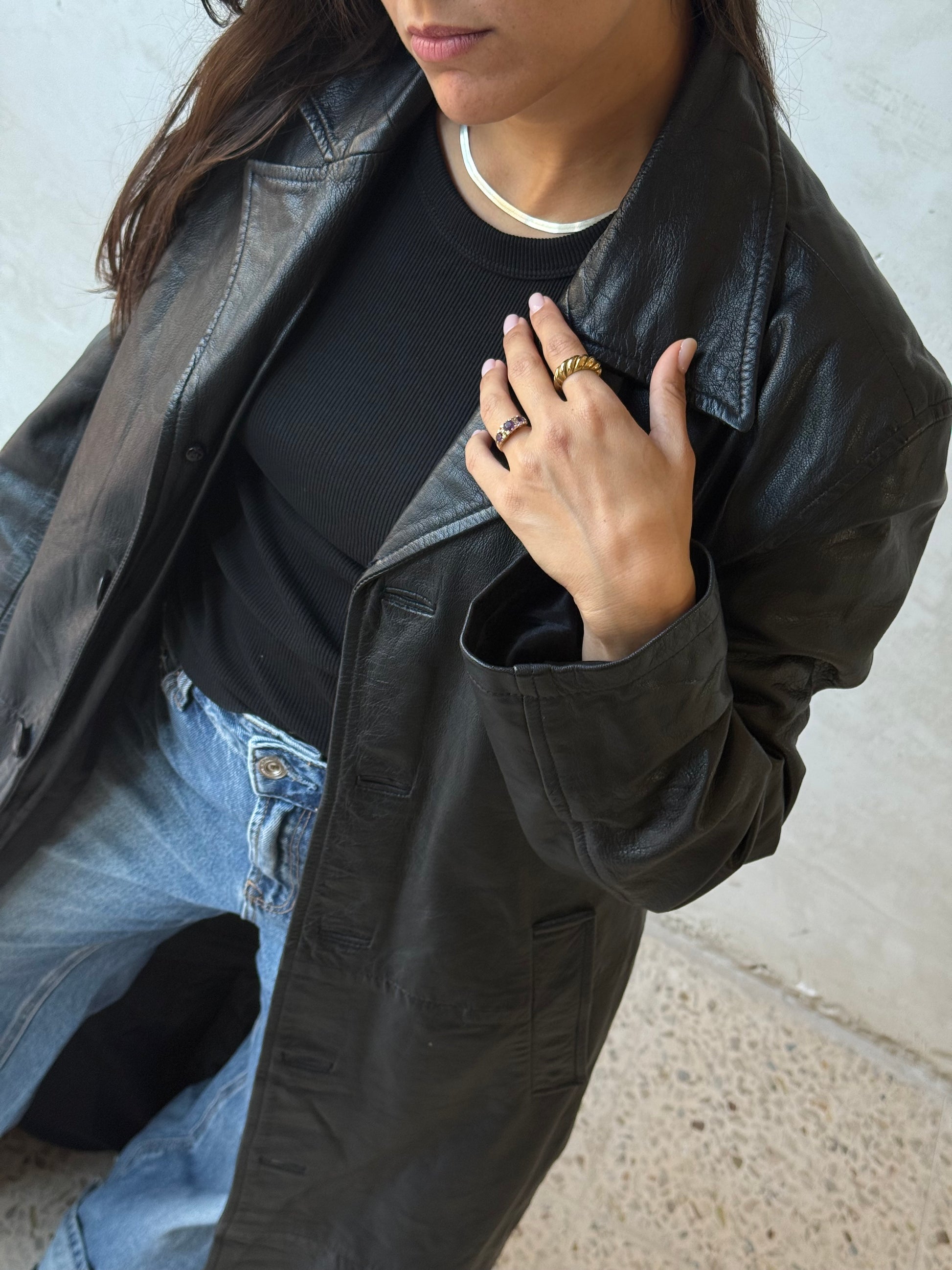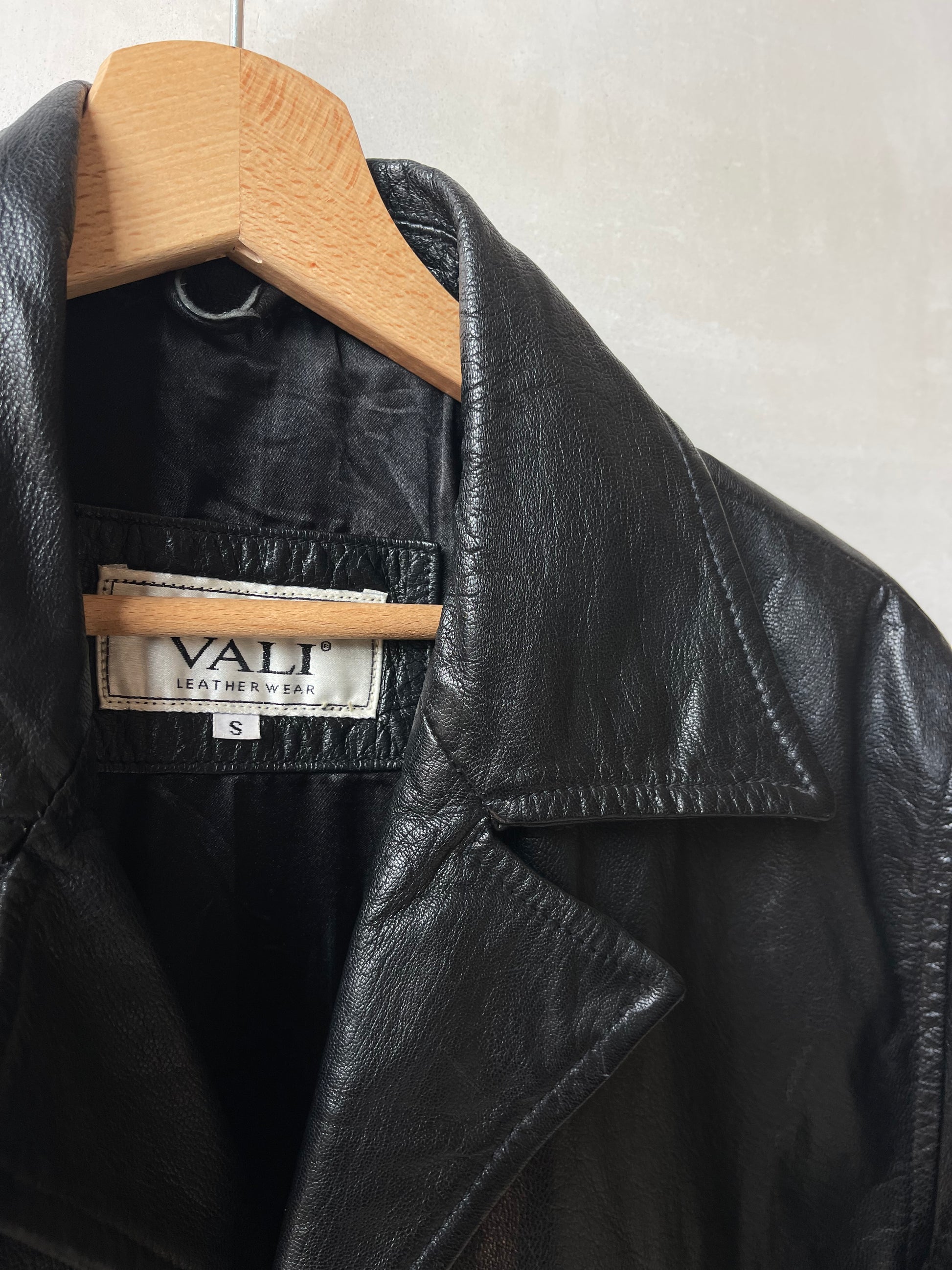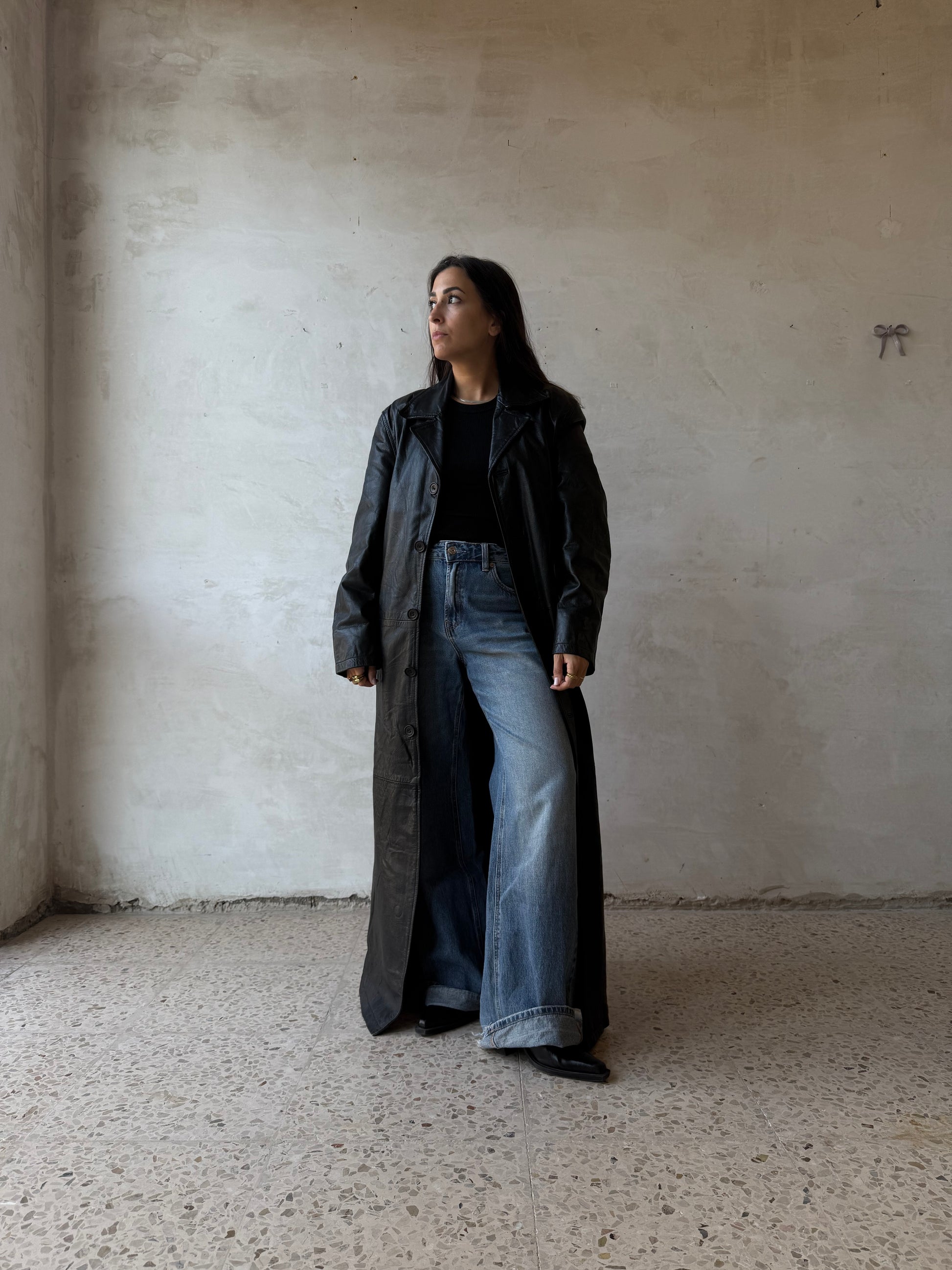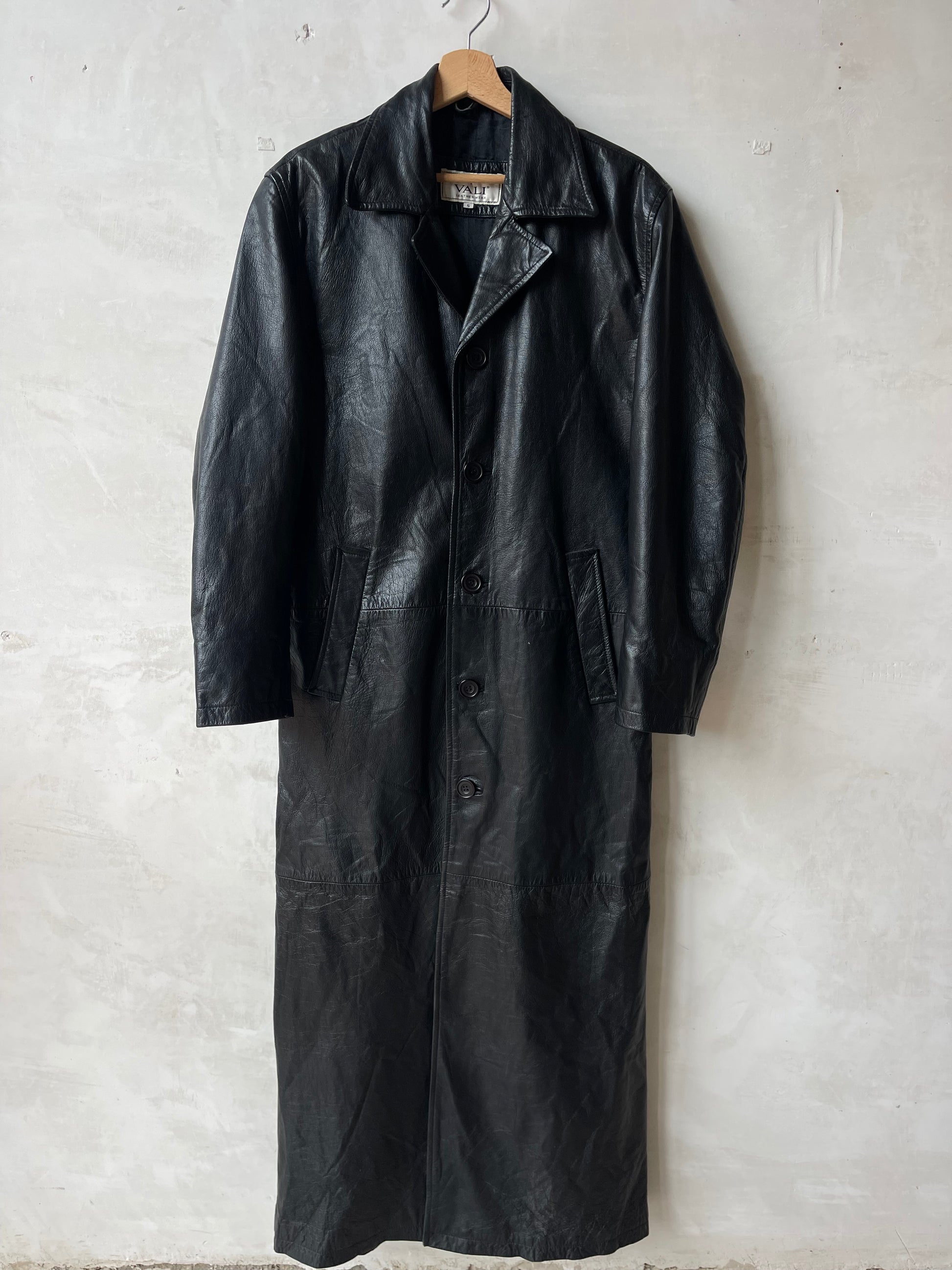 Cappotto lungo in vera pelle nera, taglia S. Modello dritto e lungo fino alla caviglia. Colletto rever classico, chiusura monopetto con cinque bottoni frontali, due tasche a filetto laterali. Maniche lunghe regolari, costruzione semplice senza cuciture o decorazioni evidenti.