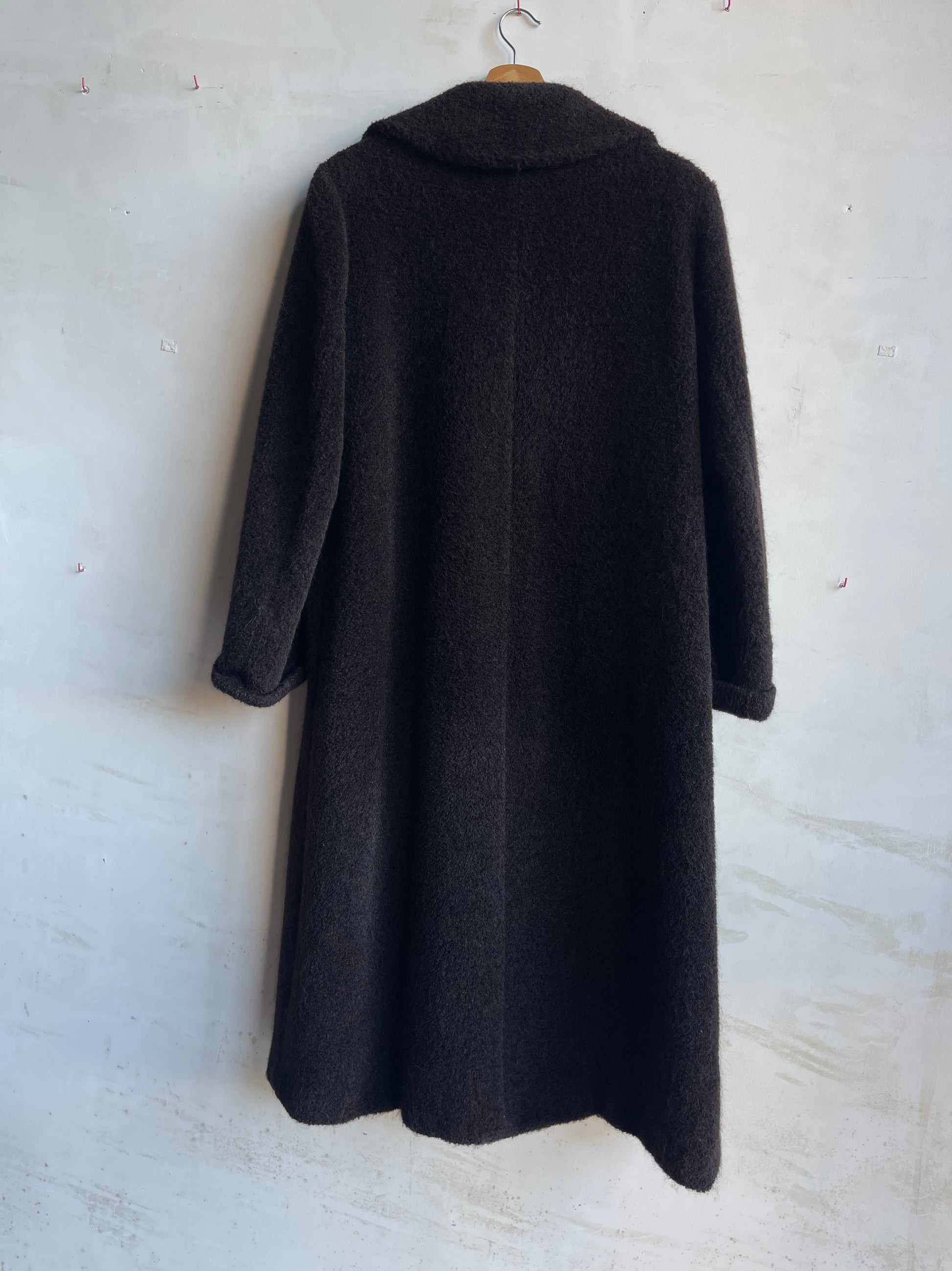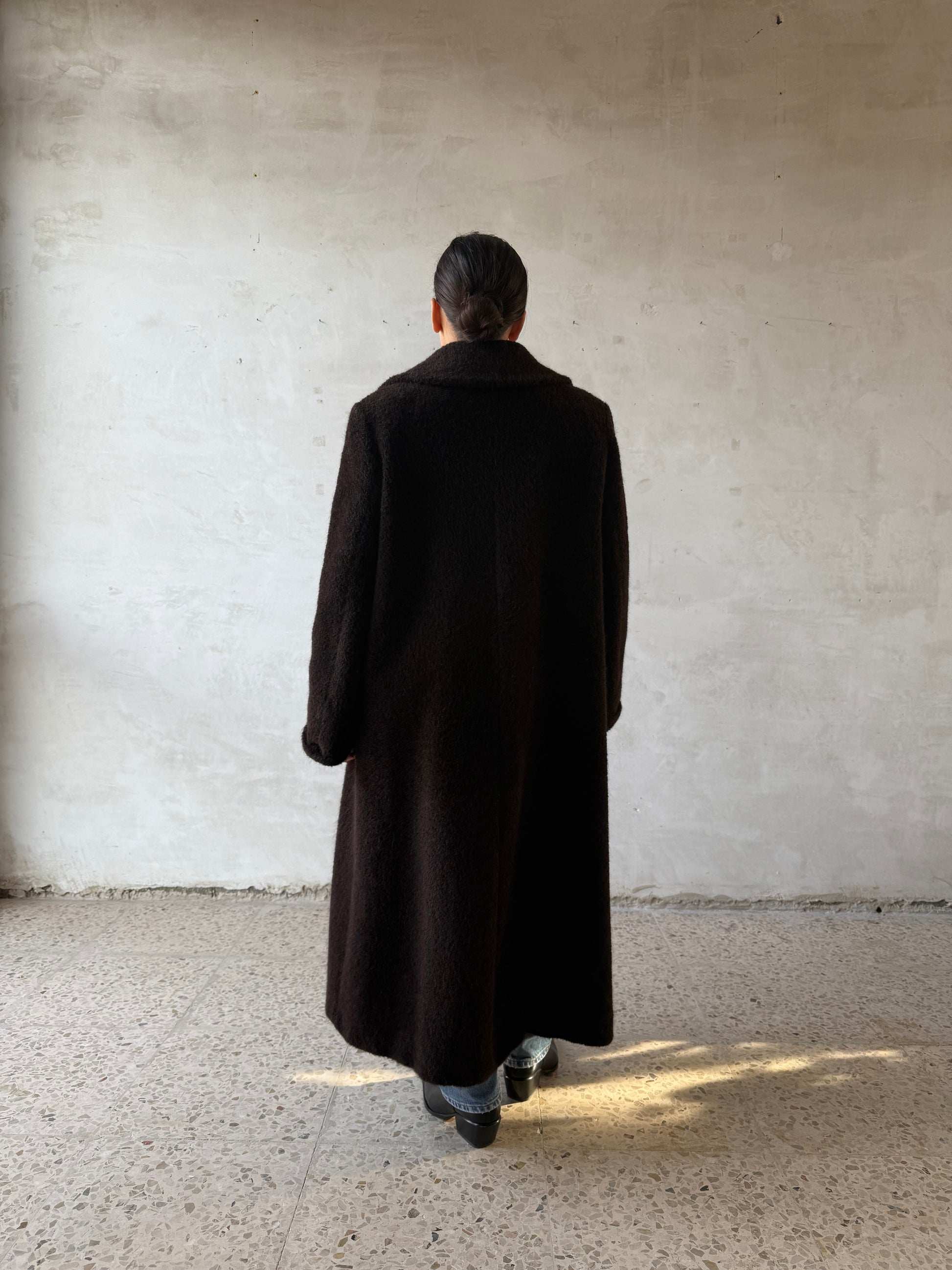 Cappotto Max Mara lungo in una ricca tonalità di marrone scuro, realizzato in 56% alpaca e 44% lana vergine. Modello doppio petto dalla linea diritta, con rever ampio e tasche laterali. Taglia riportata 42, veste comodamente 40/42.