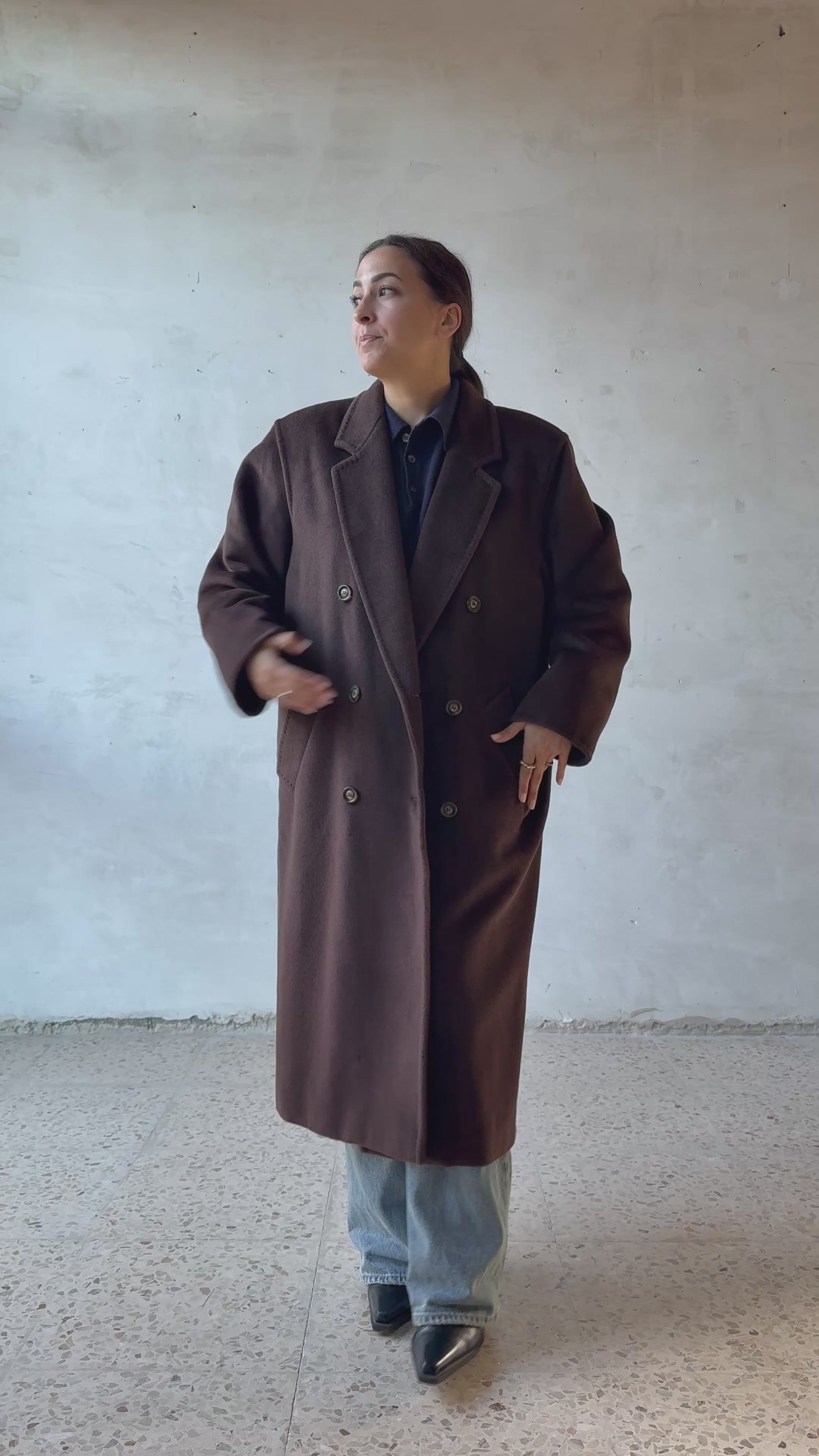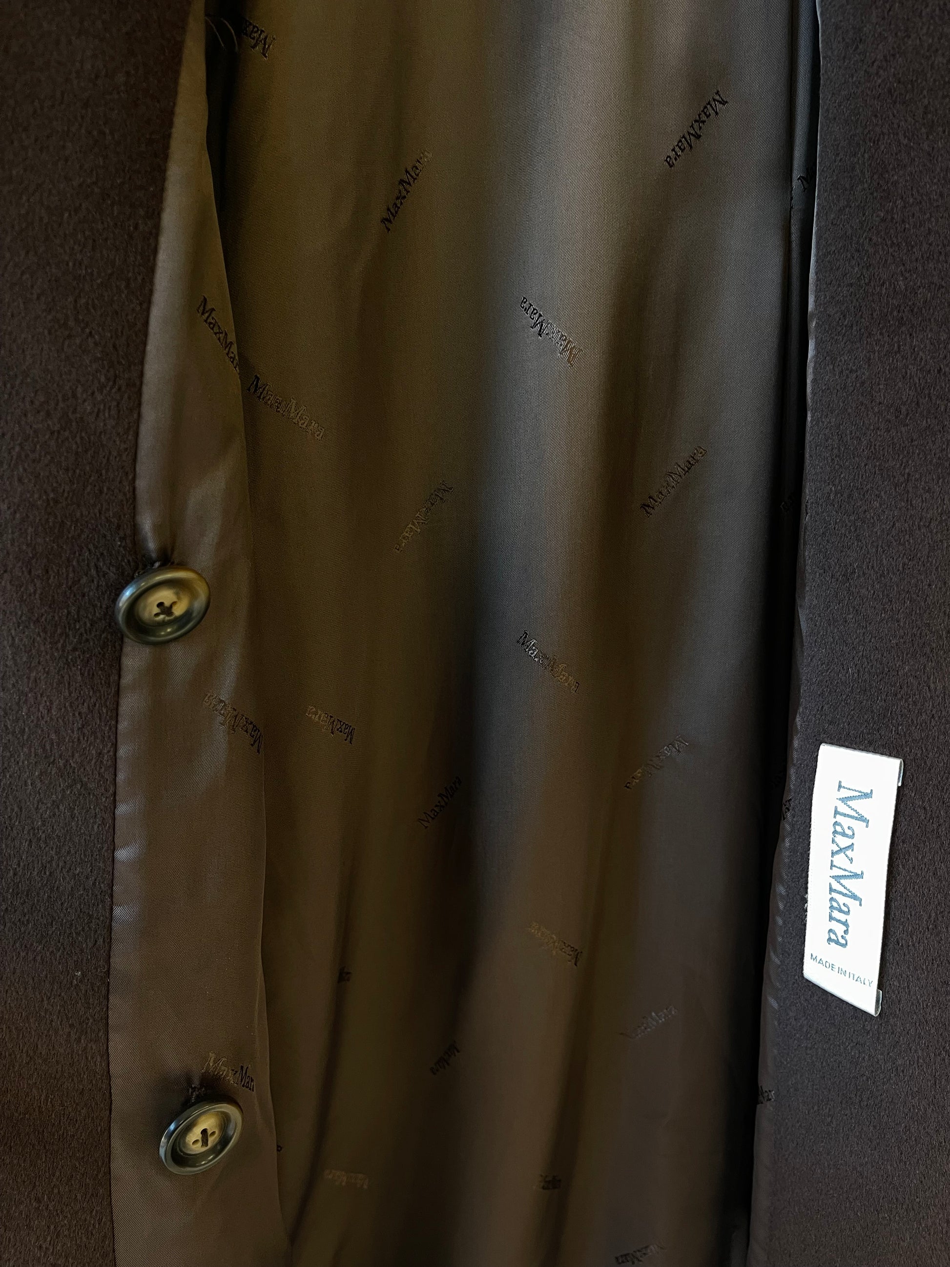 Cappotto Max Mara vintage doppiopetto in 100% lana, colore marrone scuro.