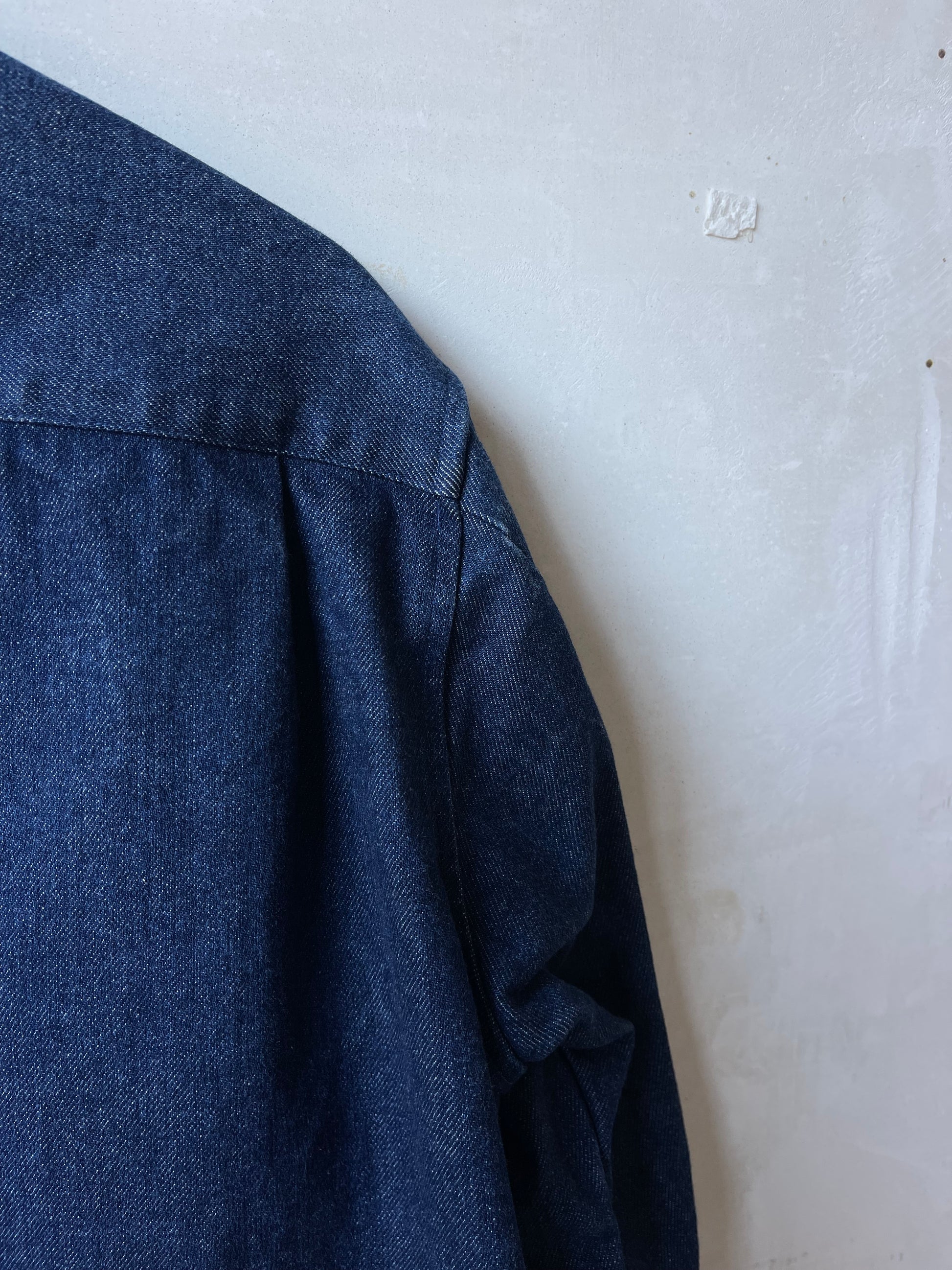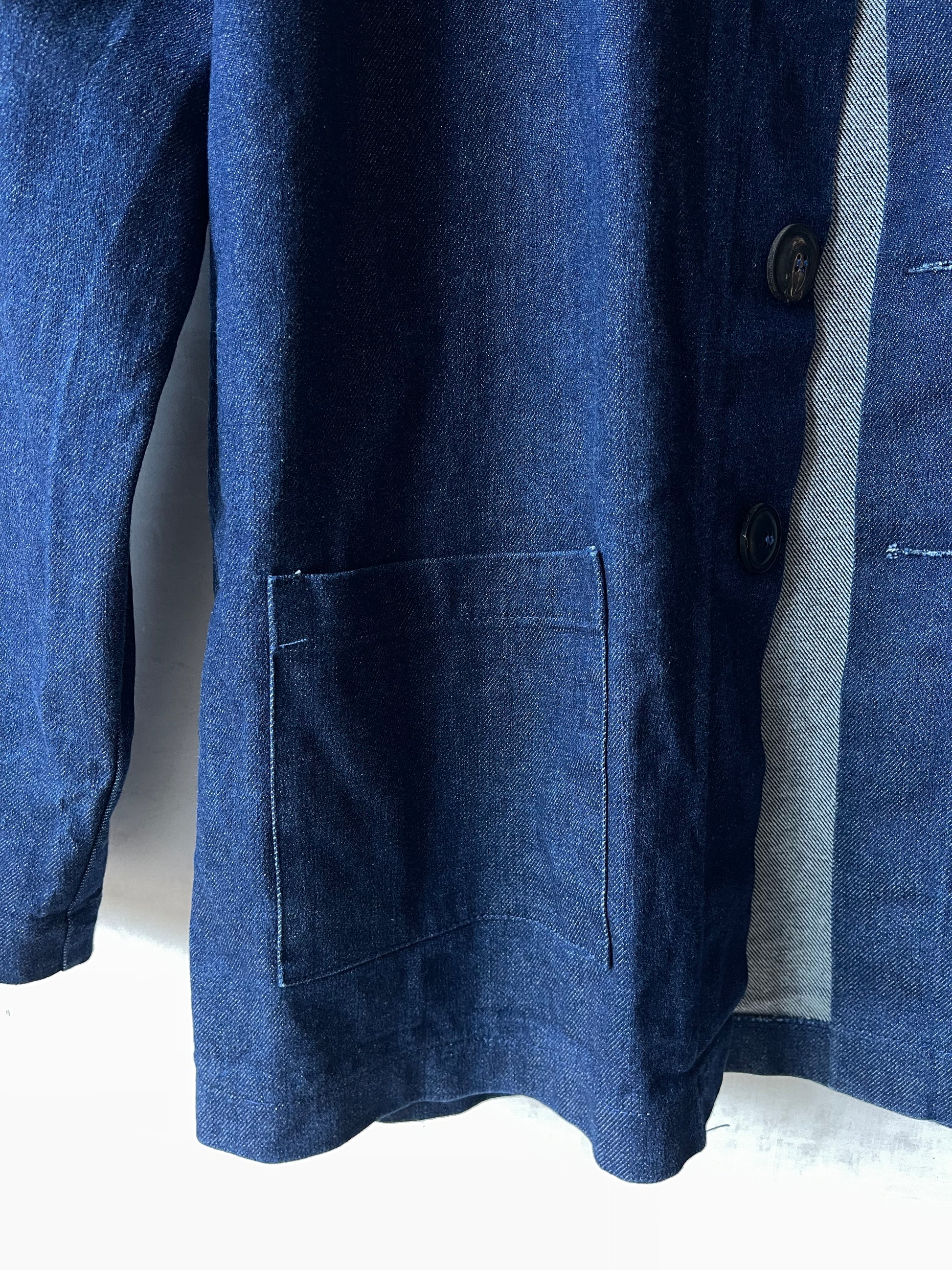 Giacca in denim colore blu indigo, taglio dritto e morbido, lunghezza sui fianchi. Collo tondo privo di rever, chiusura frontale con cinque bottoni neri in plastica, polsini semplici senza bottoni. Due tasche applicate sul davanti. Manica lunga con cucitura spostata leggermente in avanti.