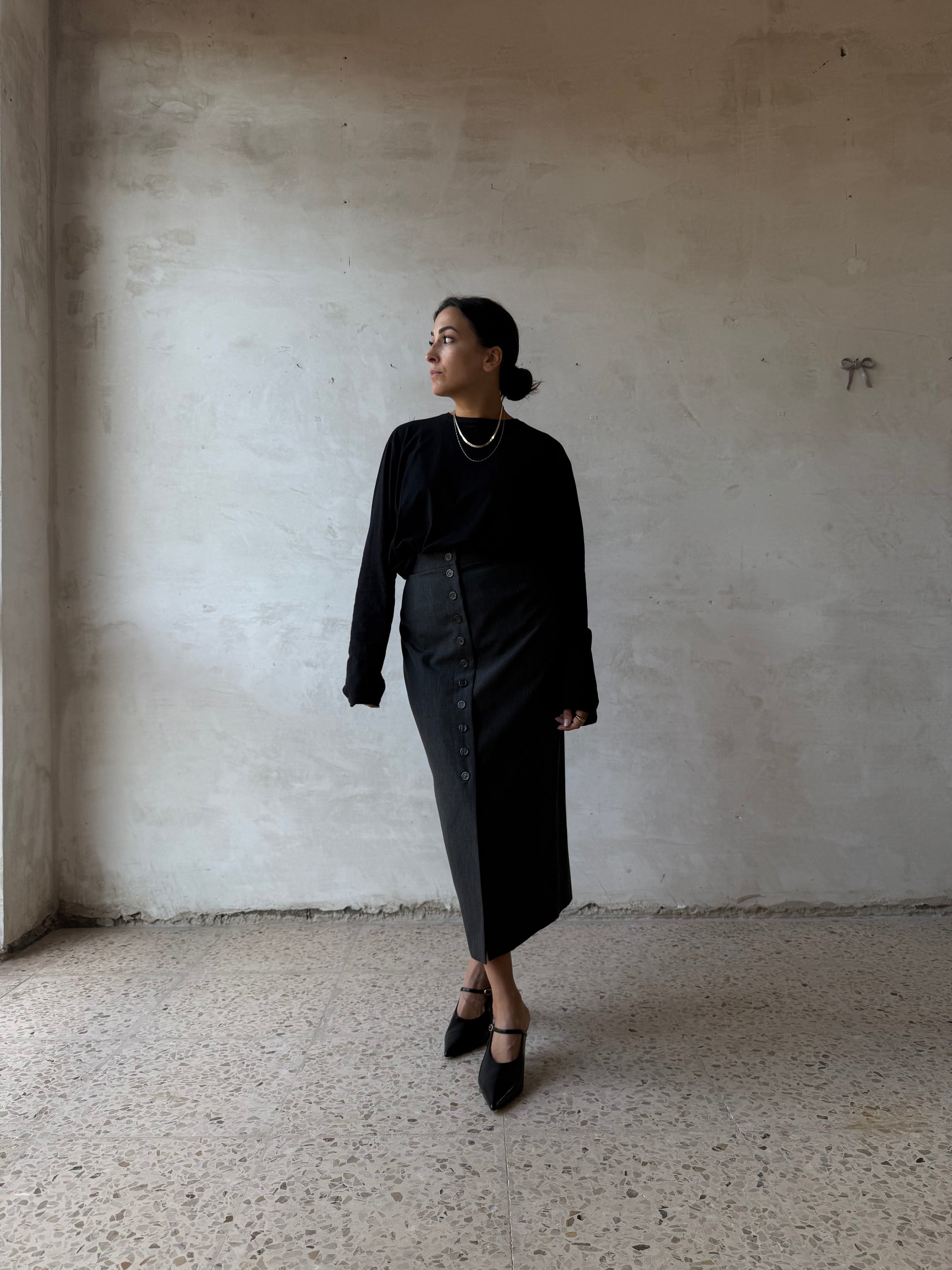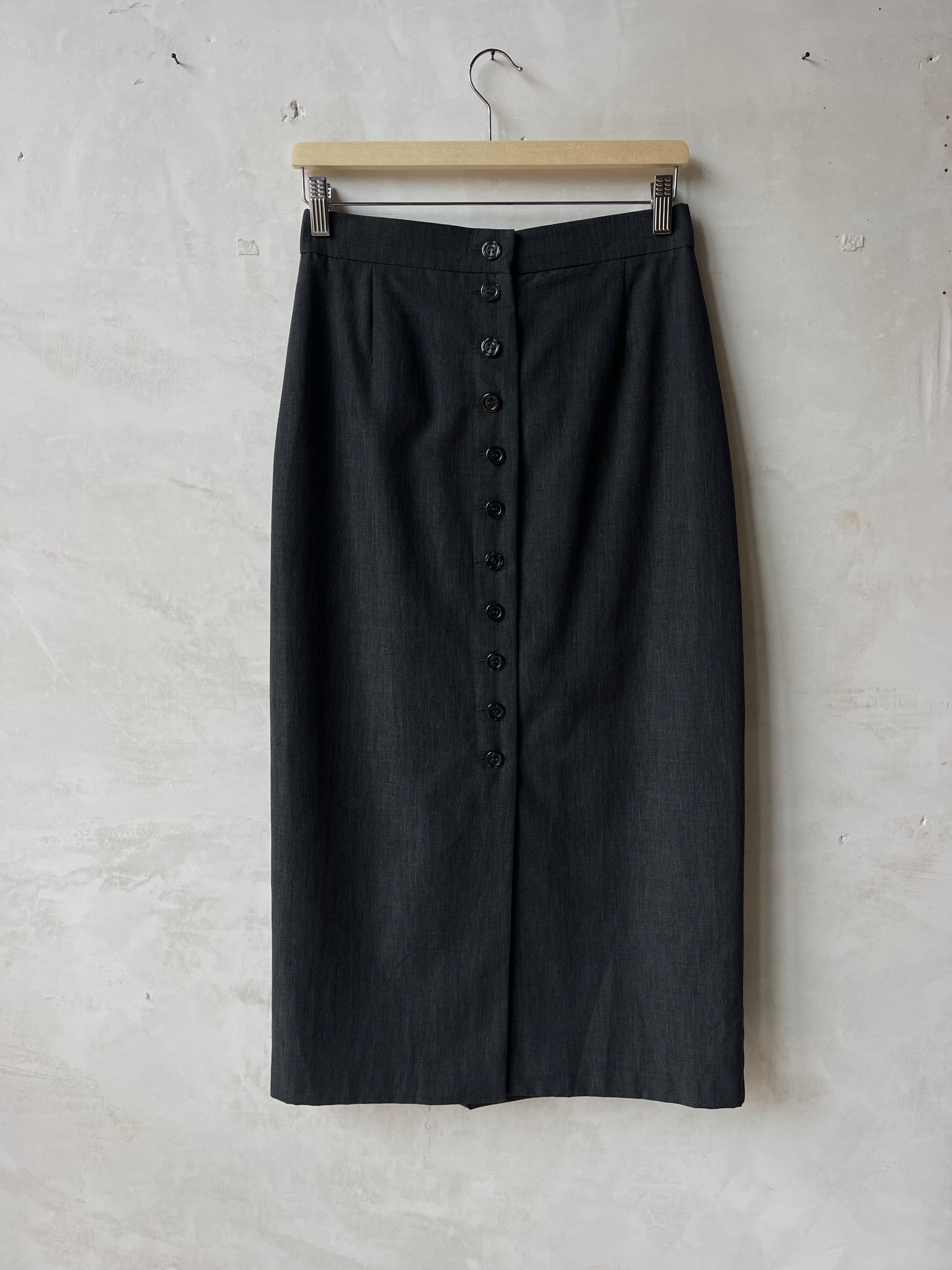 Gonna longuette grigio antracite, linea dritta. Chiusura frontale con otto bottoni tono su tono. Tessuto compatto e leggermente elasticizzato, non foderata.