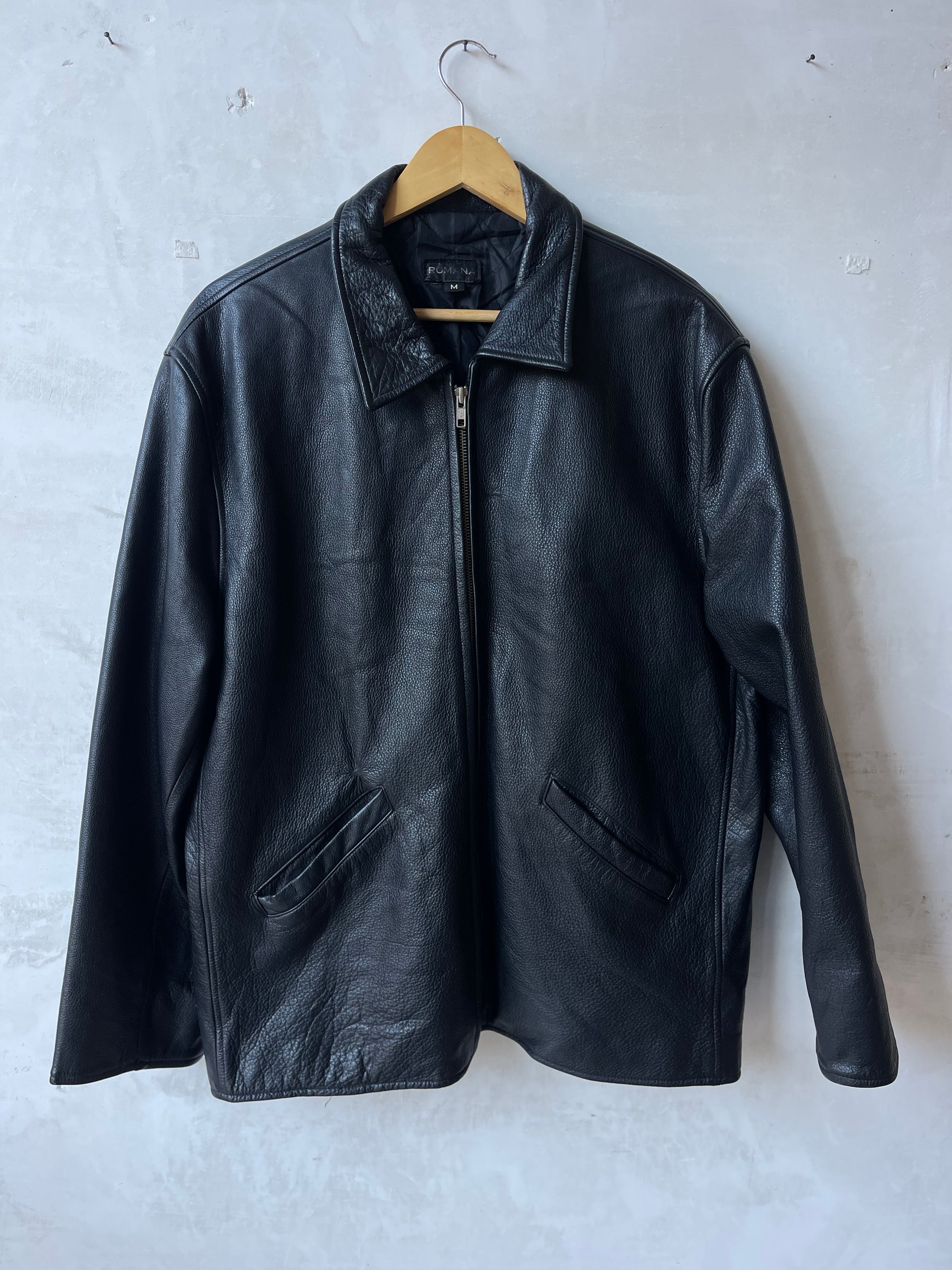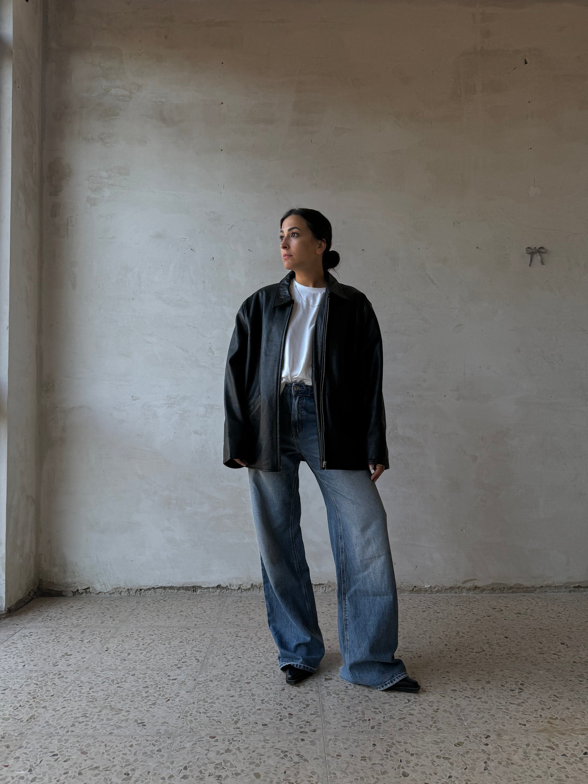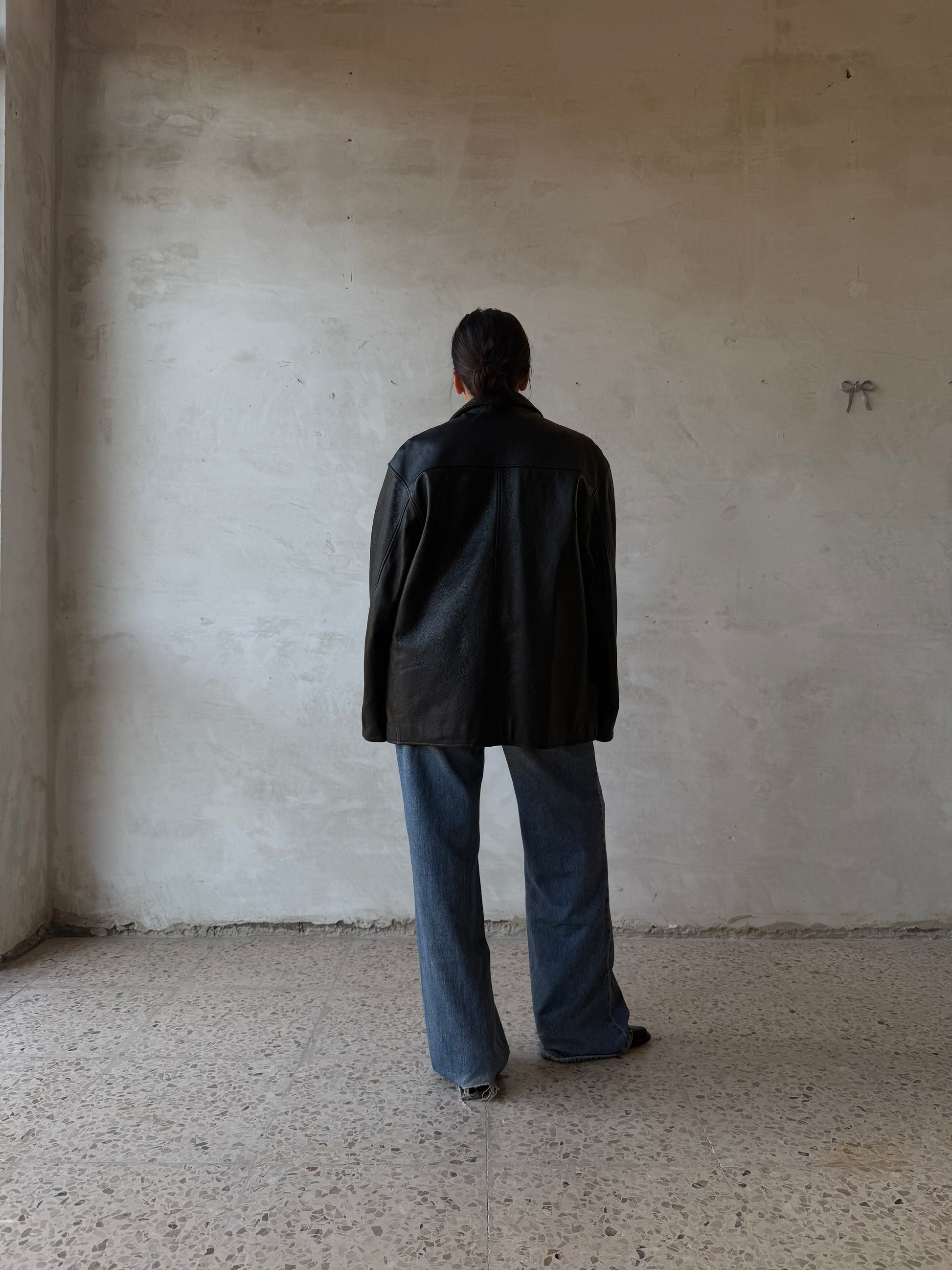 Giacca in vera pelle nera, modello oversize con linea morbida e lunghezza sui fianchi. Colletto classico e chiusura frontale con zip in metallo. Due tasche laterali a filetto, nessuna cucitura doppia visibile, fondo dritto.