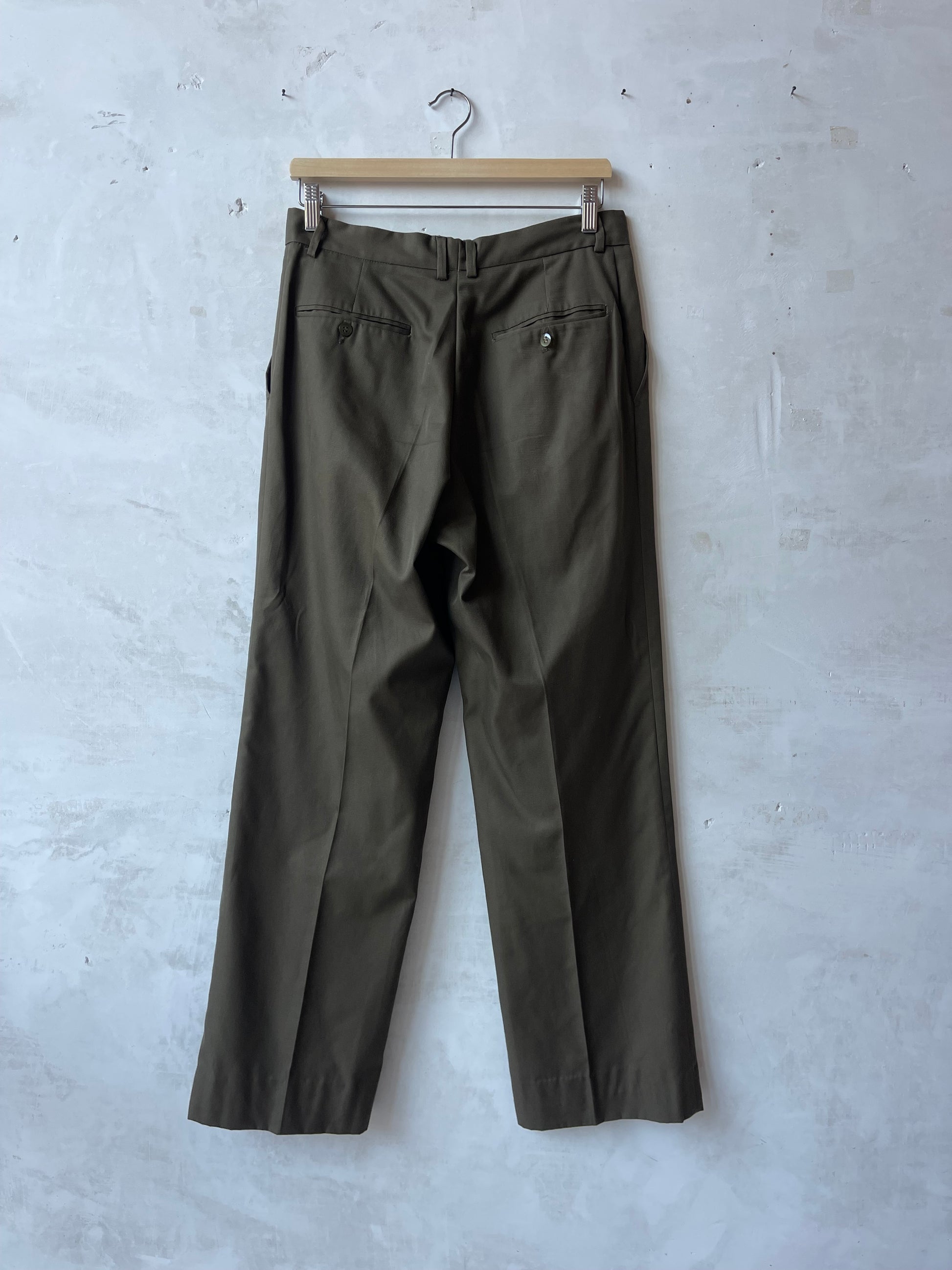 Pantalone sartoriale da donna color verde oliva, modello regular fit. Vita media, passanti per cintura, chiusura con bottone e zip coperta. Due tasche anteriori oblique, piega stirata centrale lungo la gamba, due tasche a filetto con bottone sul retro.