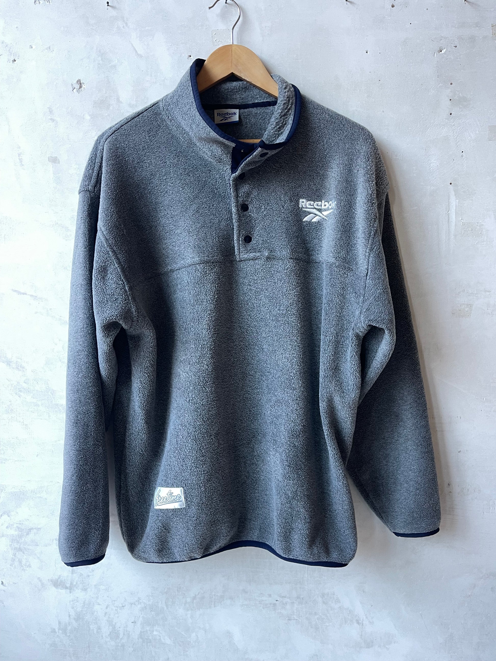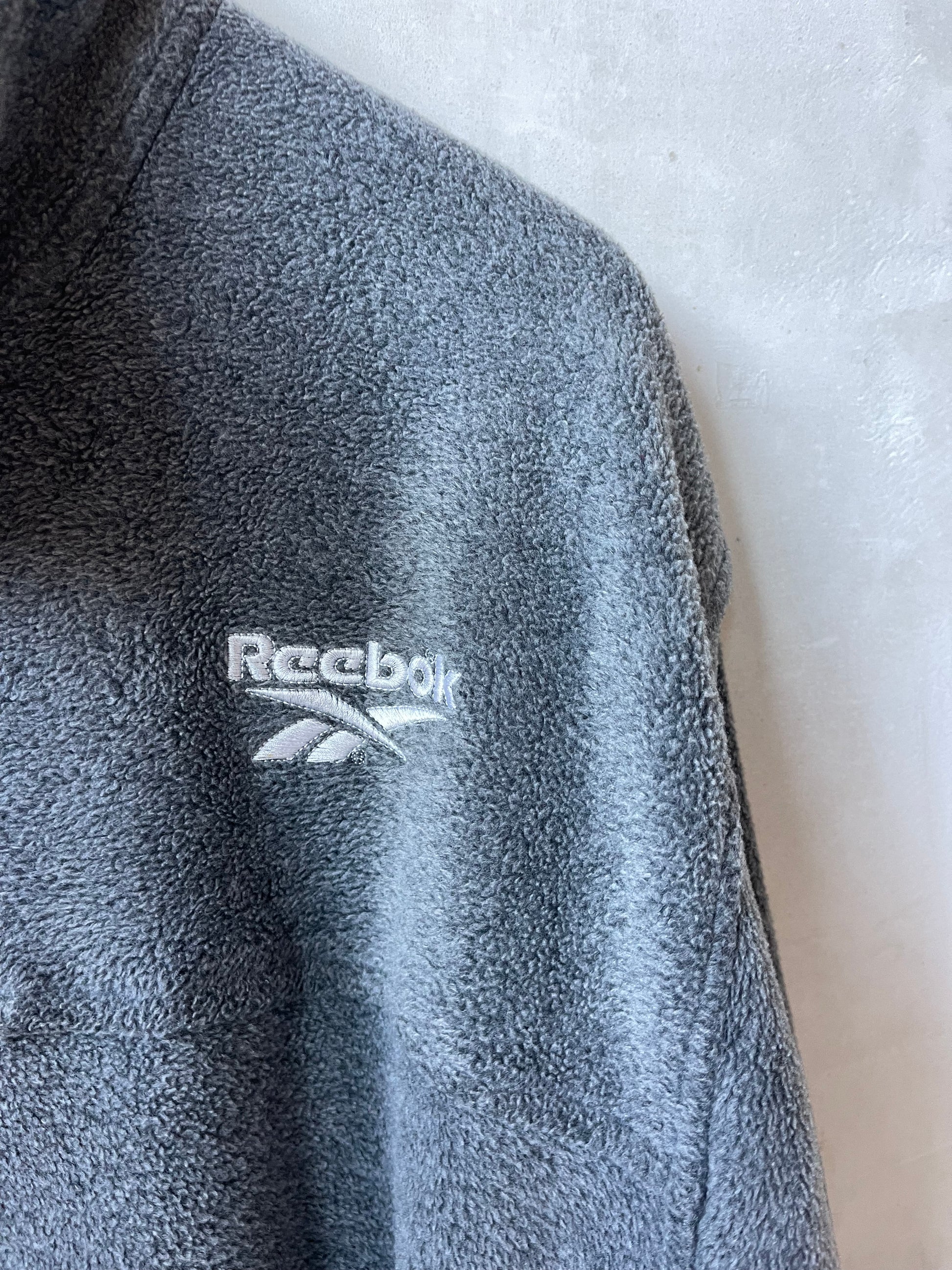 Pile Reebok vintage grigio, modello unisex. Collo alto con chiusura a 3 bottoni, logo Reebok ricamato sul petto. Fondo e polsi rifiniti a contrasto. Tasche laterali nascoste. Taglia ampia, tessuto caldo e morbido. Taglia riportata M
