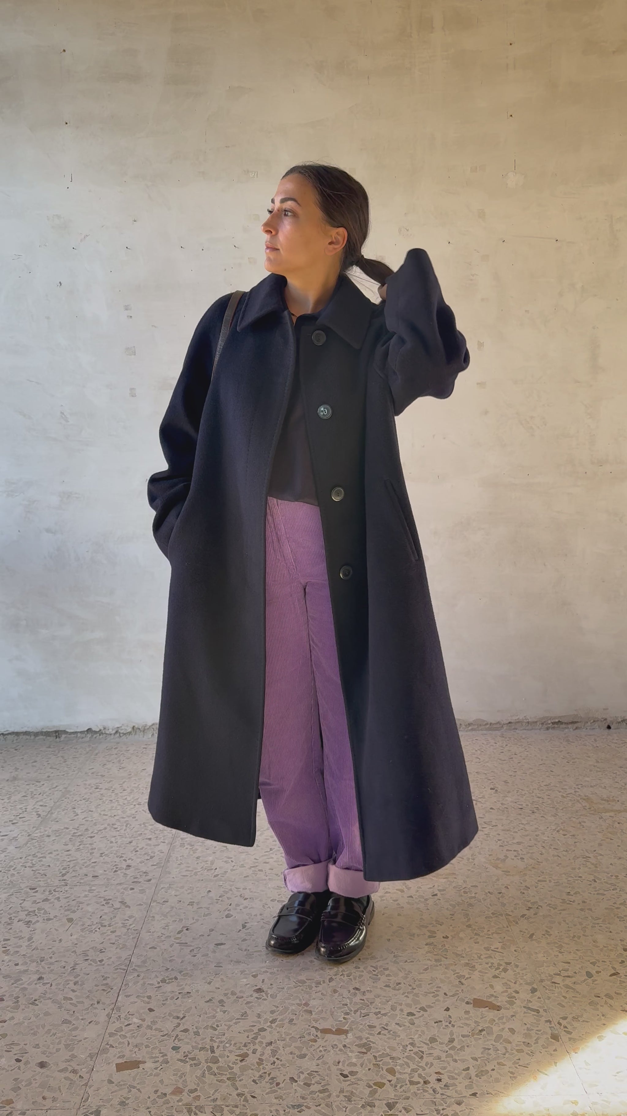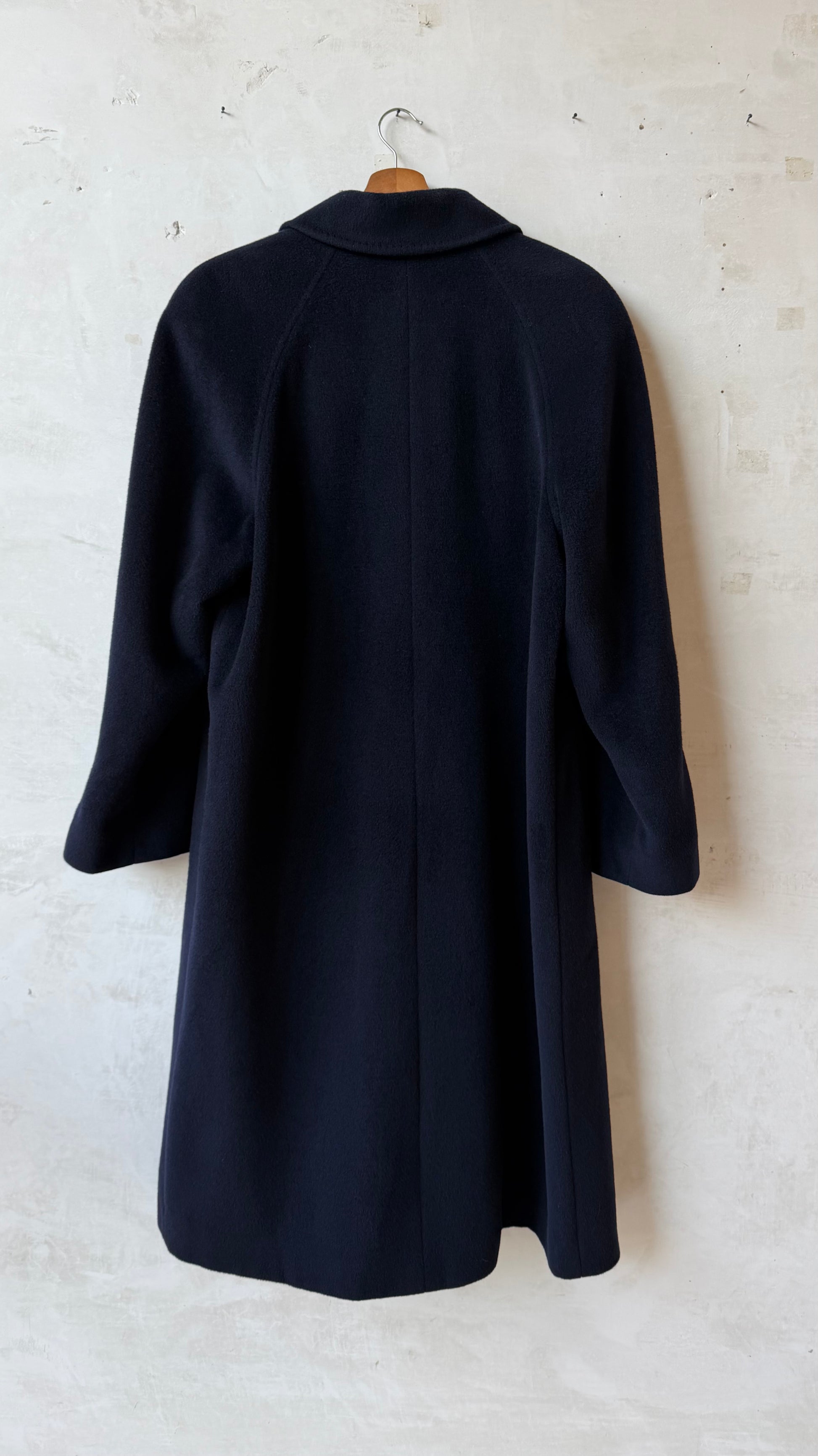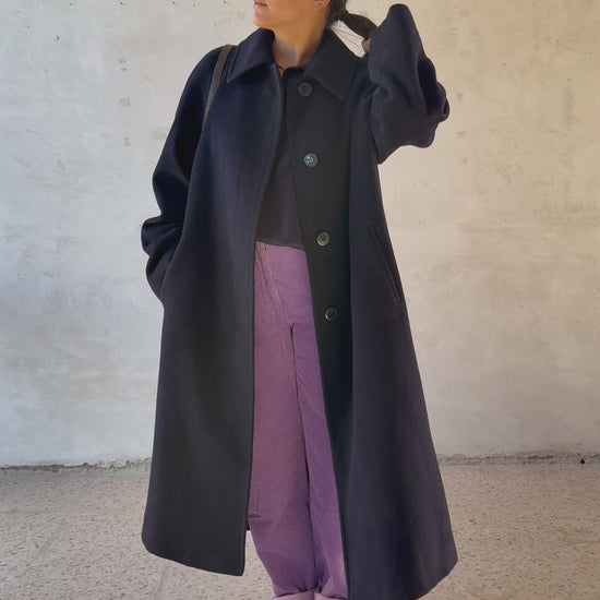 Cappotto lungo blu in pura lana, taglio sartoriale con linea pulita e strutturata, tessuto compatto con buona consistenza, colore blu intenso e vibrante, chiusura frontale con bottoni, revers classici, spalla raglan che garantisce maggiore libertà di movimento e vestibilità confortevole, piuttosto lungo.
