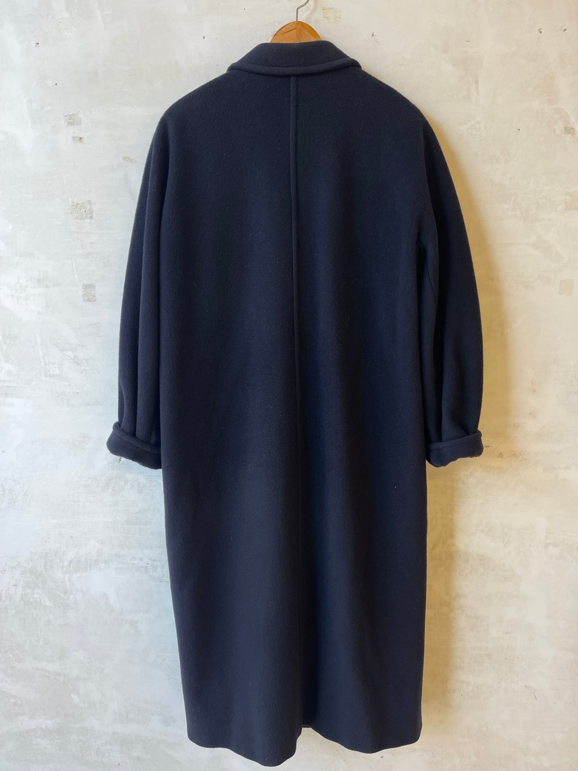Cappotto Marella vintage blu, modello doppiopetto, realizzato in panno di lana con struttura compatta e mano piena. Linea lunga e pulita, con rever ampi, chiusura a sei bottoni e tasche laterali a filetto. Spalla leggermente strutturata con spallina interna removibile, che consente di adattare la caduta del capo in base alla preferenza. Interno completamente foderato, costruzione sartoriale tipica della produzione Marella Made in Italy. Colore blu profondo uniforme.