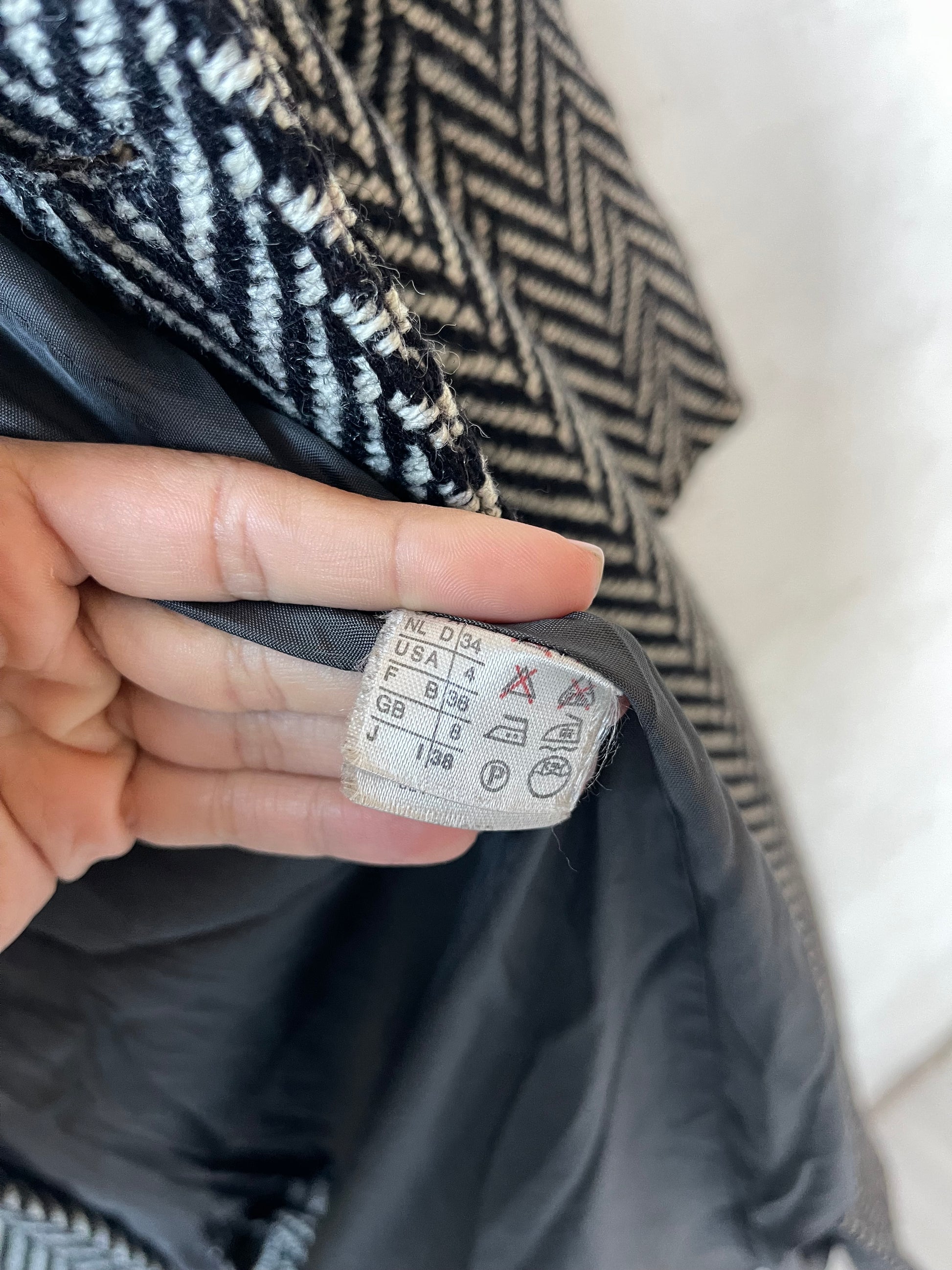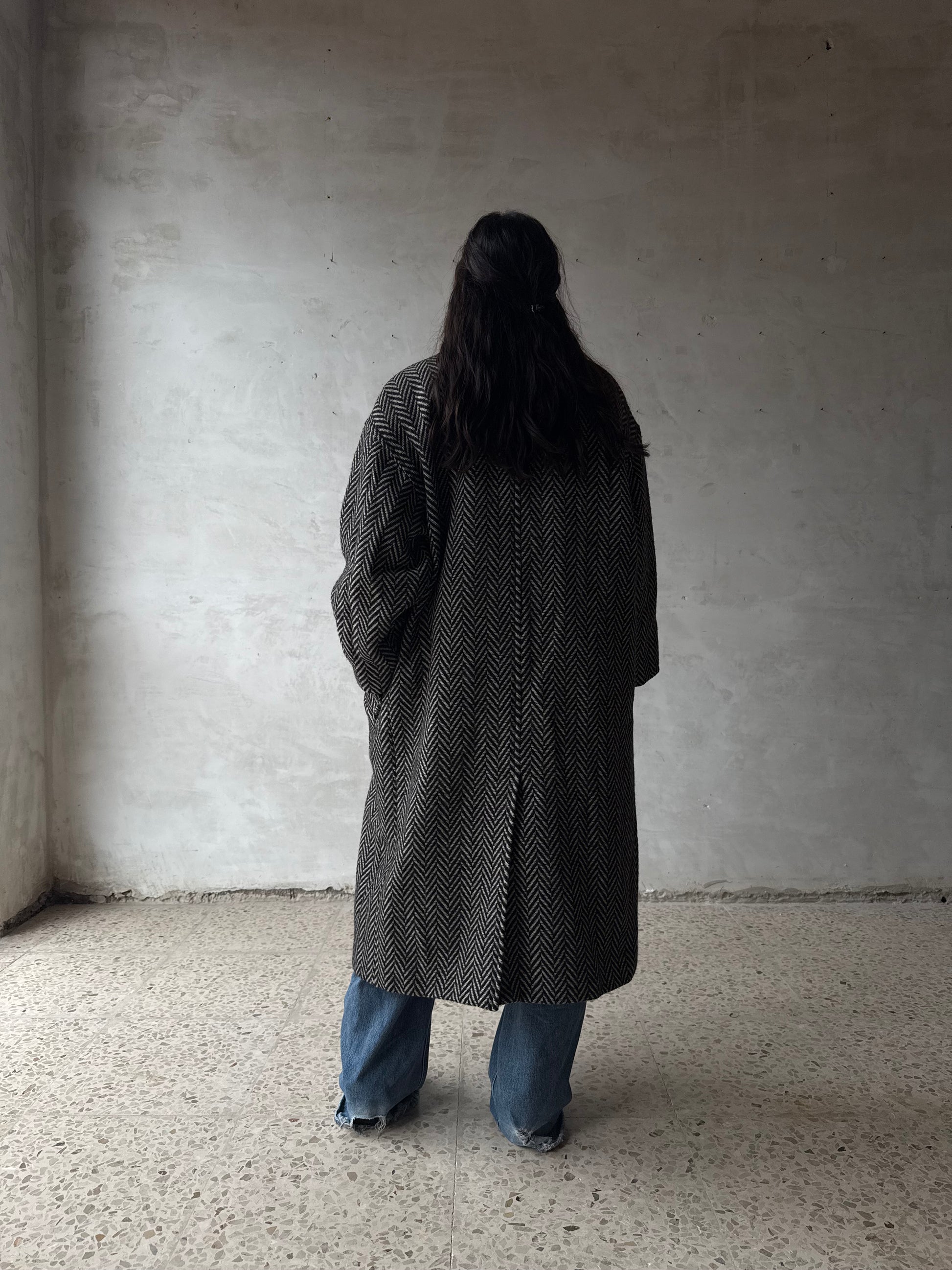 Cappotto Marella vintage dal motivo spigato bianco-nero. Realizzato in 100% lana vergine, con fodera interna in viscosa. Presenta rever classico, maniche dritte e linea over d’ispirazione anni ’80. Chiusura frontale con bottone a vista e comode tasche laterali.