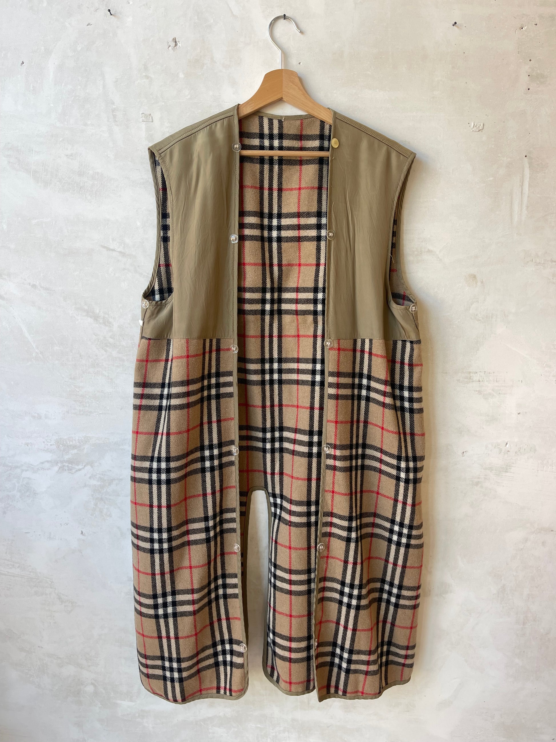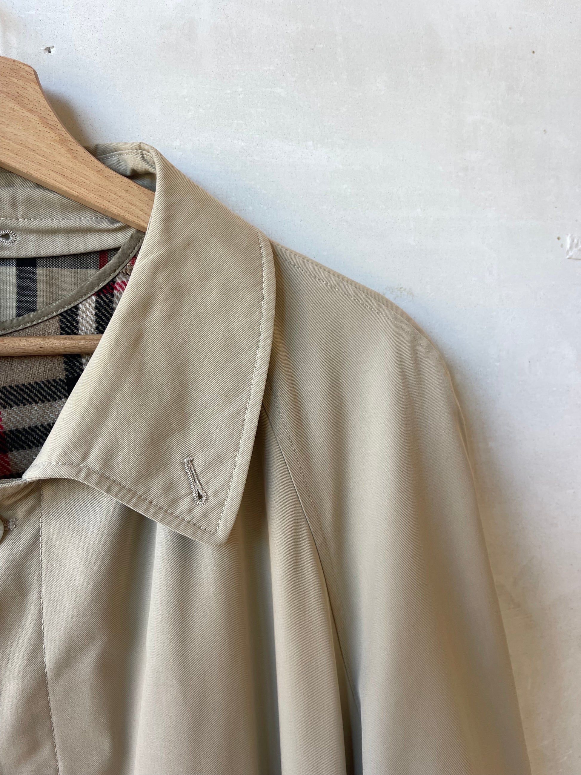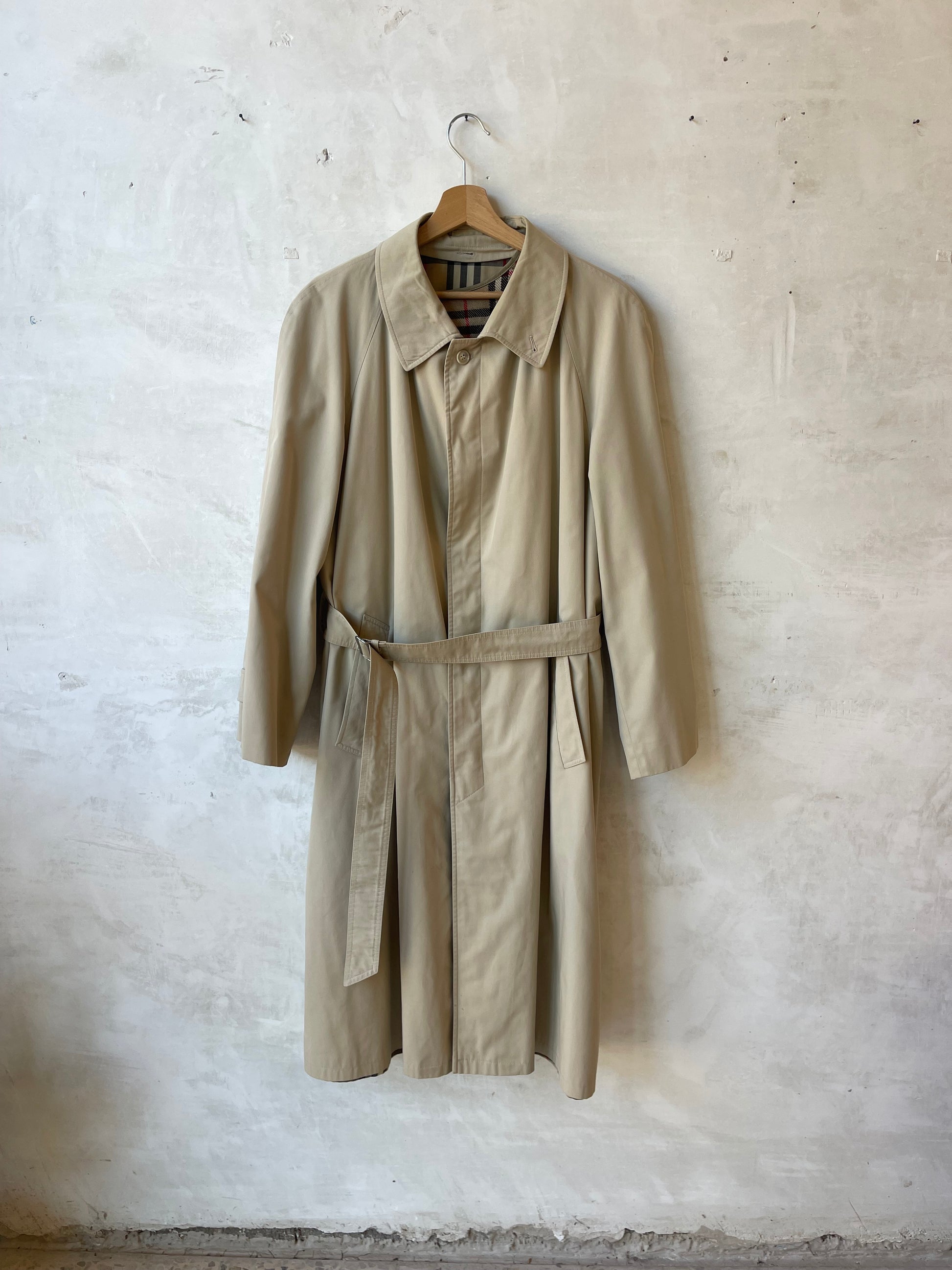 Trench lungo in cotone beige chiaro, con colletto a camicia e chiusura frontale con bottoni nascosti. La cintura coordinata in vita, dotata di fibbia in metallo, permette di regolare la vestibilità. Presenta tasche laterali inserite nella cucitura e spacco posteriore per una maggiore libertà di movimento. Spalla raglan. È dotato di una fodera interna rimovibile che lo rende un capo adatto a più stagioni.