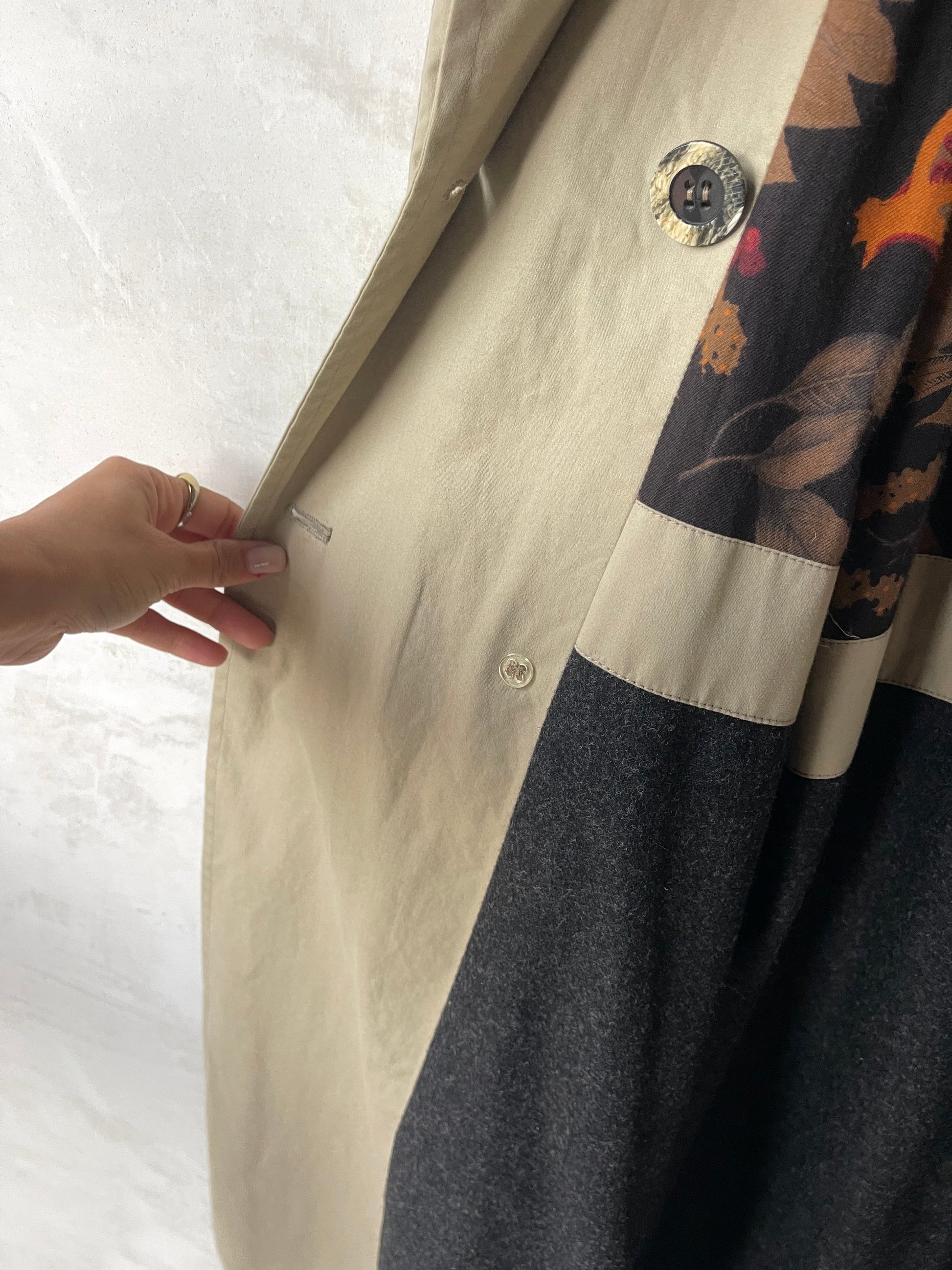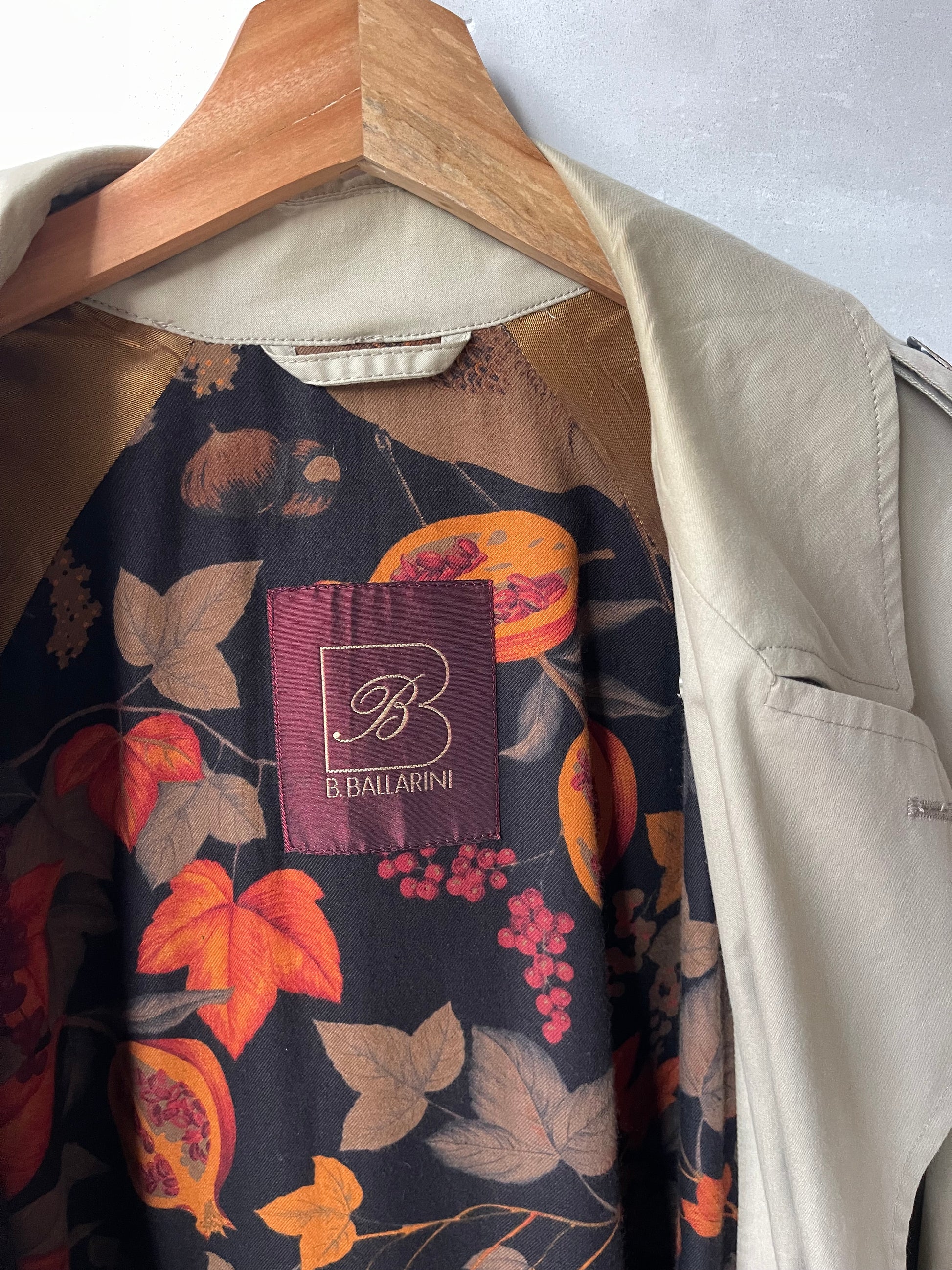 Trench lungo in cotone beige con finitura opaca. Chiusura doppiopetto con bottoni, cintura in tessuto coordinata e passanti in vita, spalline con alamari, polsini regolabili con cinturino e bottoni. Pattina antivento sia sul davanti che sul retro, manica raglan per una caduta morbida. Fodera interna fantasia con motivi autunnali e tasca interna. Tasche laterali inclinate.