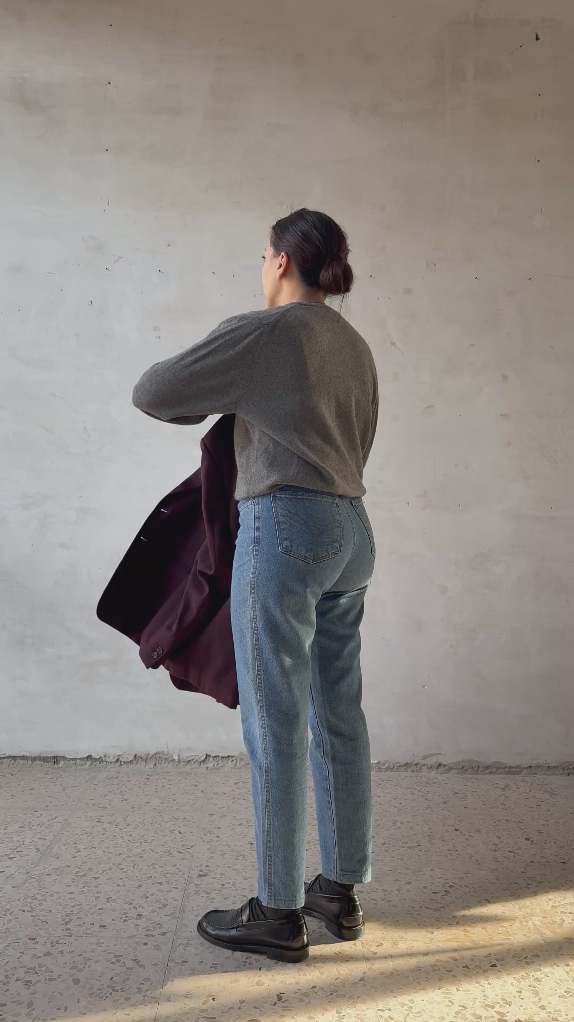 Jeans in denim blu medio, classico lavaggio stonewash anni 90, con struttura bella compatta e quella mano leggermente rigida che tiene la forma senza fare pieghe strane. Vita alta, silhouette dritta che scende leggermente affusolata verso il fondo, cinque tasche e cuciture a contrasto.