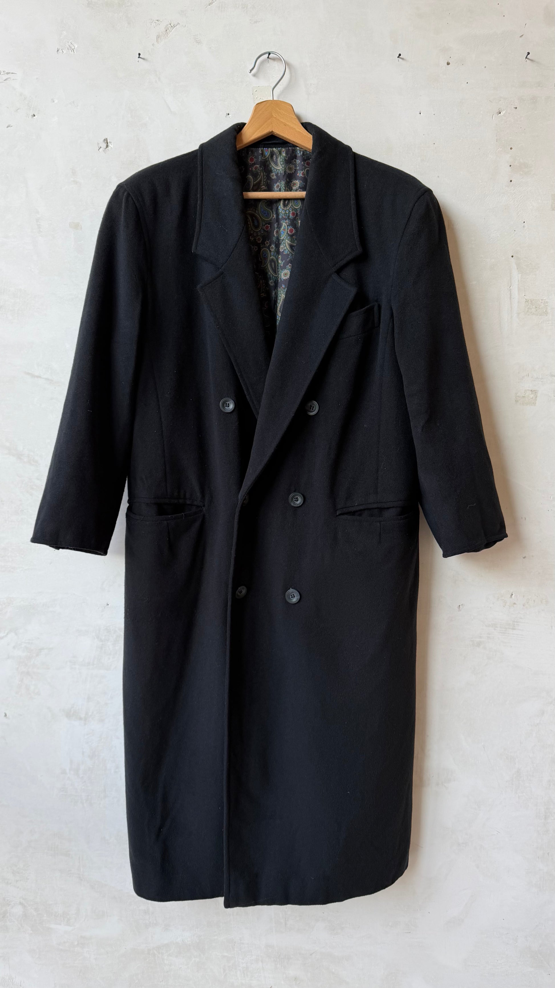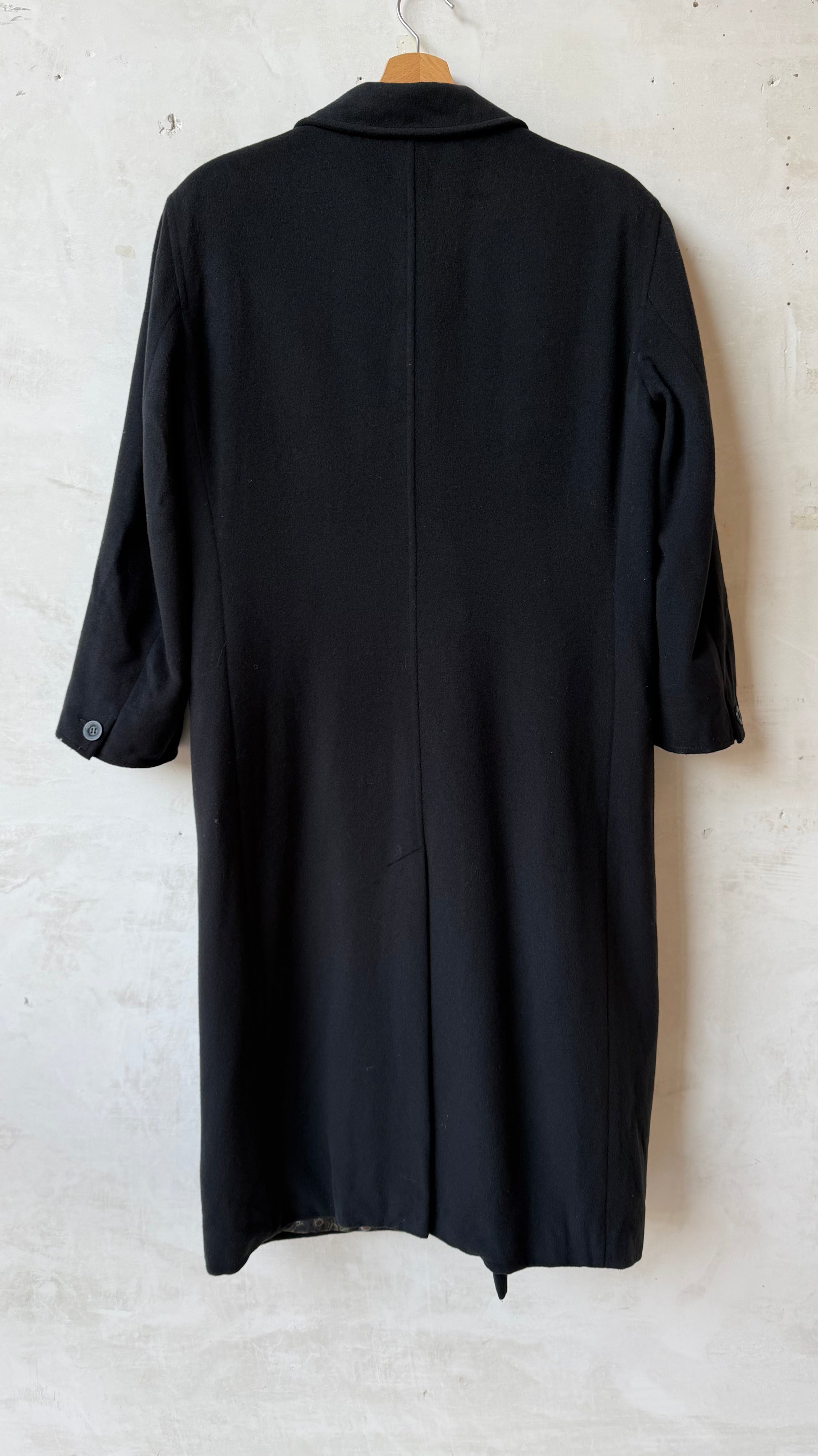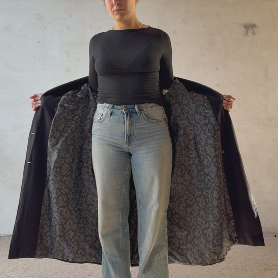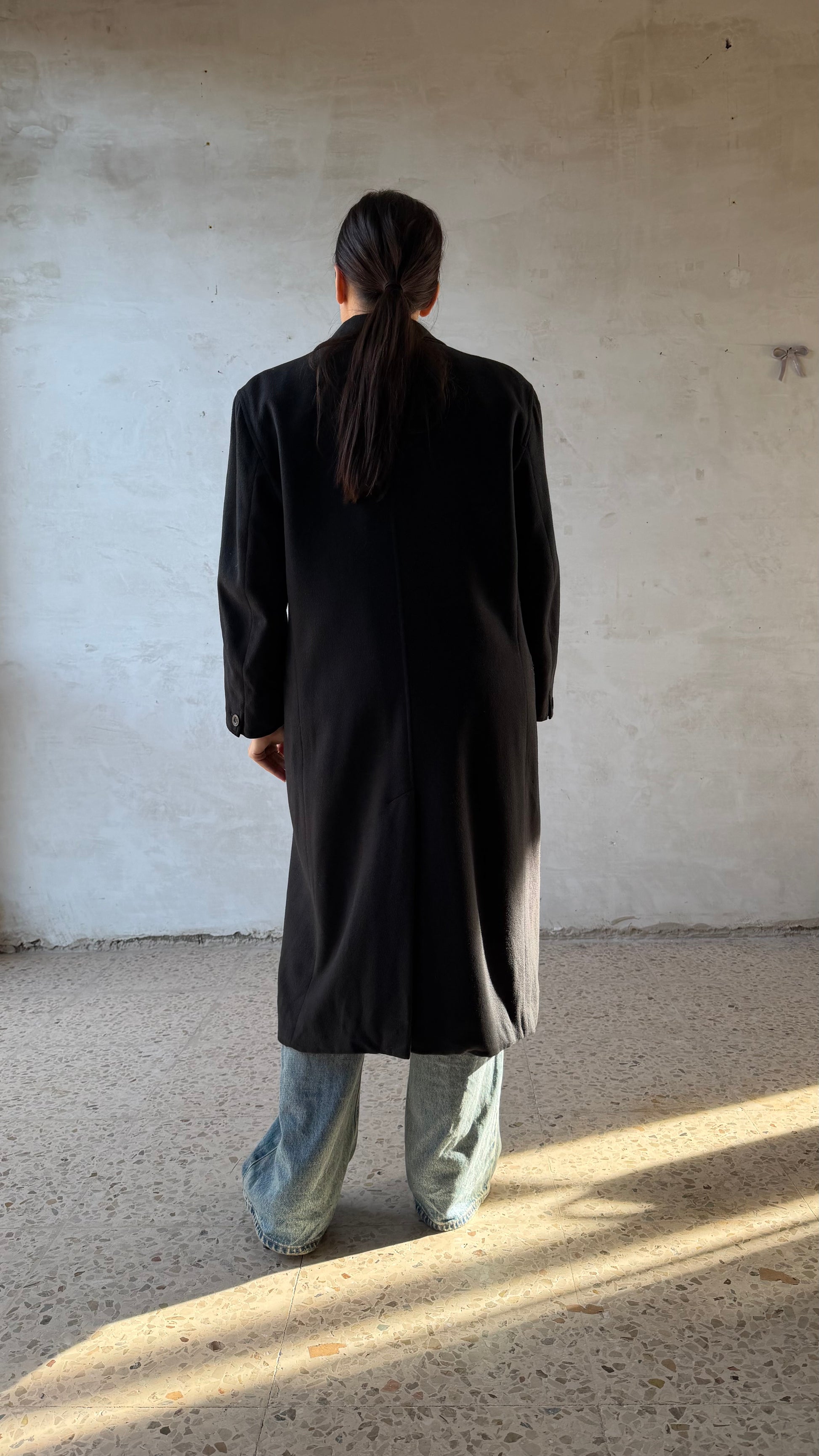 Cappotto lungo nero dal taglio sartoriale con linea pulita e strutturata, tessuto compatto con buona consistenza, colore nero intenso, chiusura frontale doppiopetto con bottoni, revers ampi e classici, spalle ben definite che seguono la linea naturale del corpo garantendo una vestibilità elegante e confortevole.