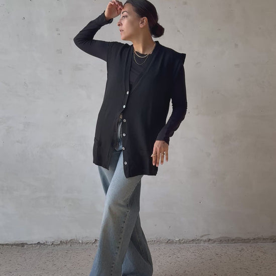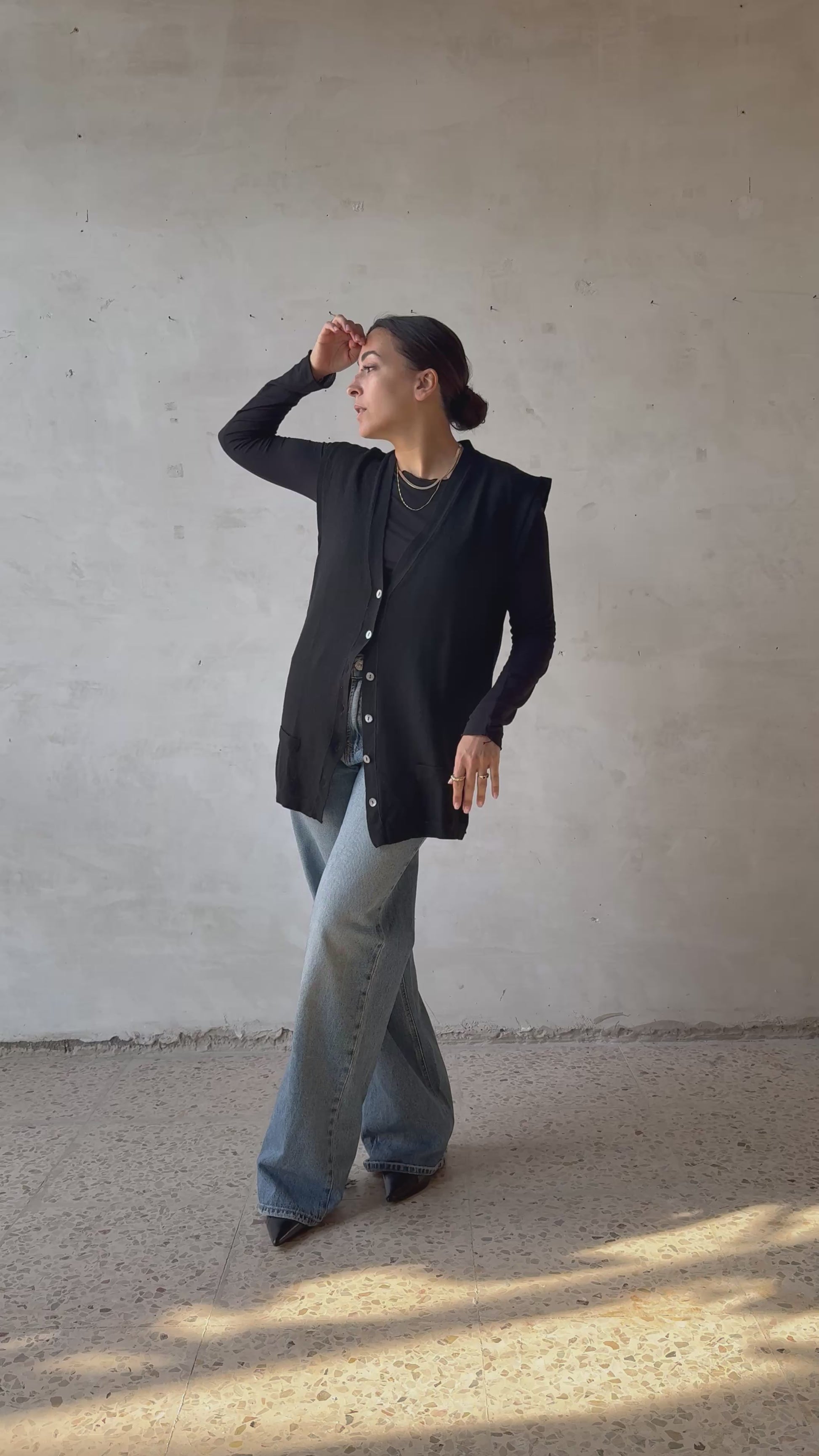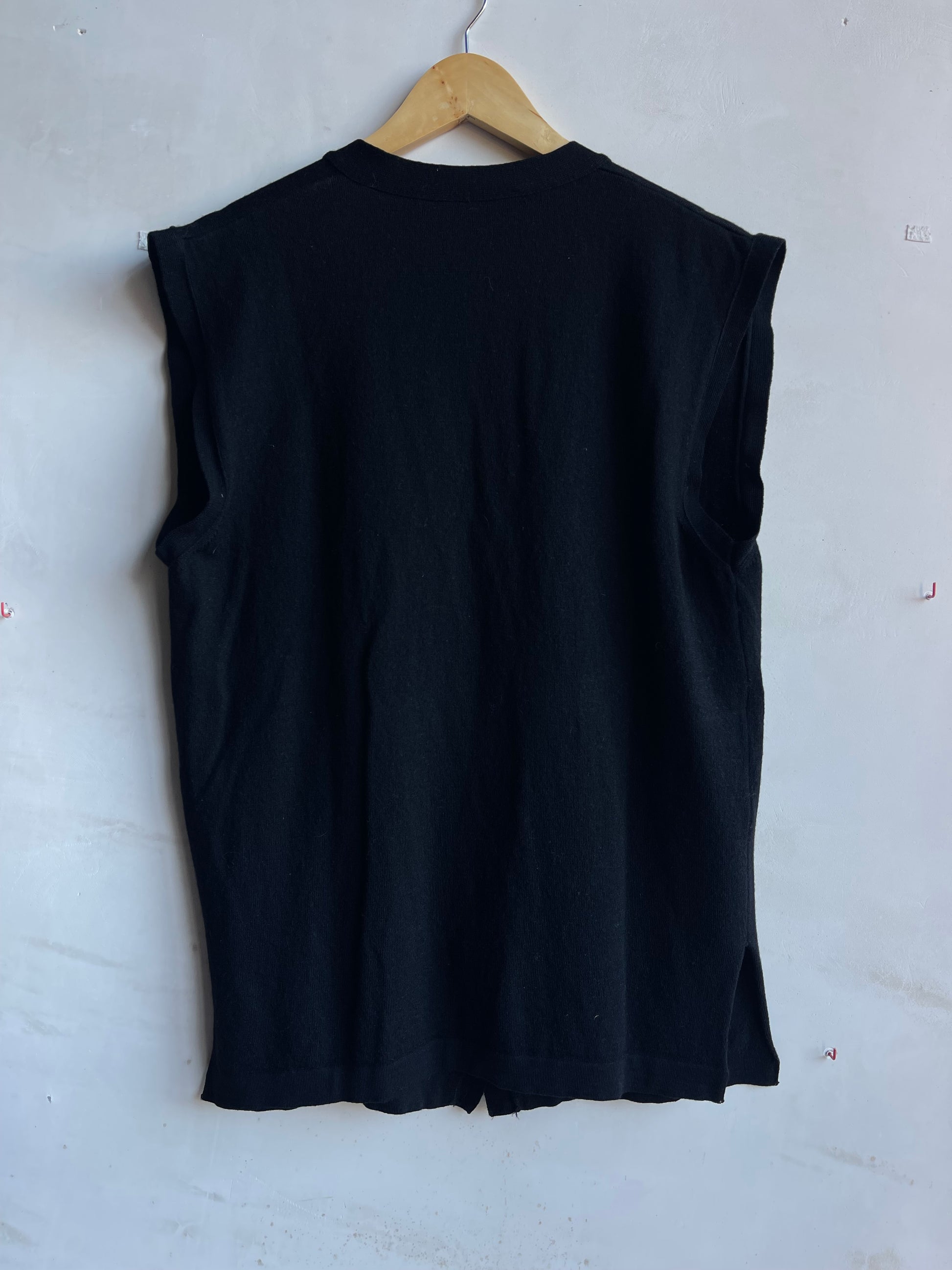 Gilet nero in maglia leggera, linea dritta e lunghezza sotto il fianco. L’etichetta della composizione non è presente ma sono sicura si tratti di lana.