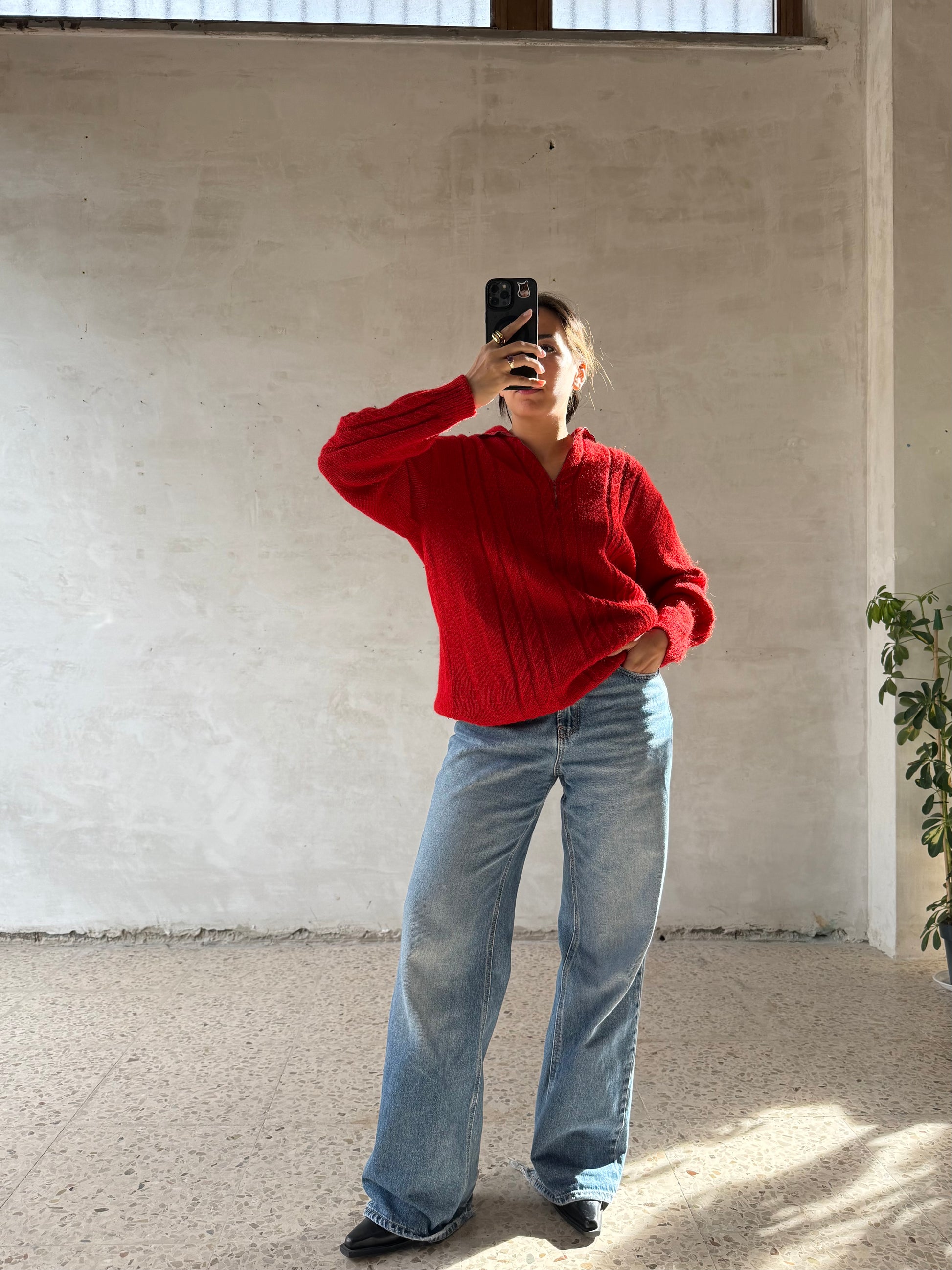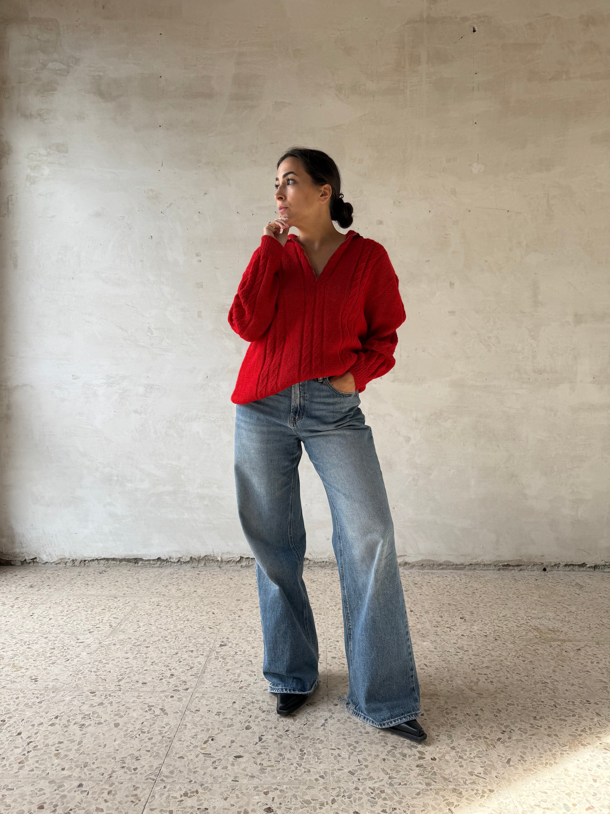 Maglione artigianale in lana rossa, lavorazione a trecce su tutta la superficie.